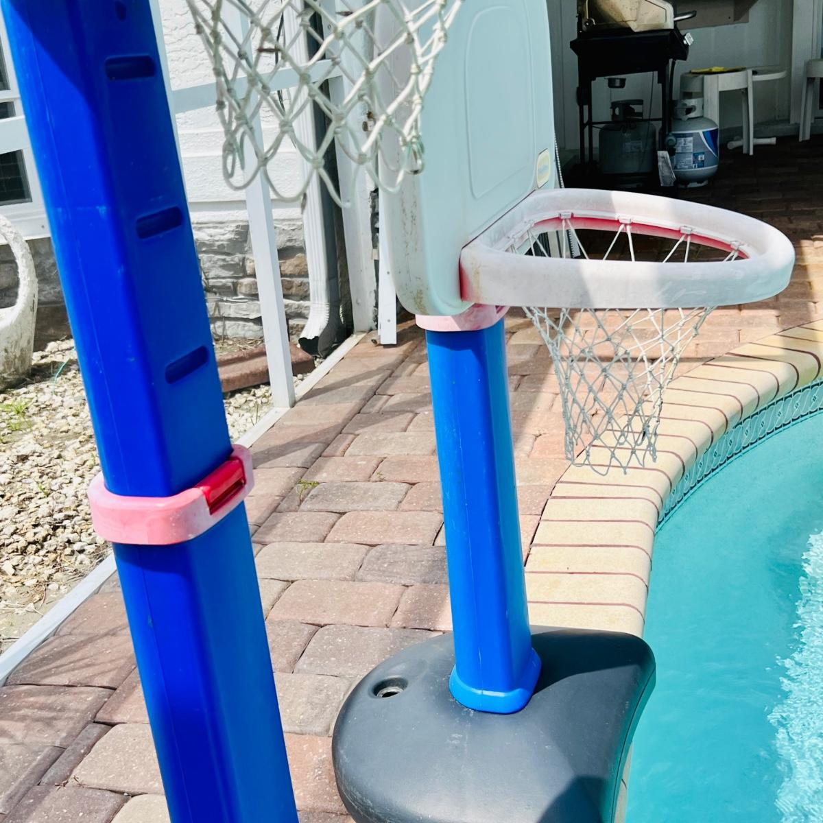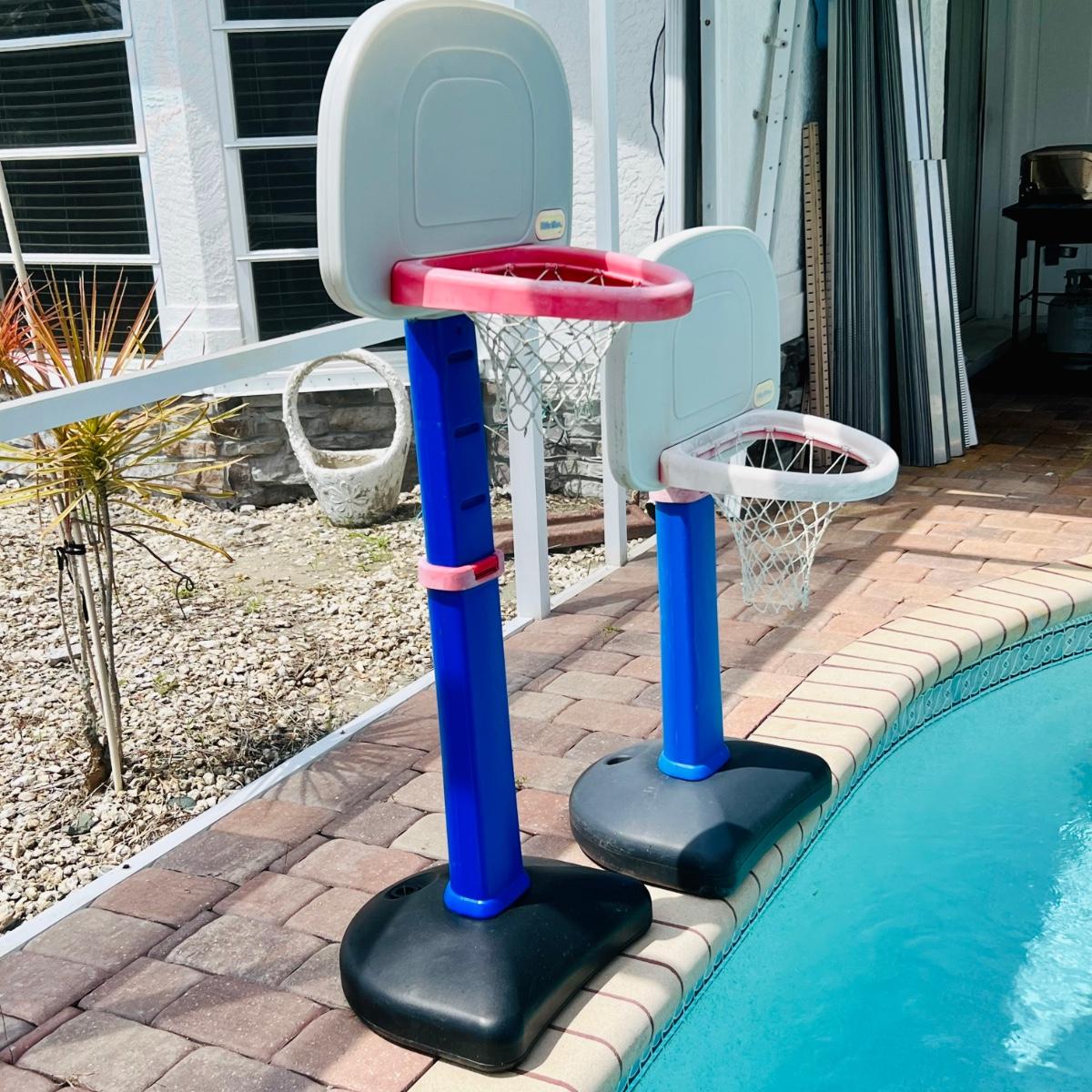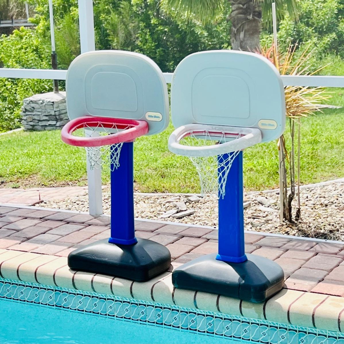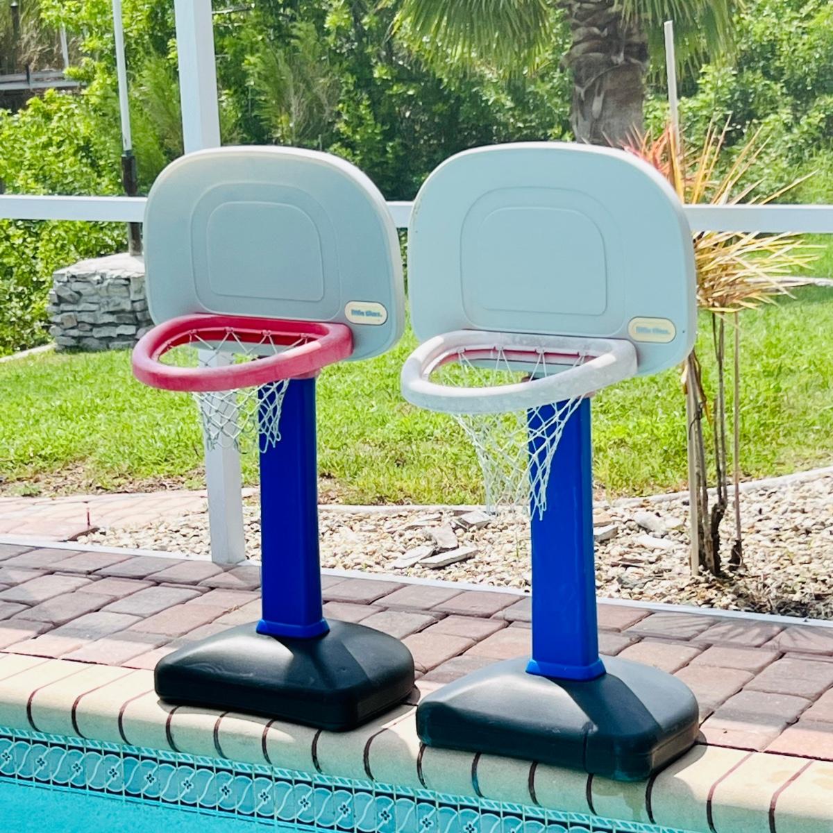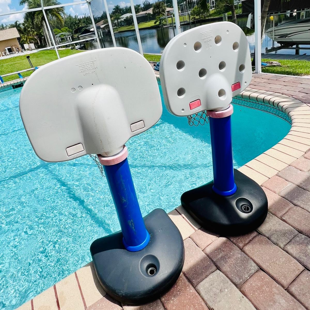 Two Little Tikes pool basketball hoops. One is missing piece to adjust height and lock in place and also screw top on base. Bases fill with water to weigh down. (L-JM)