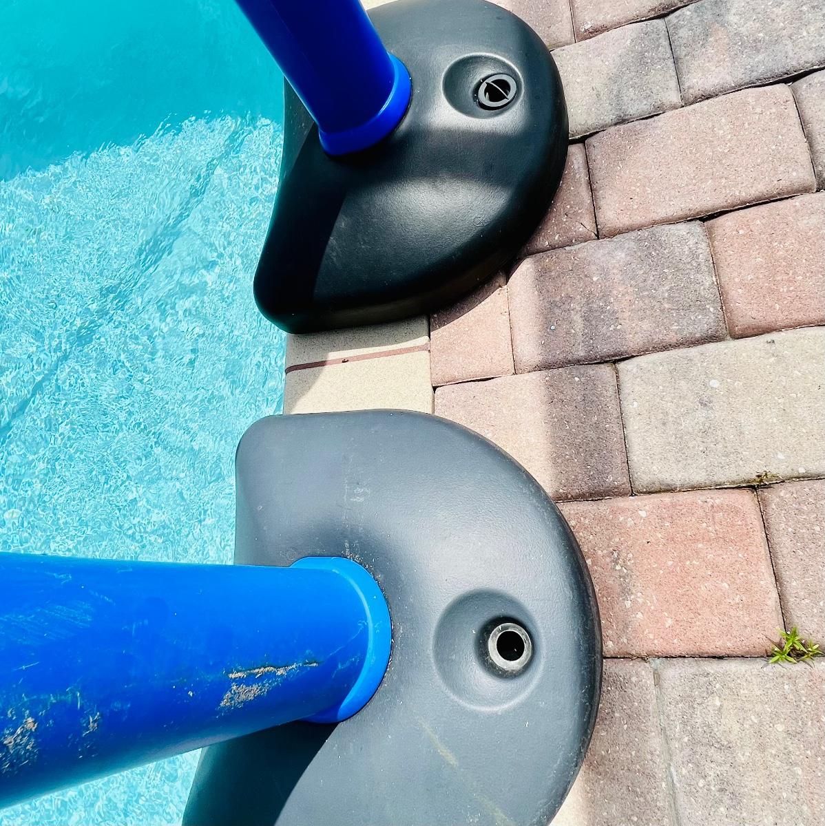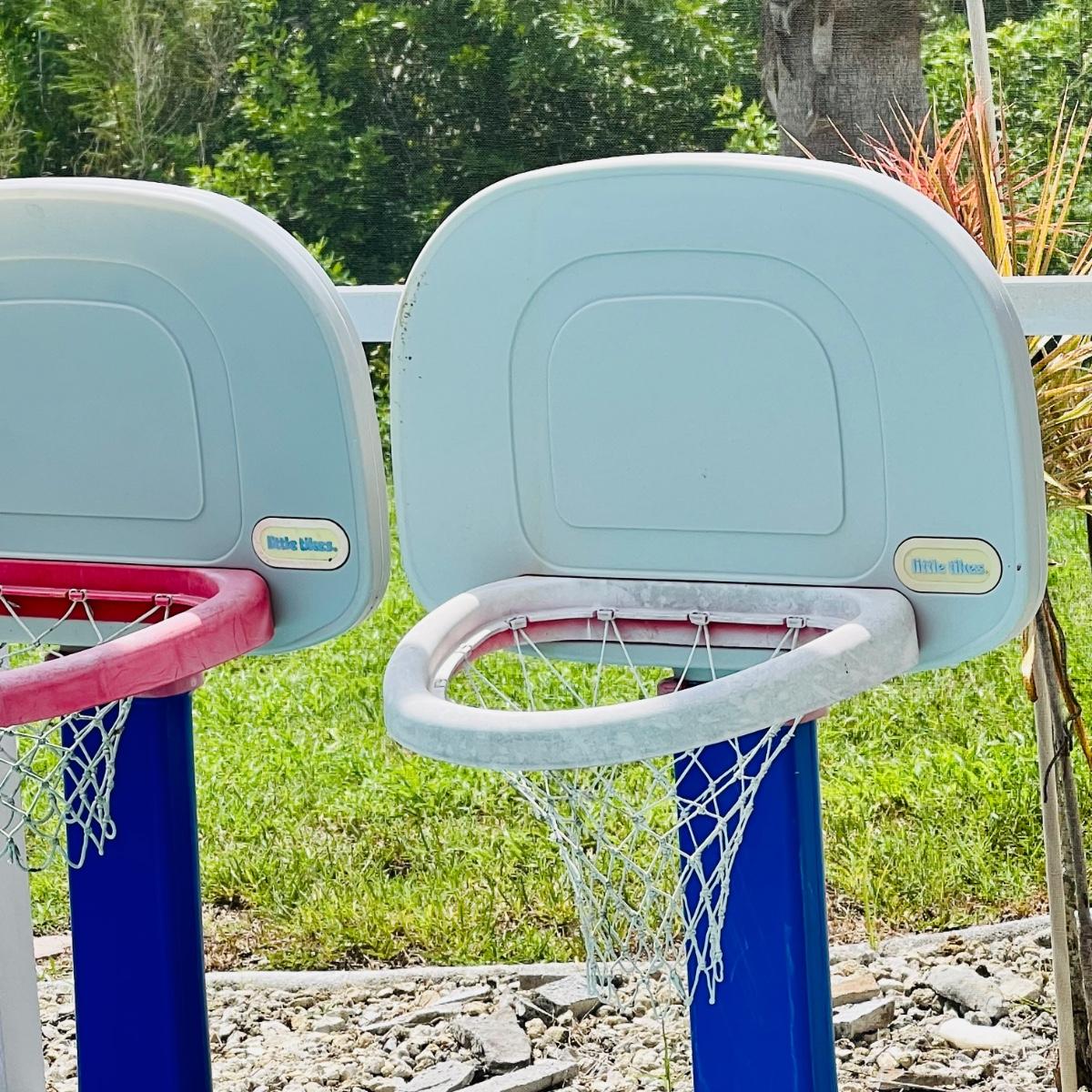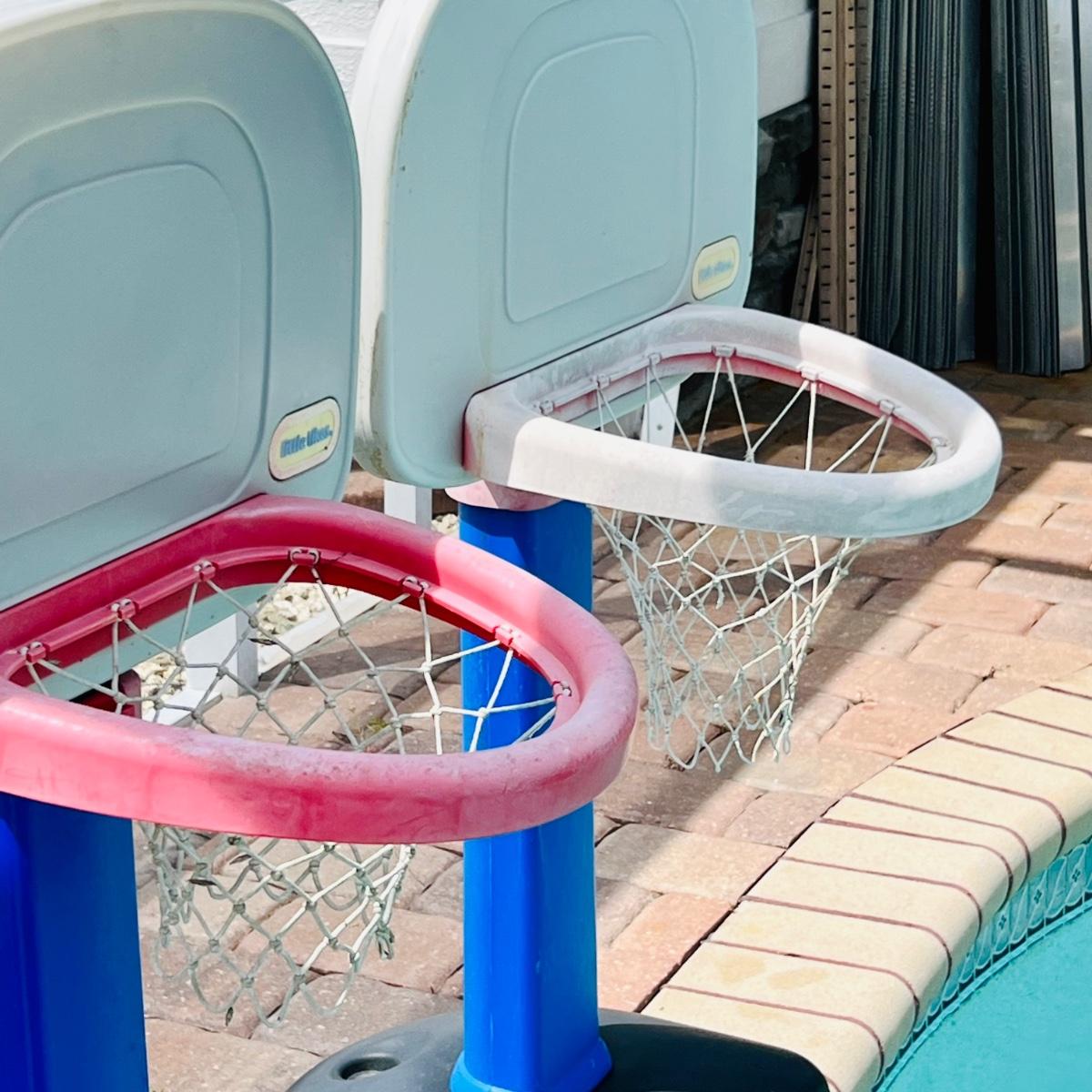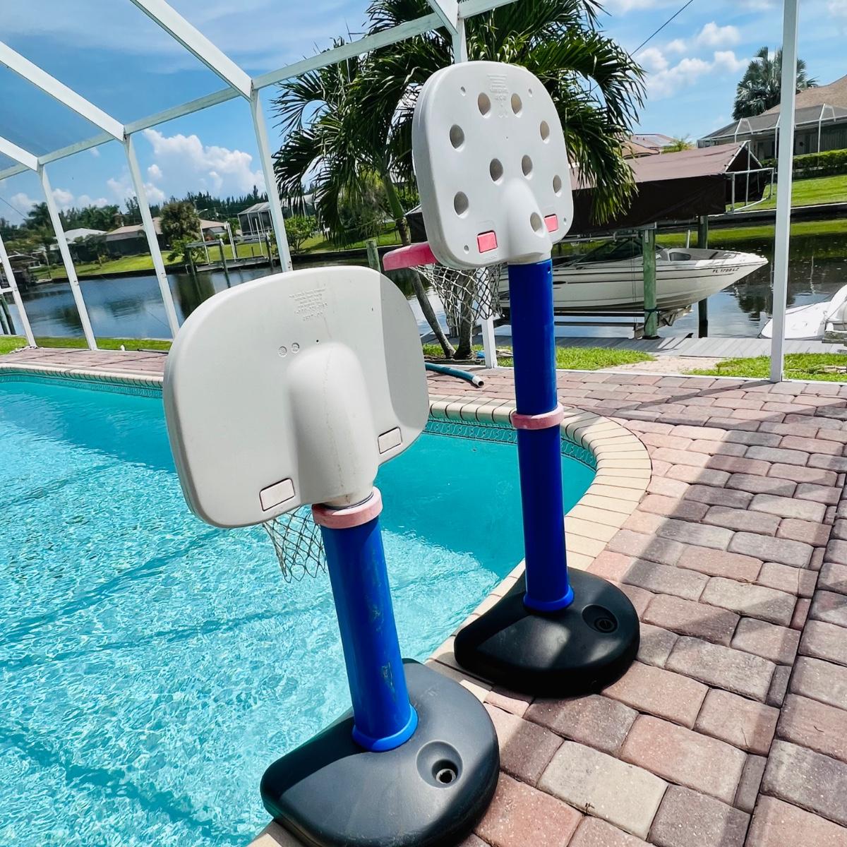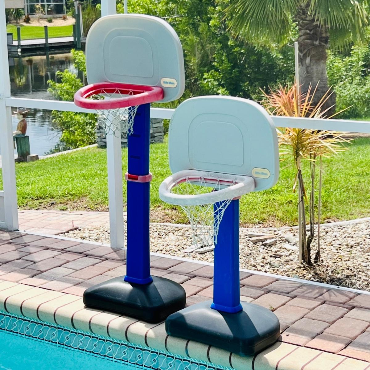 Two Little Tikes pool basketball hoops. One is missing piece to adjust height and lock in place and also screw top on base. Bases fill with water to weigh down. (L-JM)