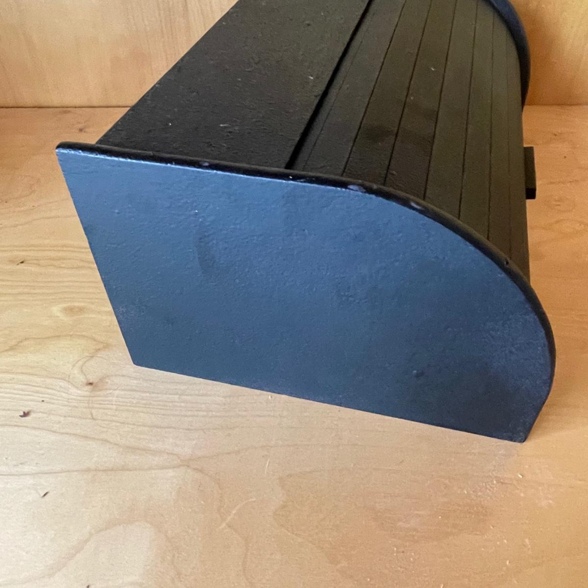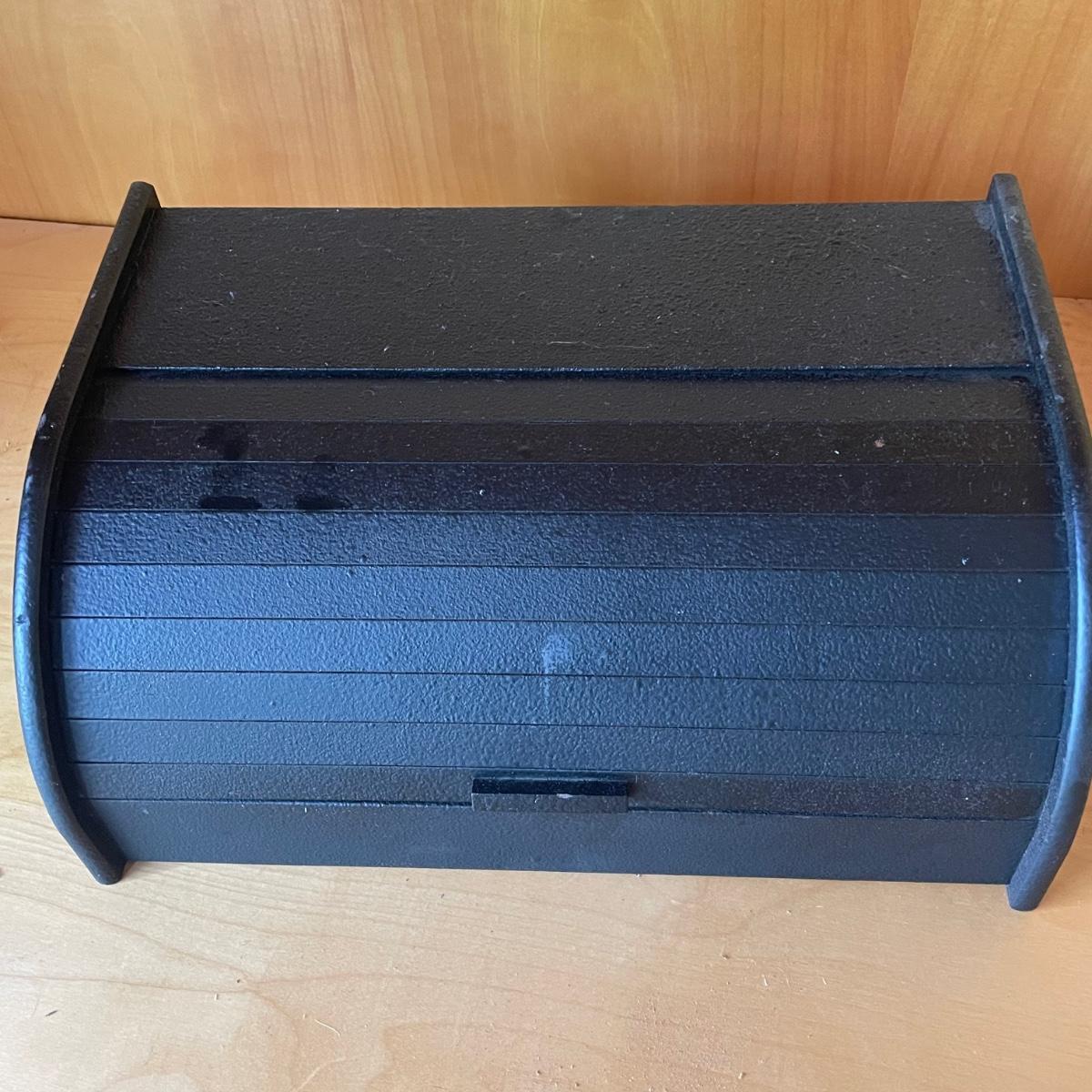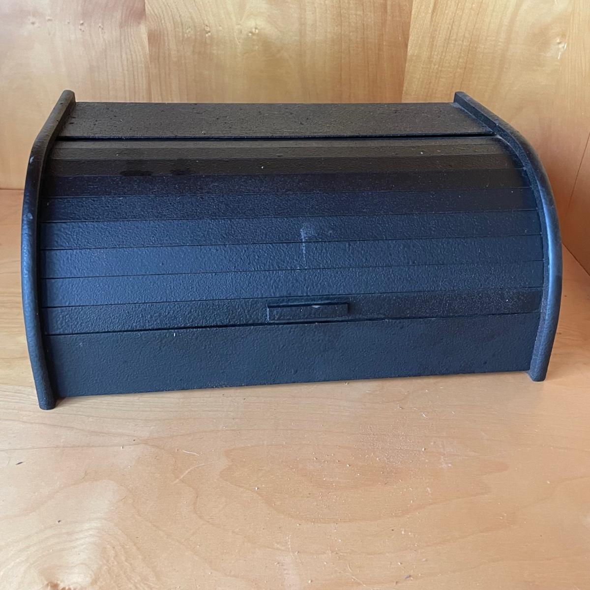 This black painted teak bread bin measures 16” wide x 10.5” deep x 7” high. The solid wood trash bin is 15” x 13” x 29”.