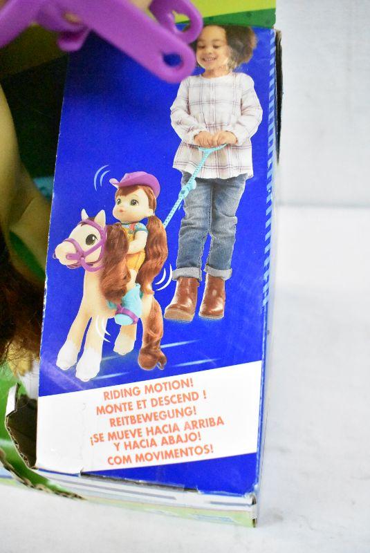 Littles by Baby Alive, Lil Pony Ride, Little Mandy Doll and Pony with Push-Stick, Accessories, Brown Hair. Damaged Box, Warehouse dirt