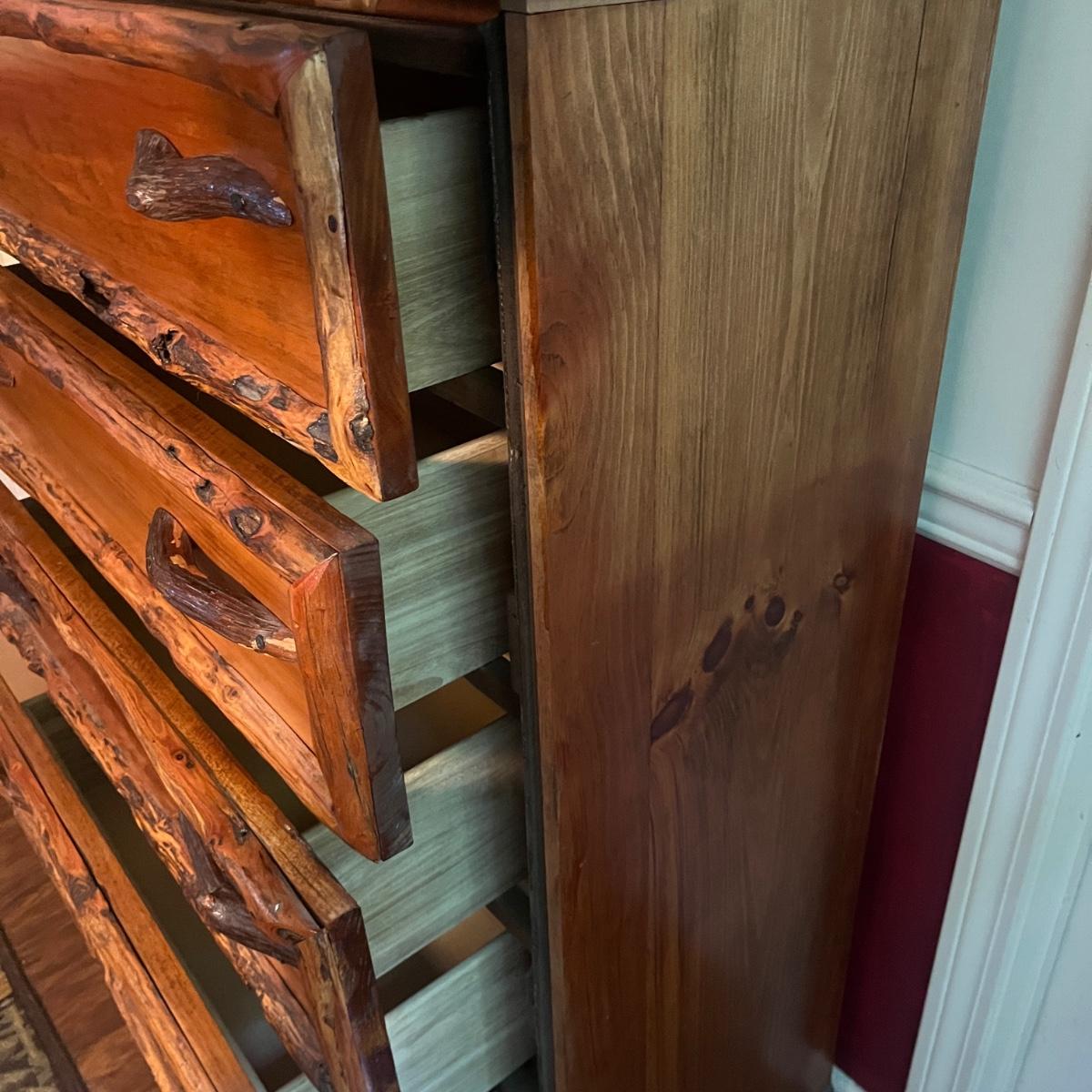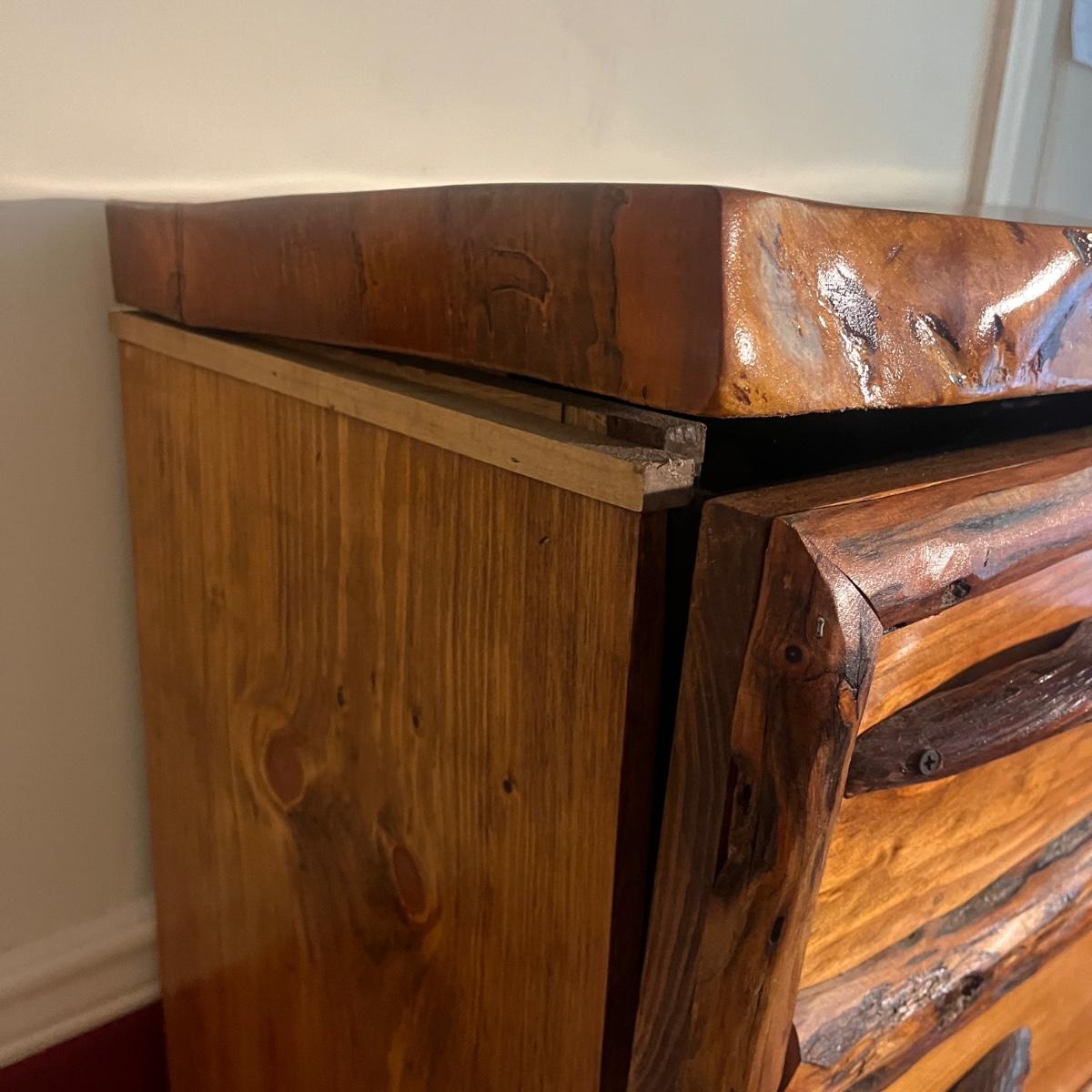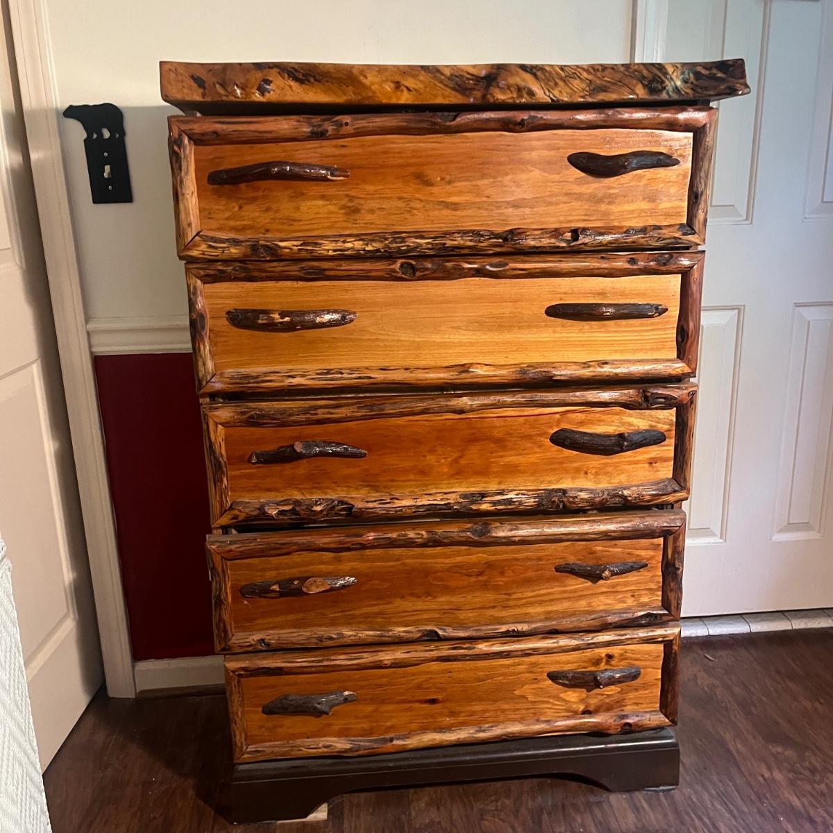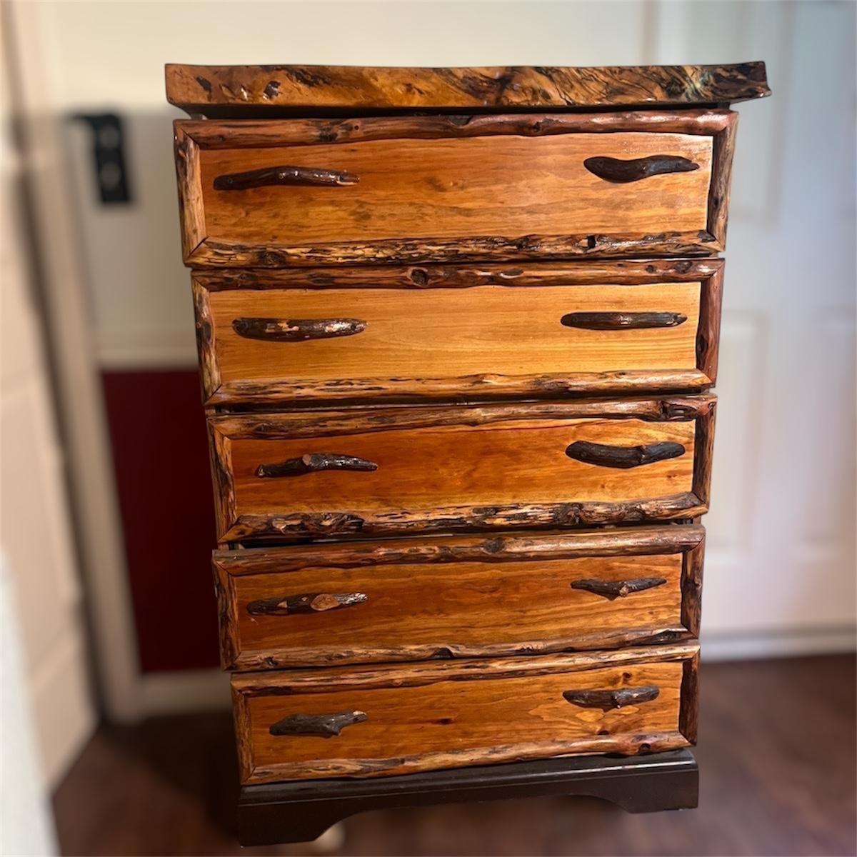 This live edge chest of drawers has five drawers and measures 34” x 19” x 51”H. Drawers have branch style pulls. The top is warping in places and the bottom has started to come apart, see pictures. This chest of drawers matches other pieces in auction.