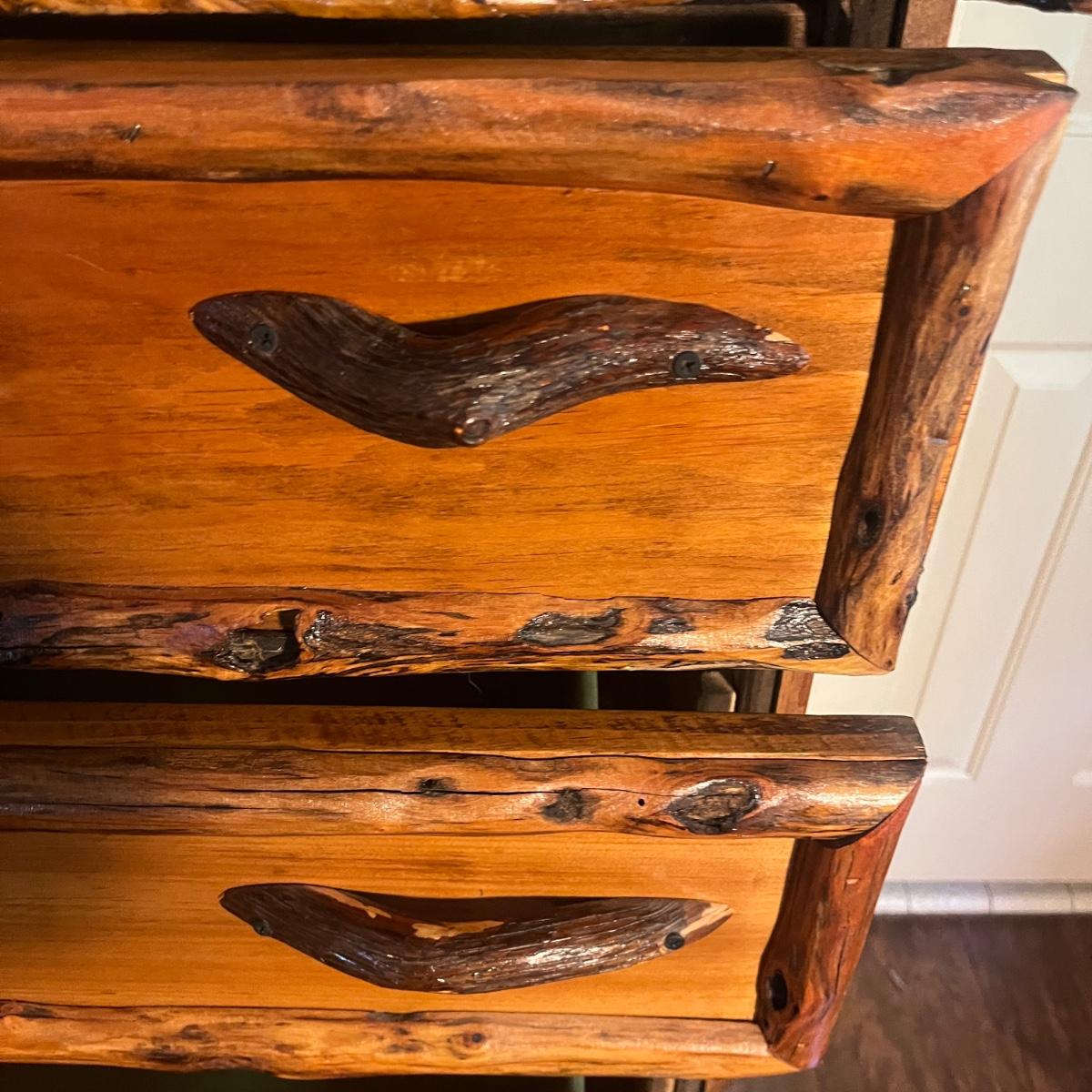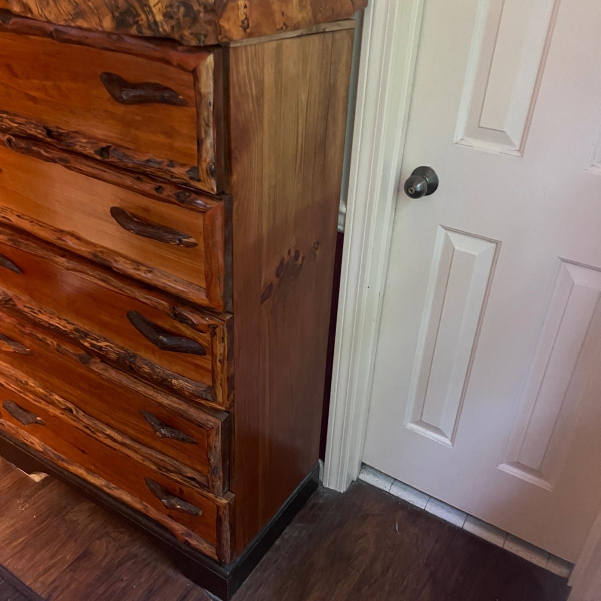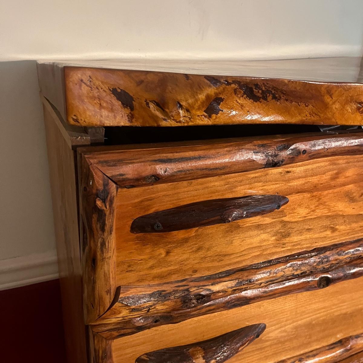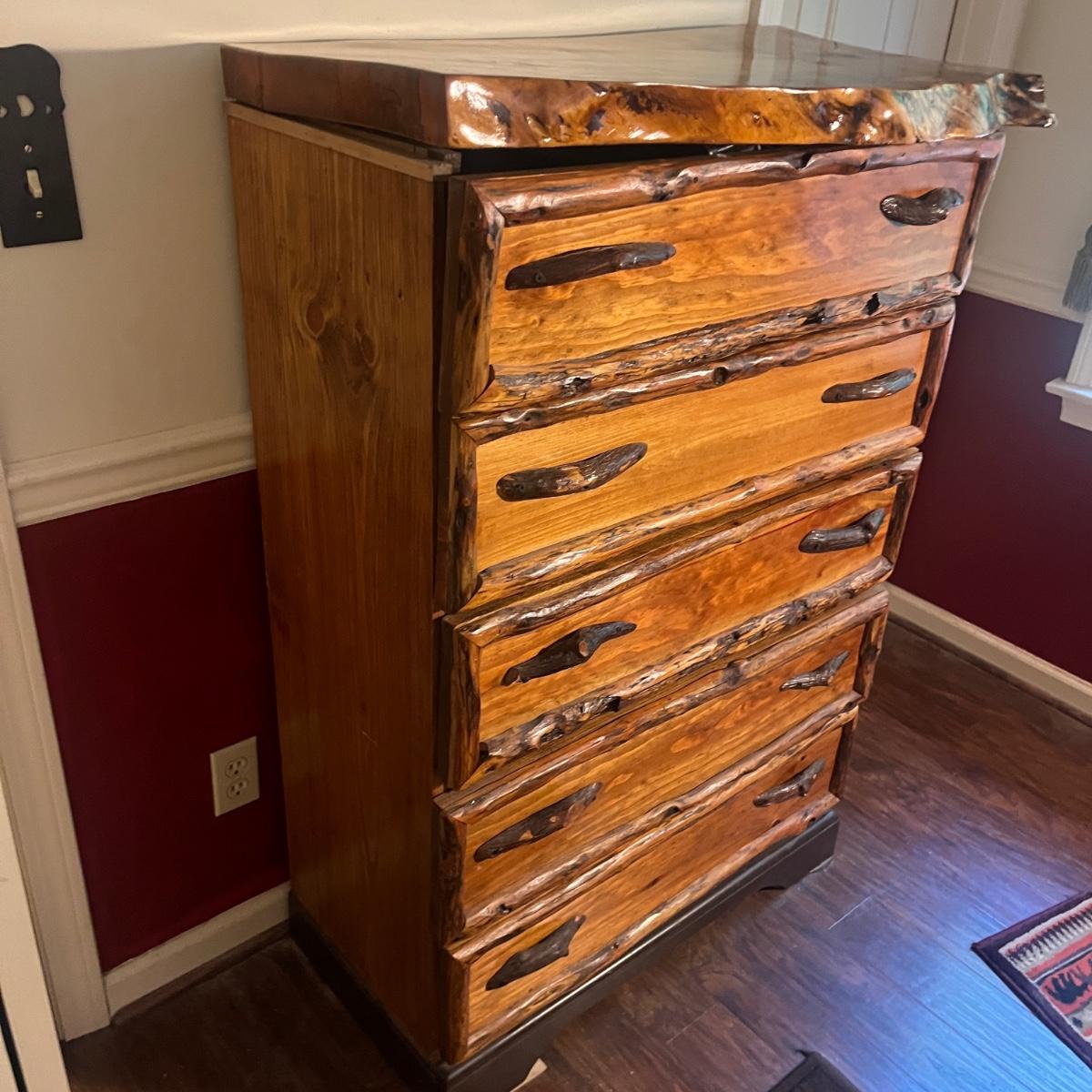 This live edge chest of drawers has five drawers and measures 34” x 19” x 51”H. Drawers have branch style pulls. The top is warping in places and the bottom has started to come apart, see pictures. This chest of drawers matches other pieces in auction.