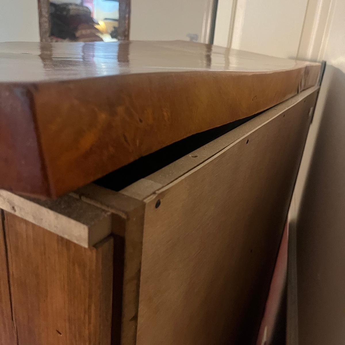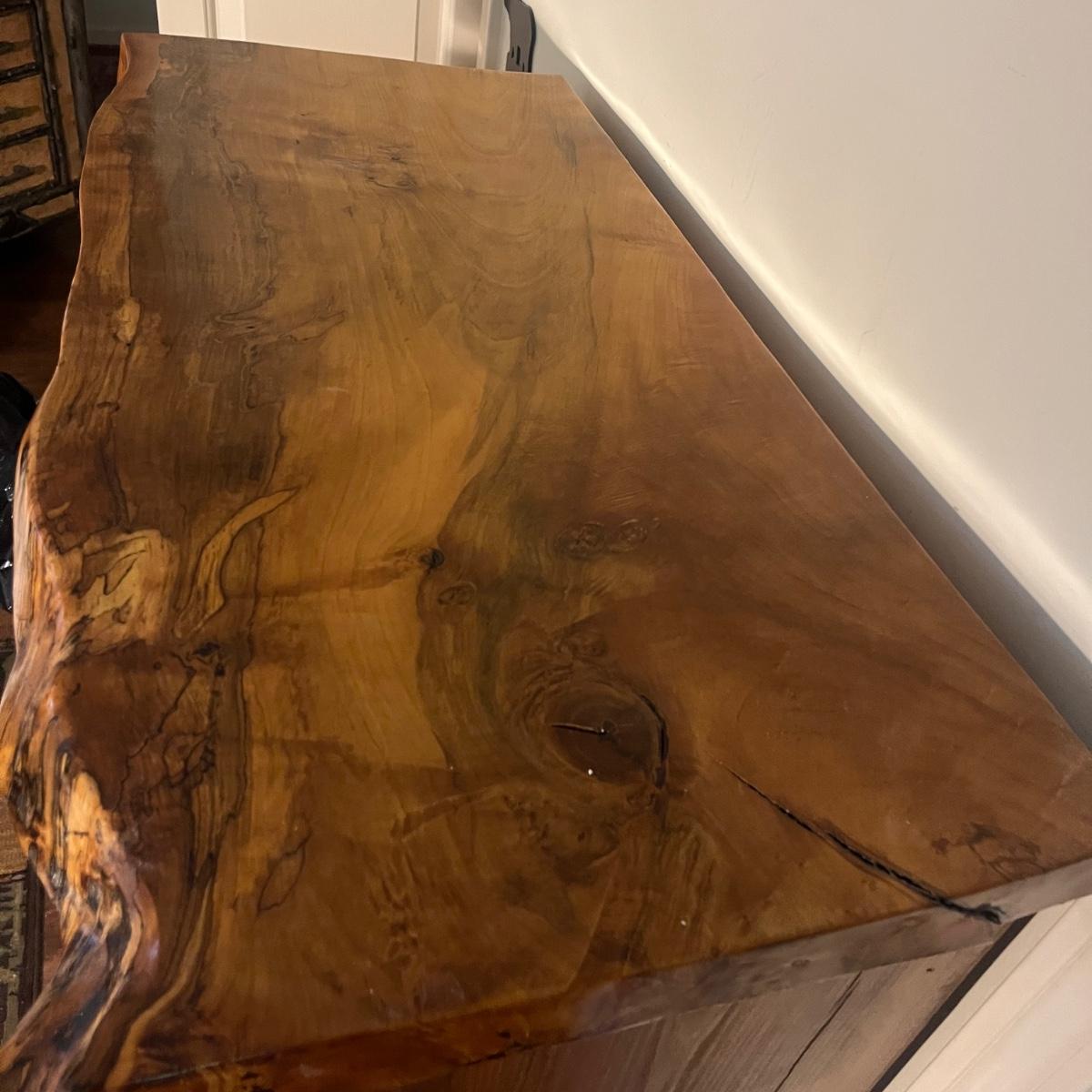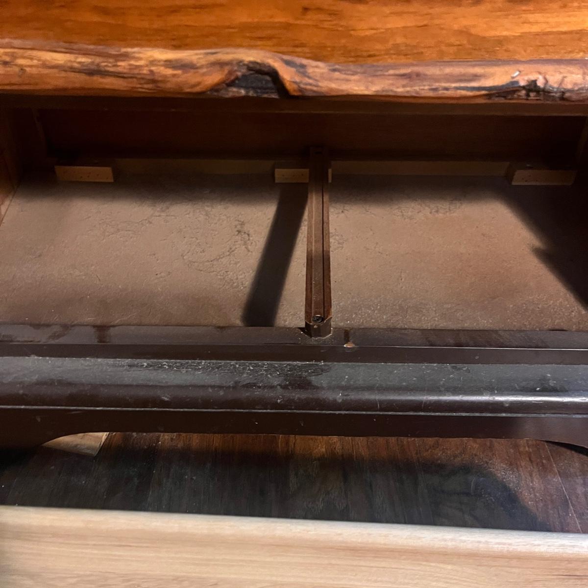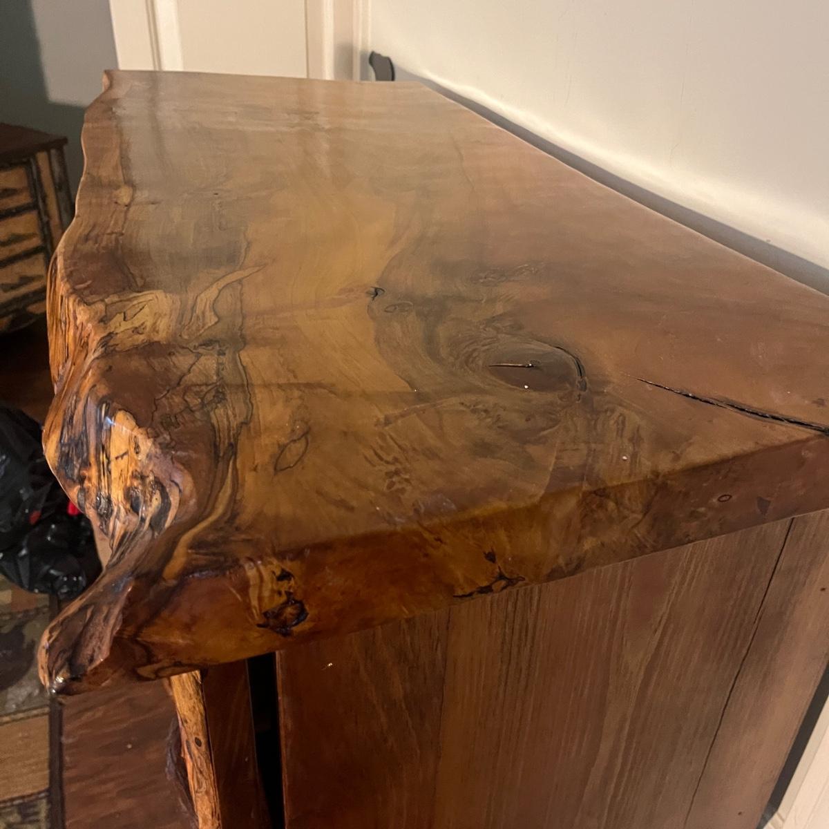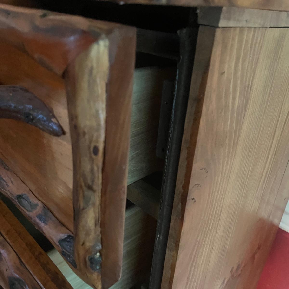 This live edge chest of drawers has five drawers and measures 34” x 19” x 51”H. Drawers have branch style pulls. The top is warping in places and the bottom has started to come apart, see pictures. This chest of drawers matches other pieces in auction.