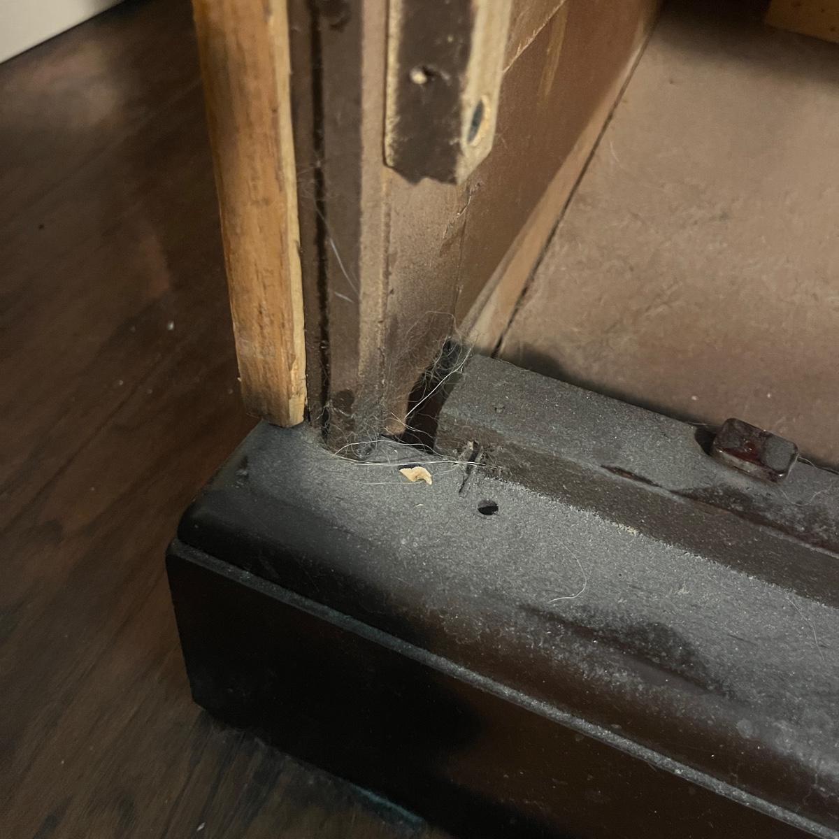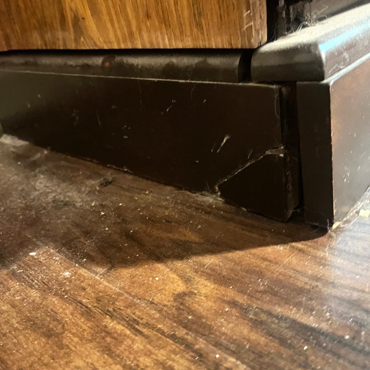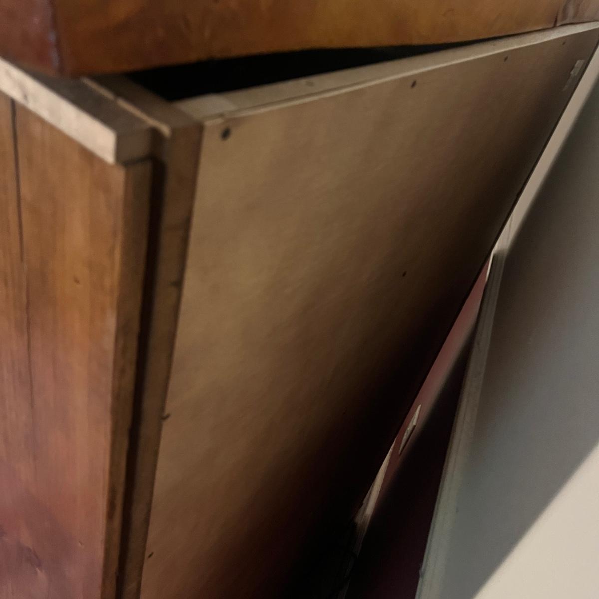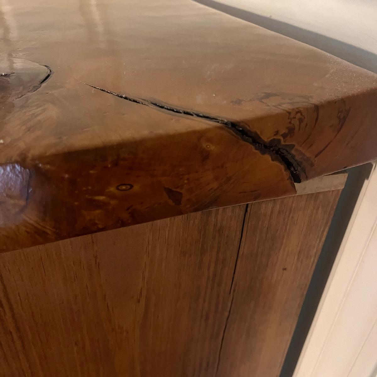 This live edge chest of drawers has five drawers and measures 34” x 19” x 51”H. Drawers have branch style pulls. The top is warping in places and the bottom has started to come apart, see pictures. This chest of drawers matches other pieces in auction.