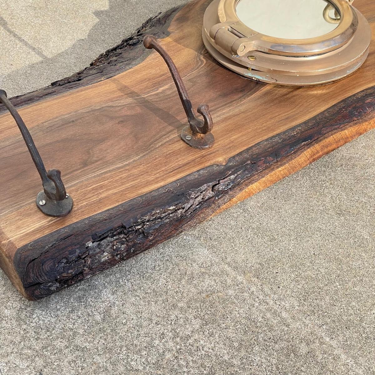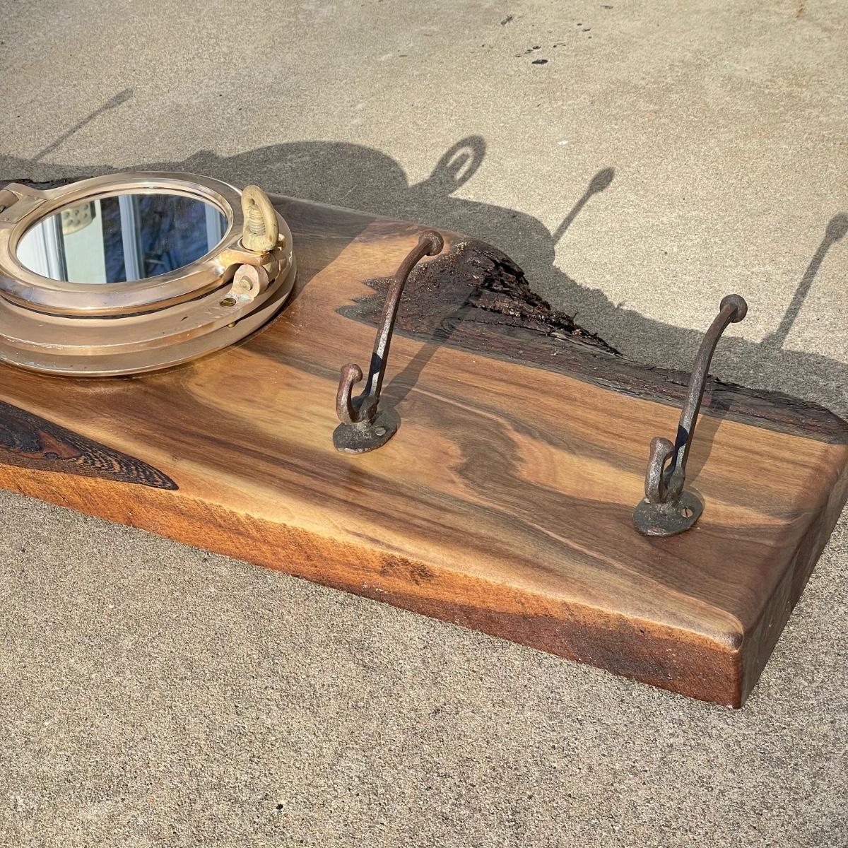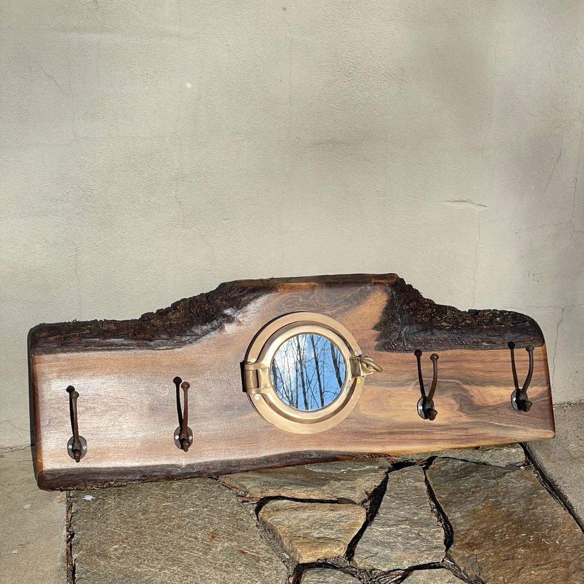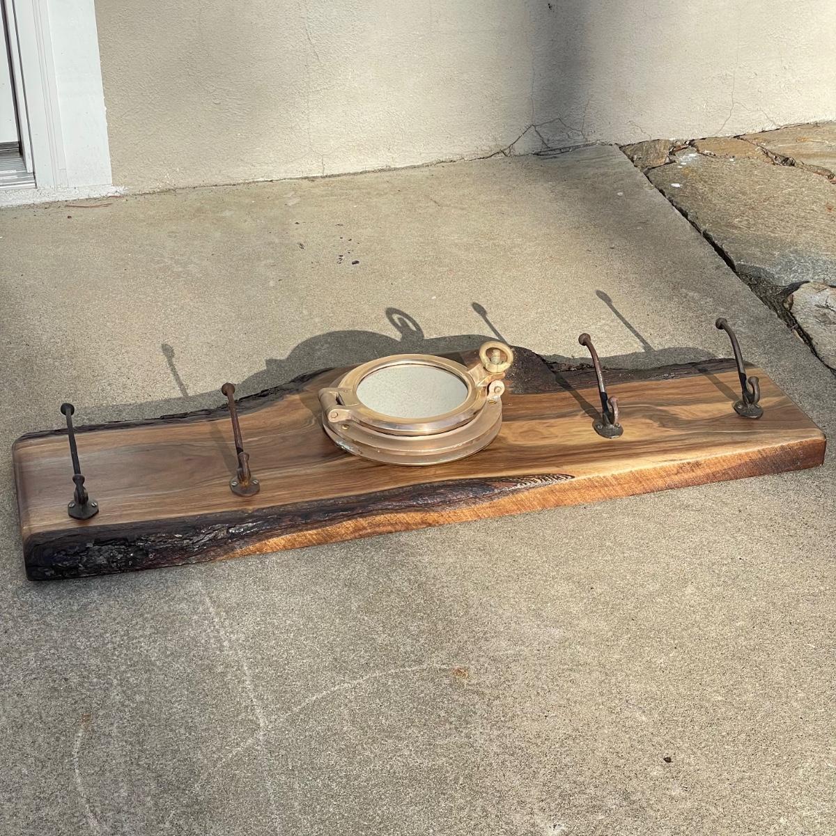 Stunning hand crafted live edge hook with mirrored port hole window. Piece is very heavy and will need to be anchored well into a wall. The mirror is an upcycled port hole window and the piece has four cast iron hooks. This piece measures 41” x 14.5”, the hooks reach out about 5”. See images. Local pick up only.