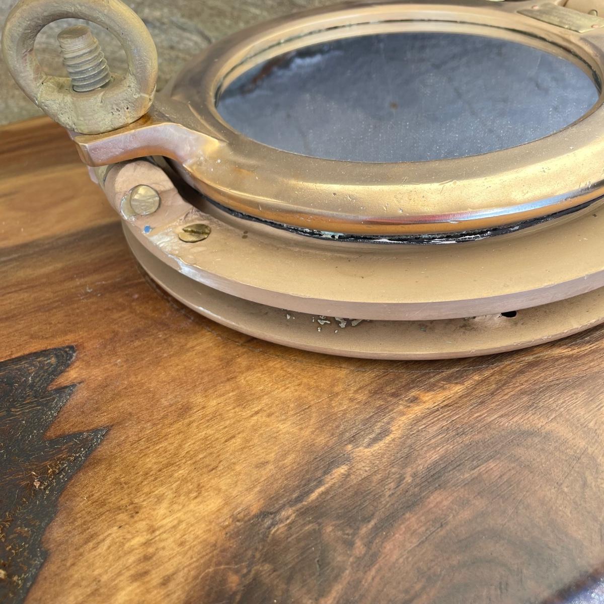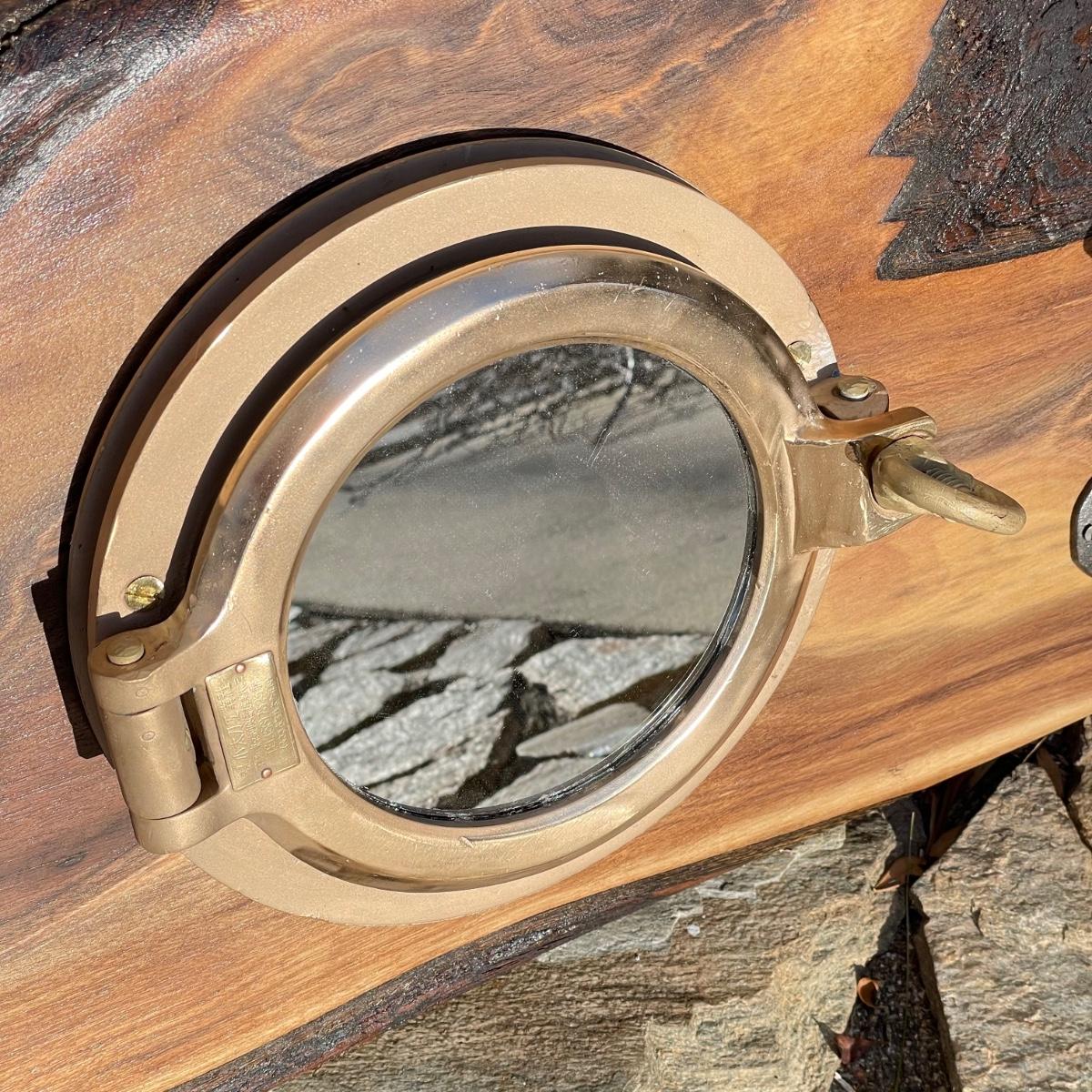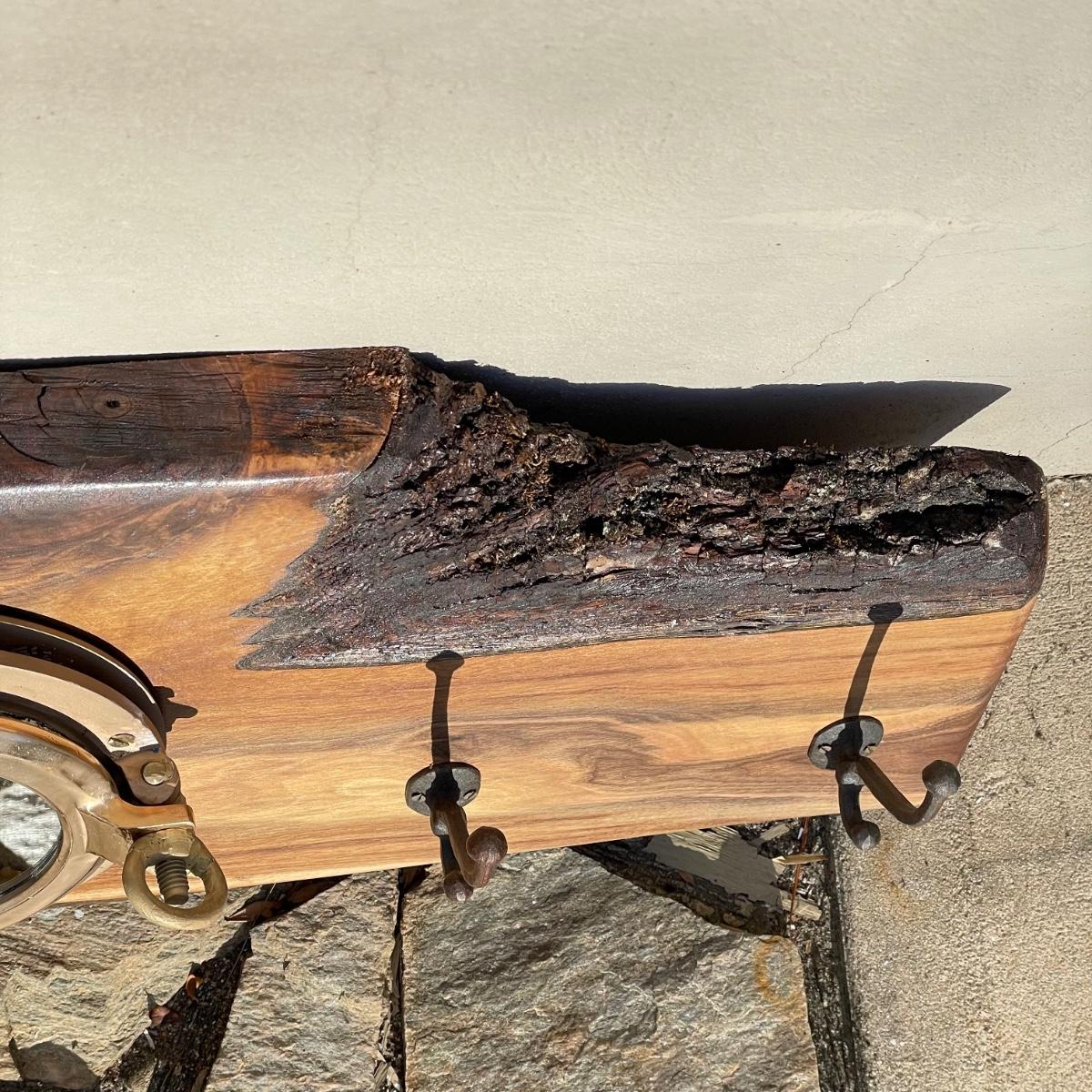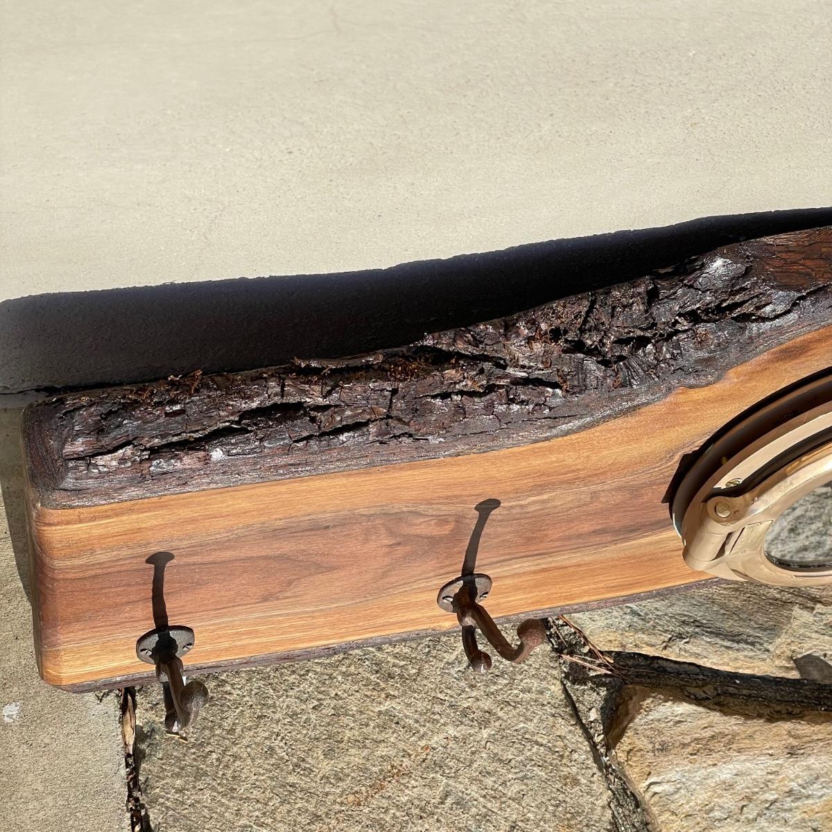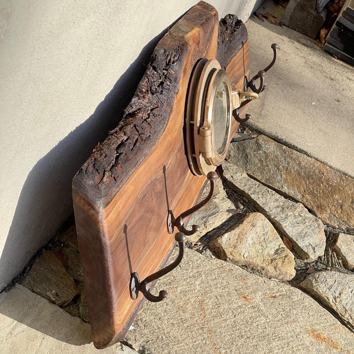 Stunning hand crafted live edge hook with mirrored port hole window. Piece is very heavy and will need to be anchored well into a wall. The mirror is an upcycled port hole window and the piece has four cast iron hooks. This piece measures 41” x 14.5”, the hooks reach out about 5”. See images. Local pick up only.