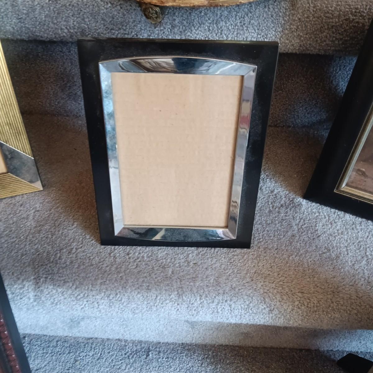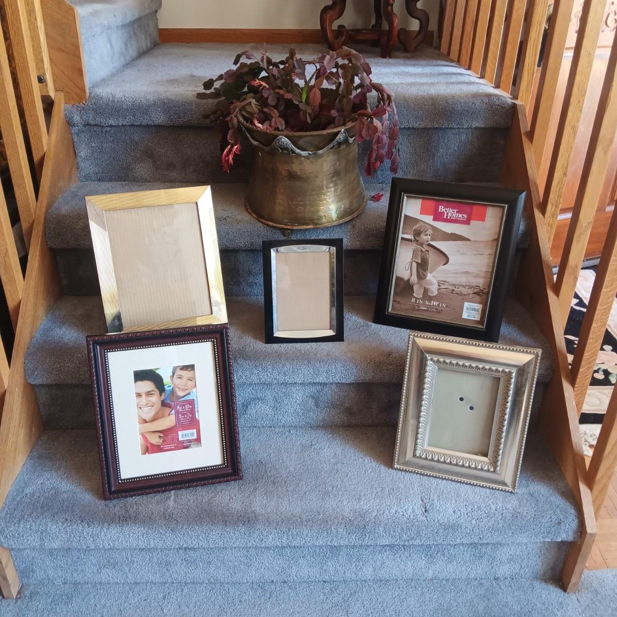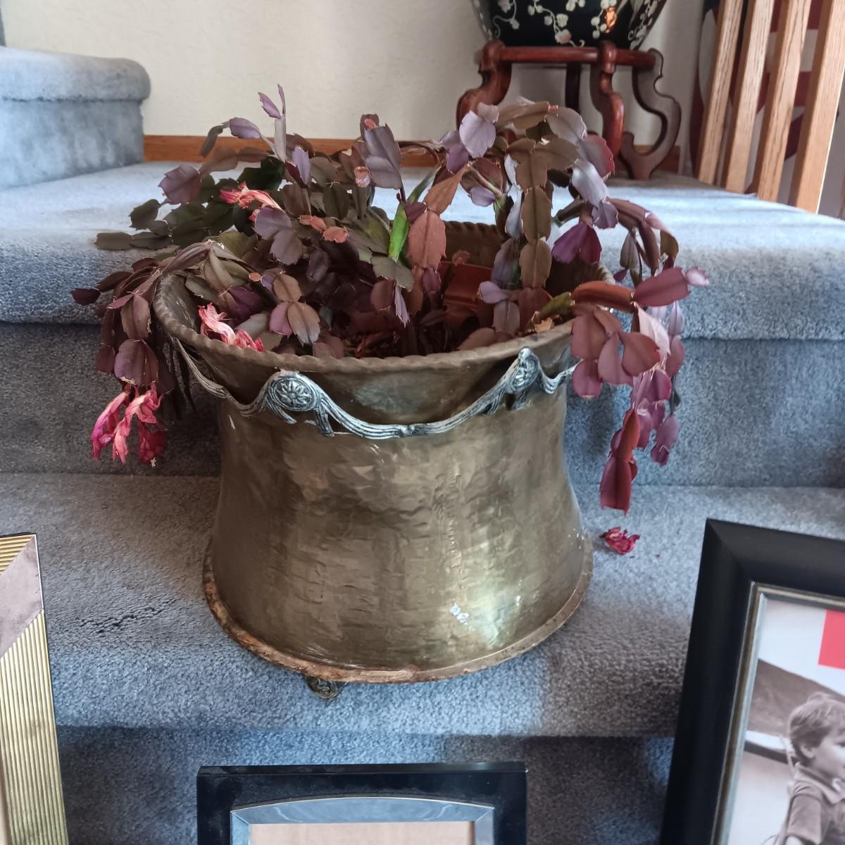 LIVE PLANT IN A HEAVY BRASS POT AND PICTURE FRAMES