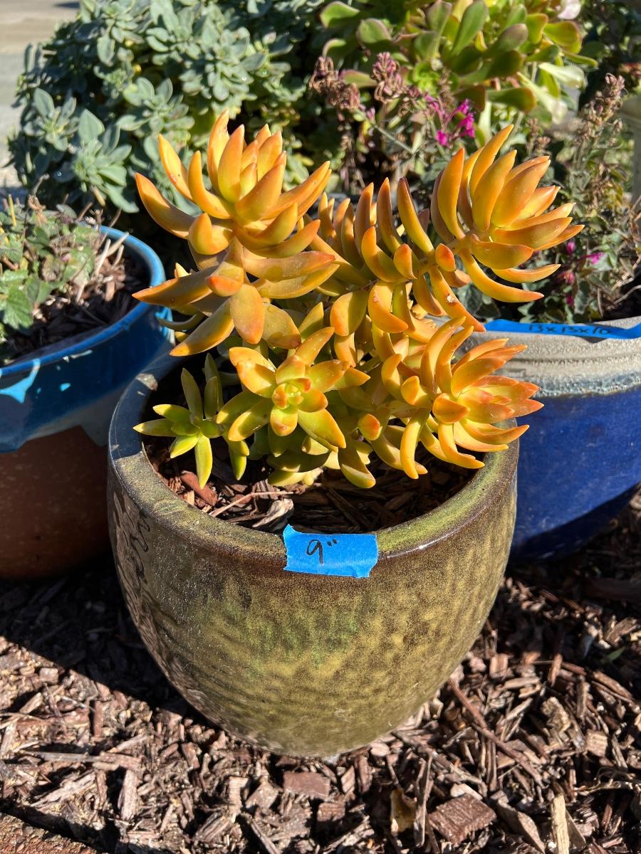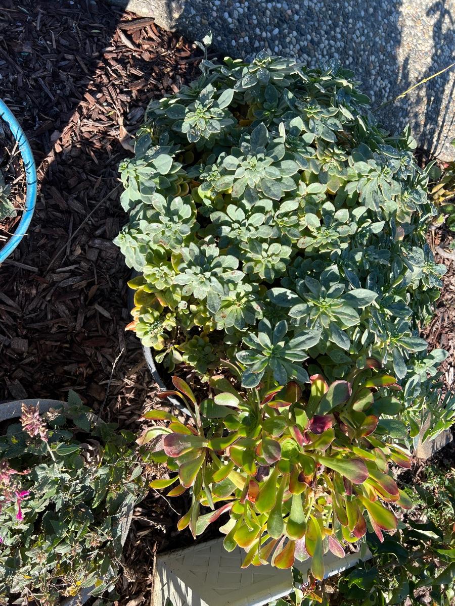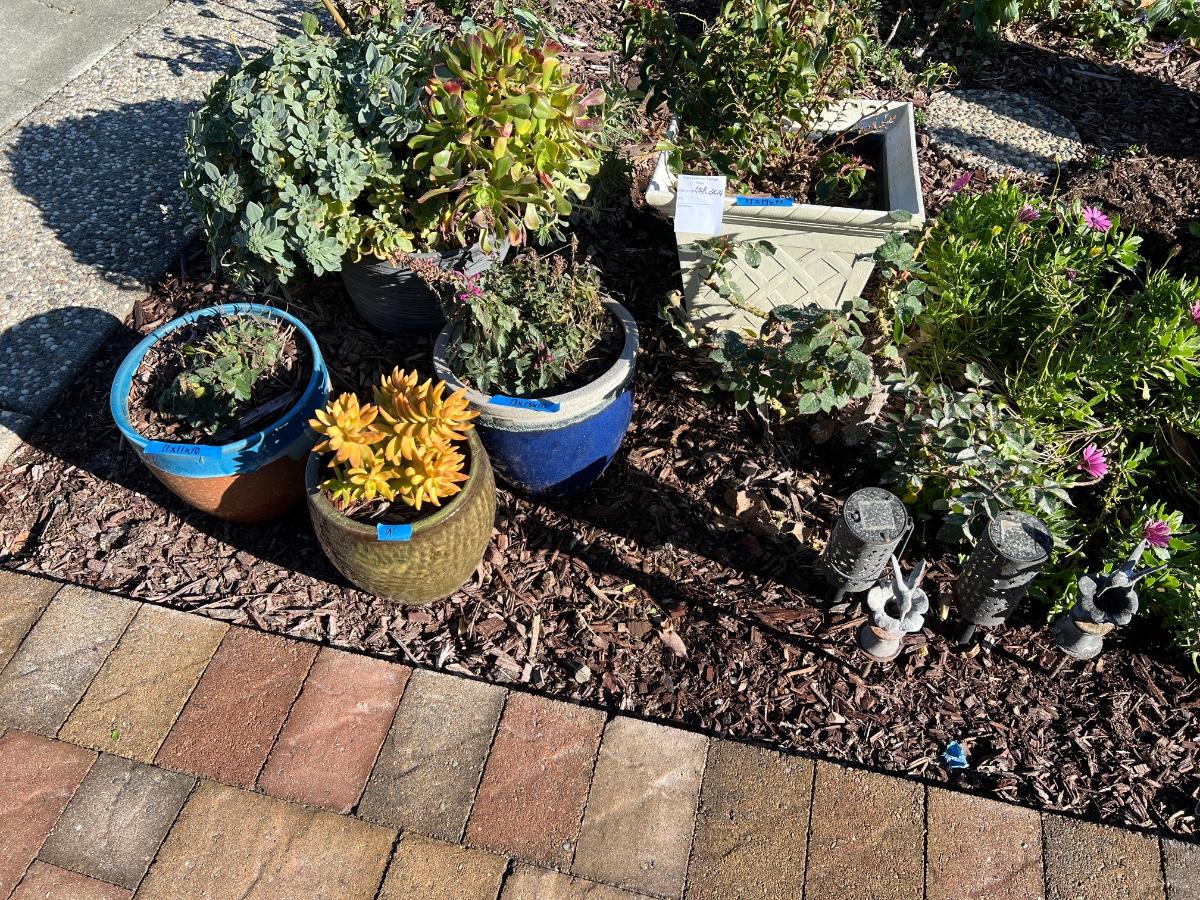Live succulents and bougainvillea in plastic and glazed ceramic pots