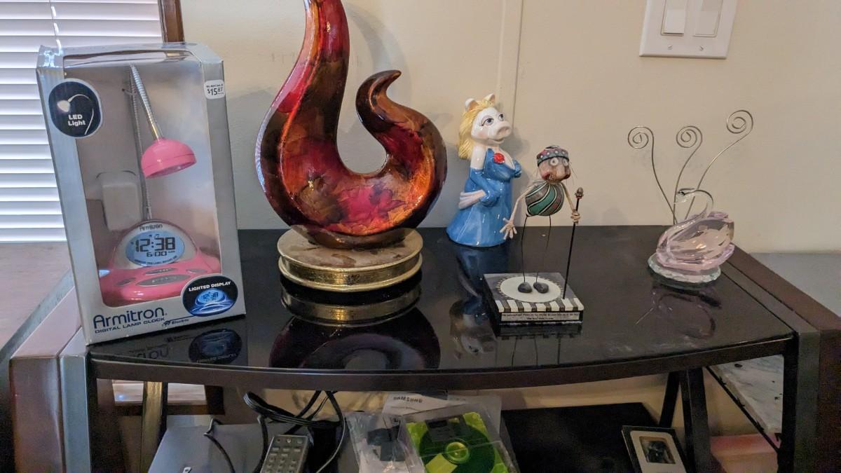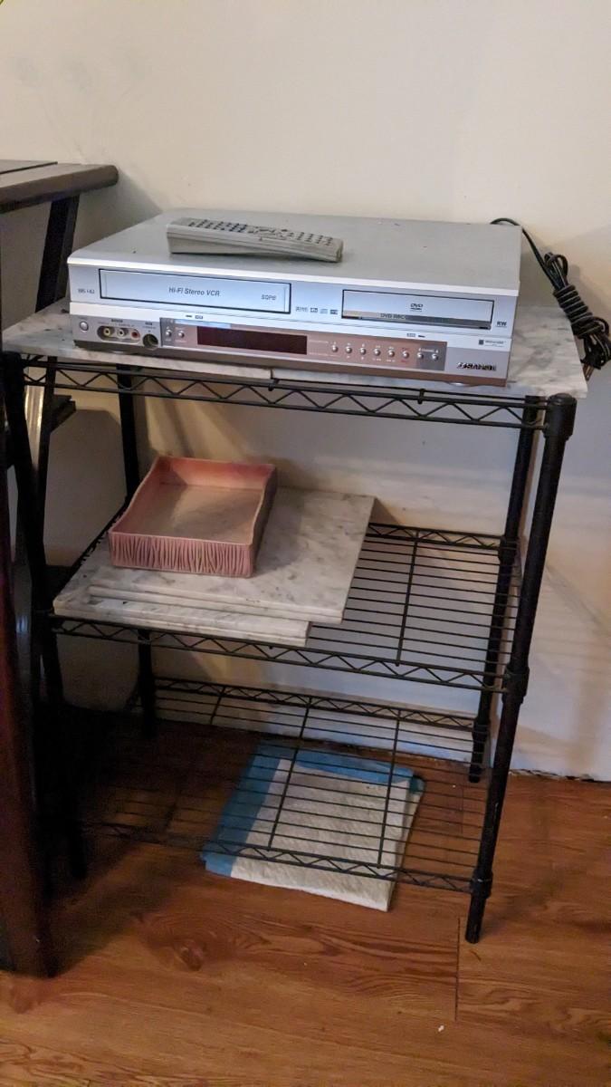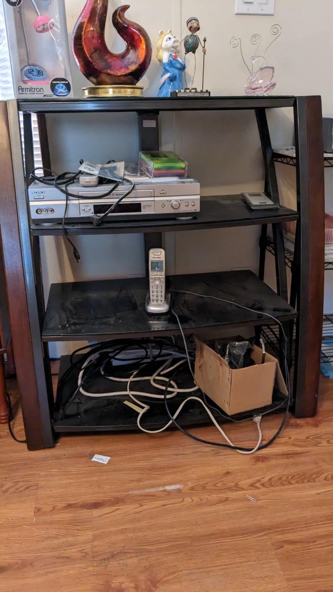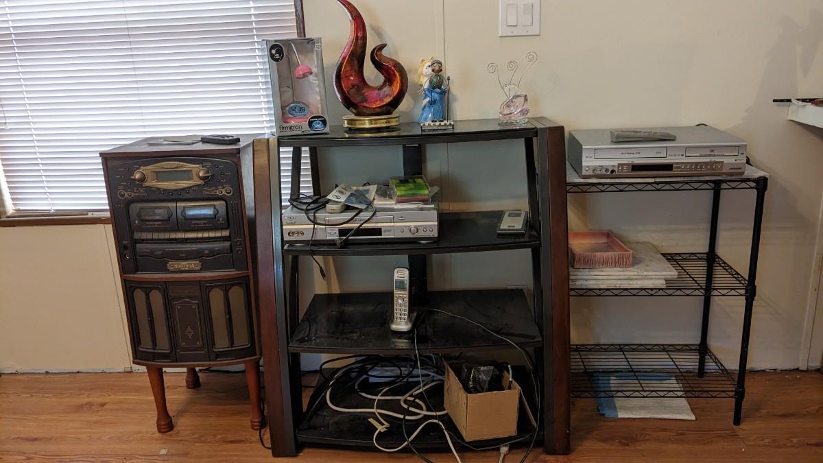 includes Teac Nostalgia tri system that is not fully functional, with remote, 33.75"x 19"x 36" tempered glass quadruple shelf with Sony SLV-N750 VCR with remote, operable. As well as, Sansui VRDVD-4405 DVD/VCR with remote, untested. Also includes varied household items such as brand new clock/lamp combo, a very pretty flame figure, hypercolor 3.5 floppy disks, cordless phone, and 2 flip phones. Also includes 23"x13"x29.75" metro rack with 6 marble tiles. No shipping. winning bidder responsible for removal of all items. livingroom