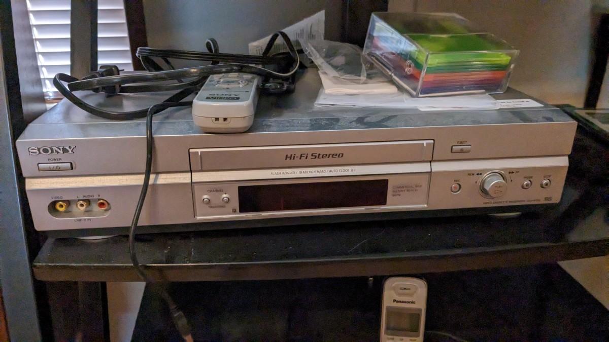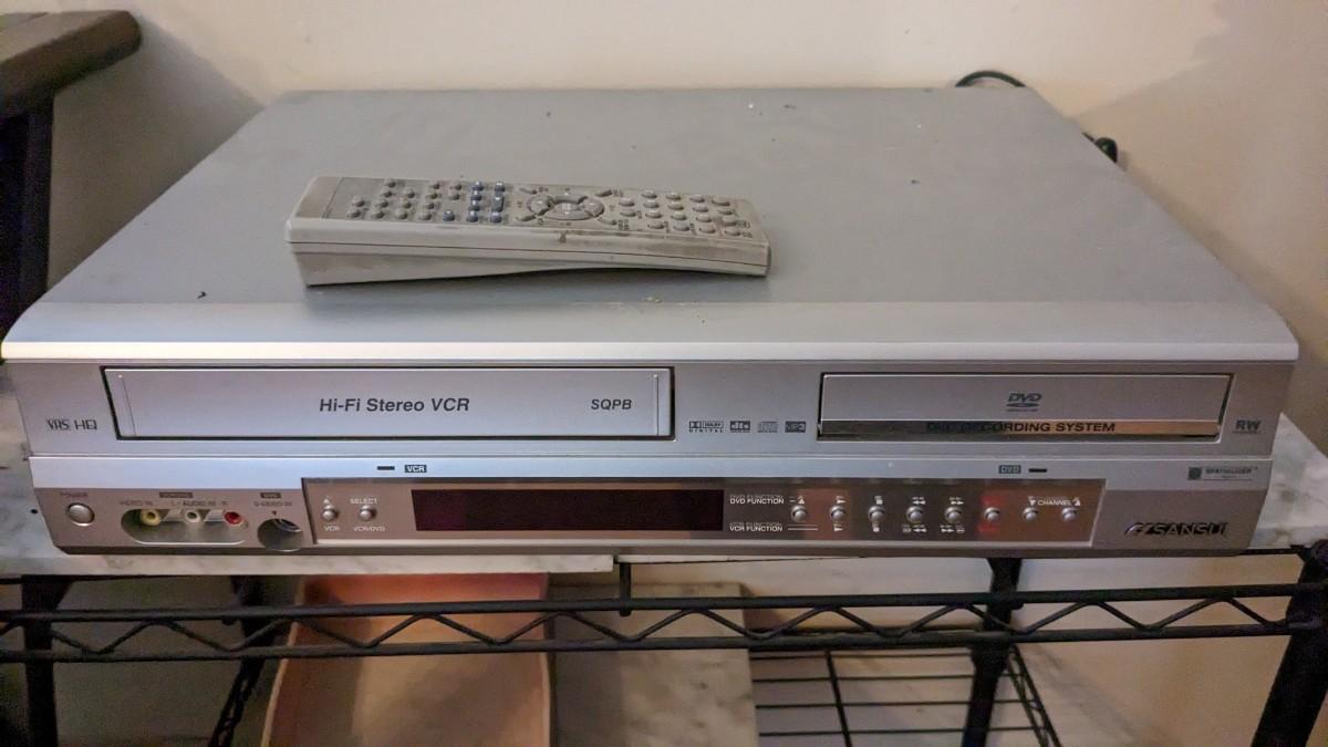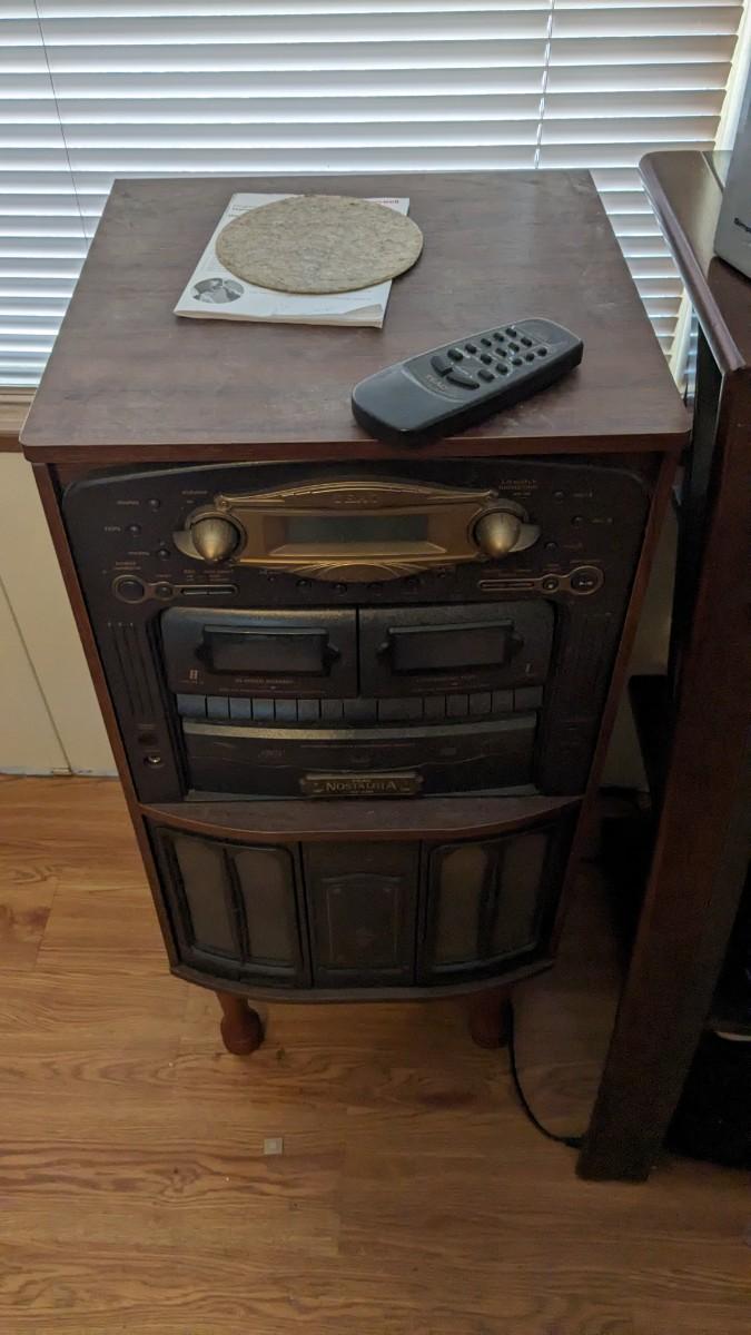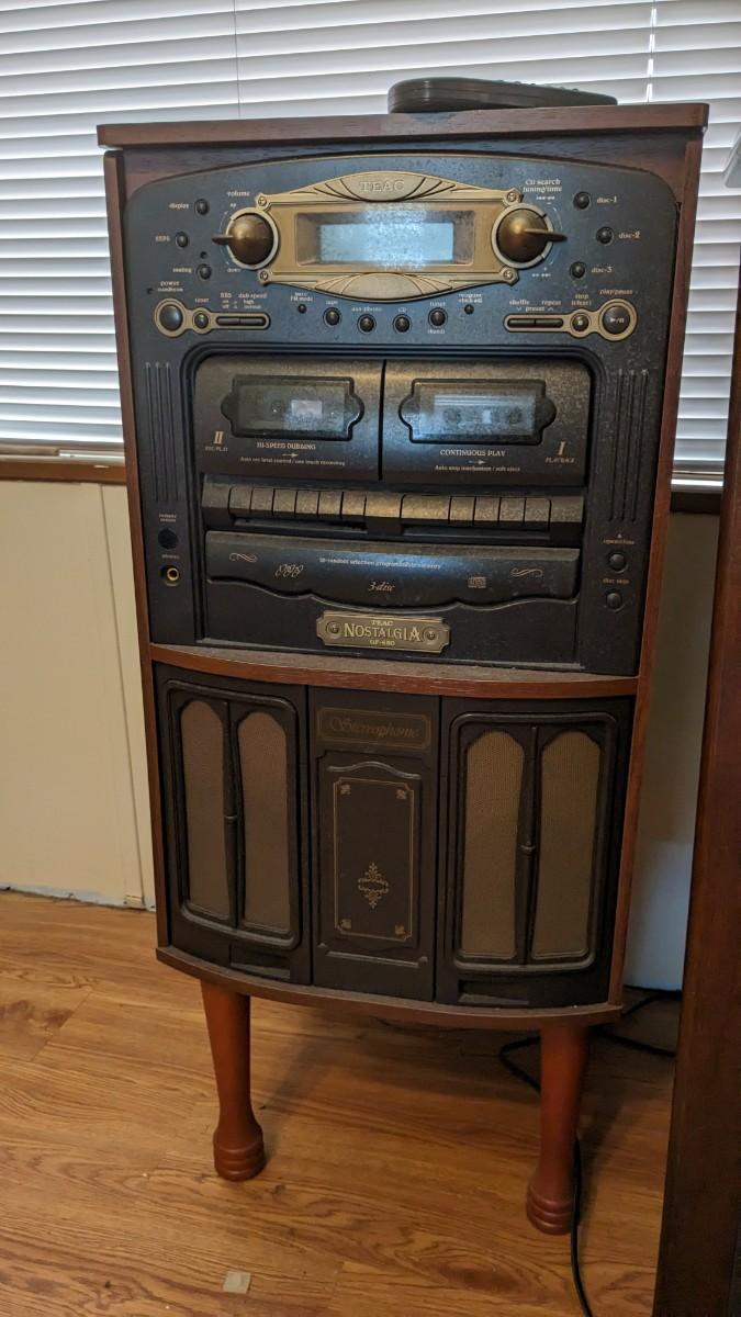 includes Teac Nostalgia tri system that is not fully functional, with remote, 33.75"x 19"x 36" tempered glass quadruple shelf with Sony SLV-N750 VCR with remote, operable. As well as, Sansui VRDVD-4405 DVD/VCR with remote, untested. Also includes varied household items such as brand new clock/lamp combo, a very pretty flame figure, hypercolor 3.5 floppy disks, cordless phone, and 2 flip phones. Also includes 23"x13"x29.75" metro rack with 6 marble tiles. No shipping. winning bidder responsible for removal of all items. livingroom