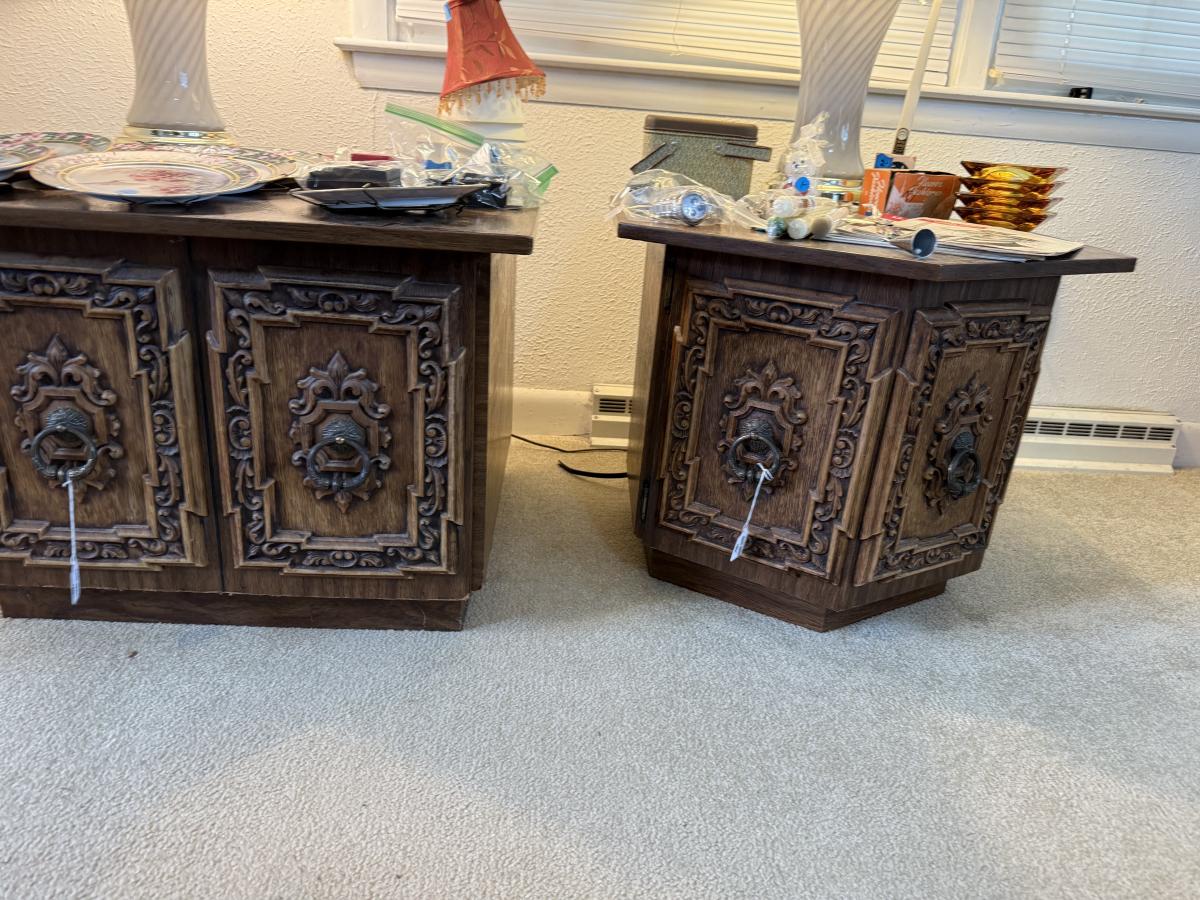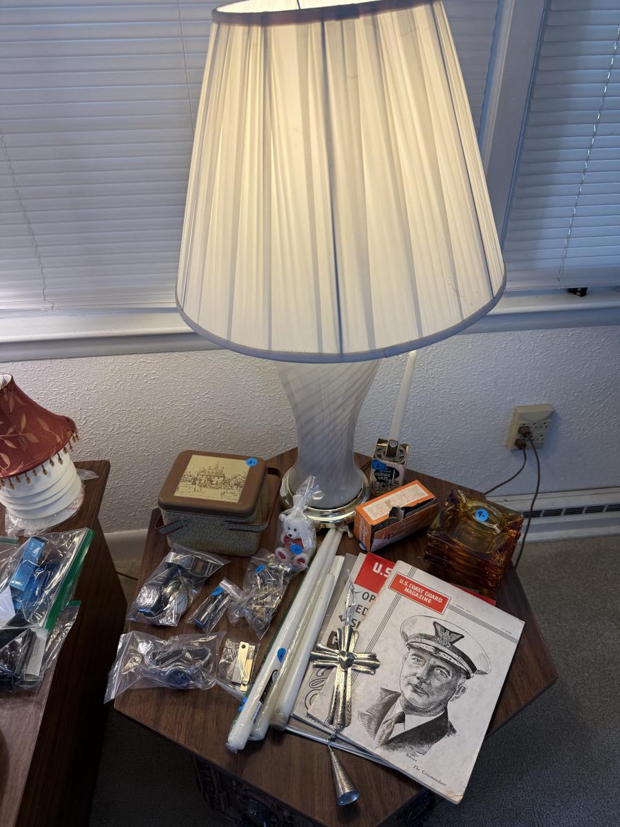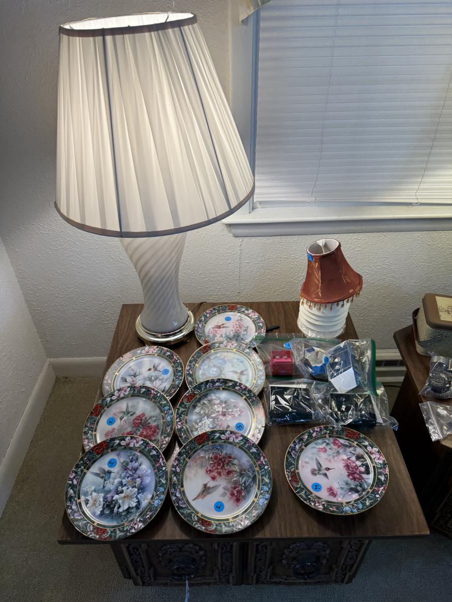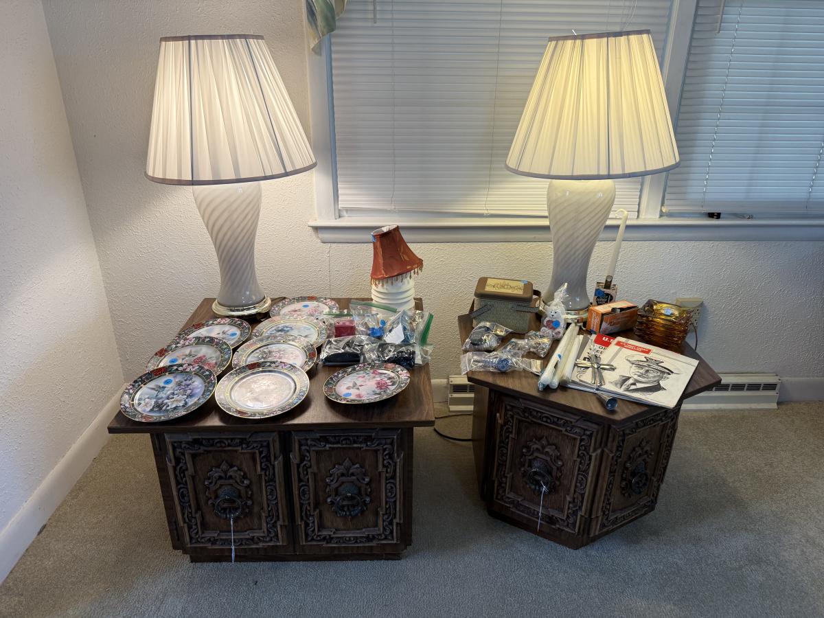 2 end table cabinets, 2 glass lamps, hummingbird plates collection, Amber ashtrays Coast Guard magazines, Avon jewelry watches, etc