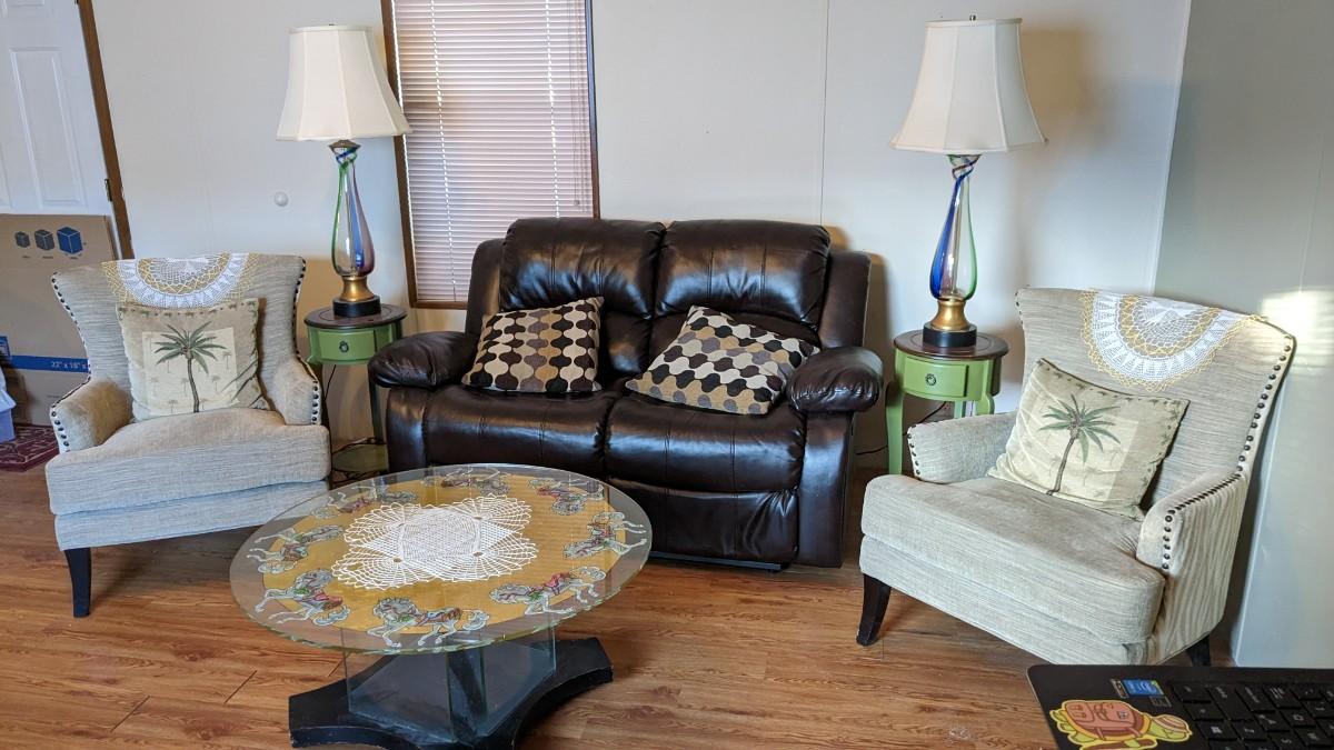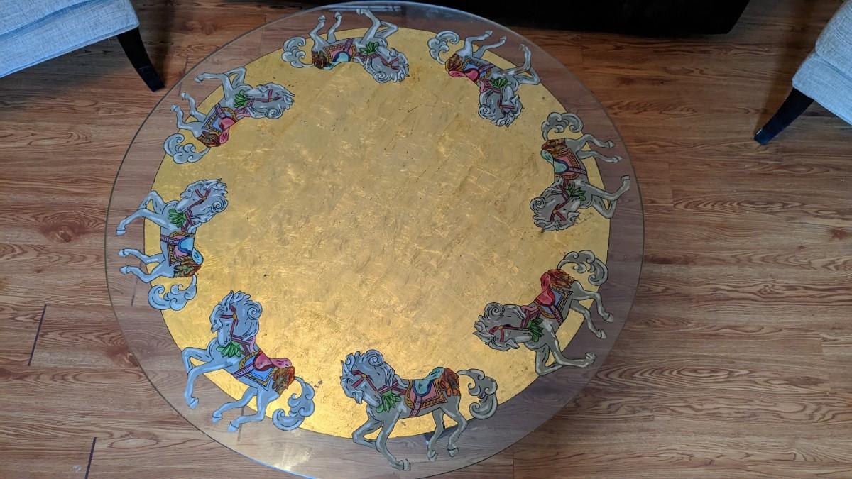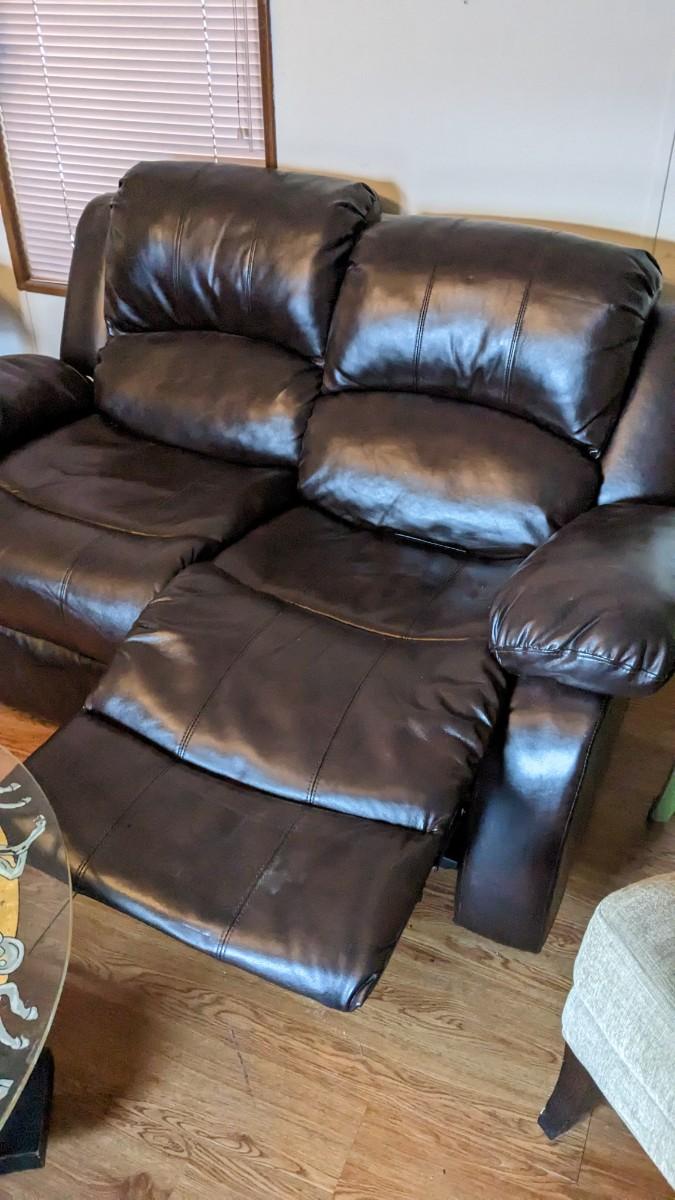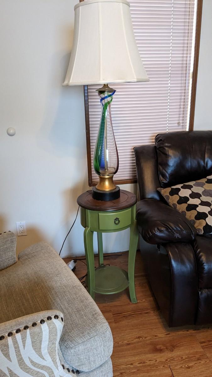 (2) 29.5"x28"x35.25", seat sits 18.5" from ground, nice dual upholstery sitting chairs. 63"x29"x29.5", seat sits 19" from ground faux leather reclining loveseat (note one side isn't operabel) (2) 13"x 27.5" side tables with small drawer, (2) 36.5" STUNNING blown glass lamps with tri color swirl in each, and a very unique 37" wide 18.75" tall- round coffee table with wheels, gold gilding and Lipizzaner horses trotting around the edge and display base. This is a really unique piece and very pretty. No shipping. Winning bidder responsible for removal of all furniture. NOTE THIS IS A TRUCK BED FULL OF FURNITURE. Please plan accordingly. livingroom