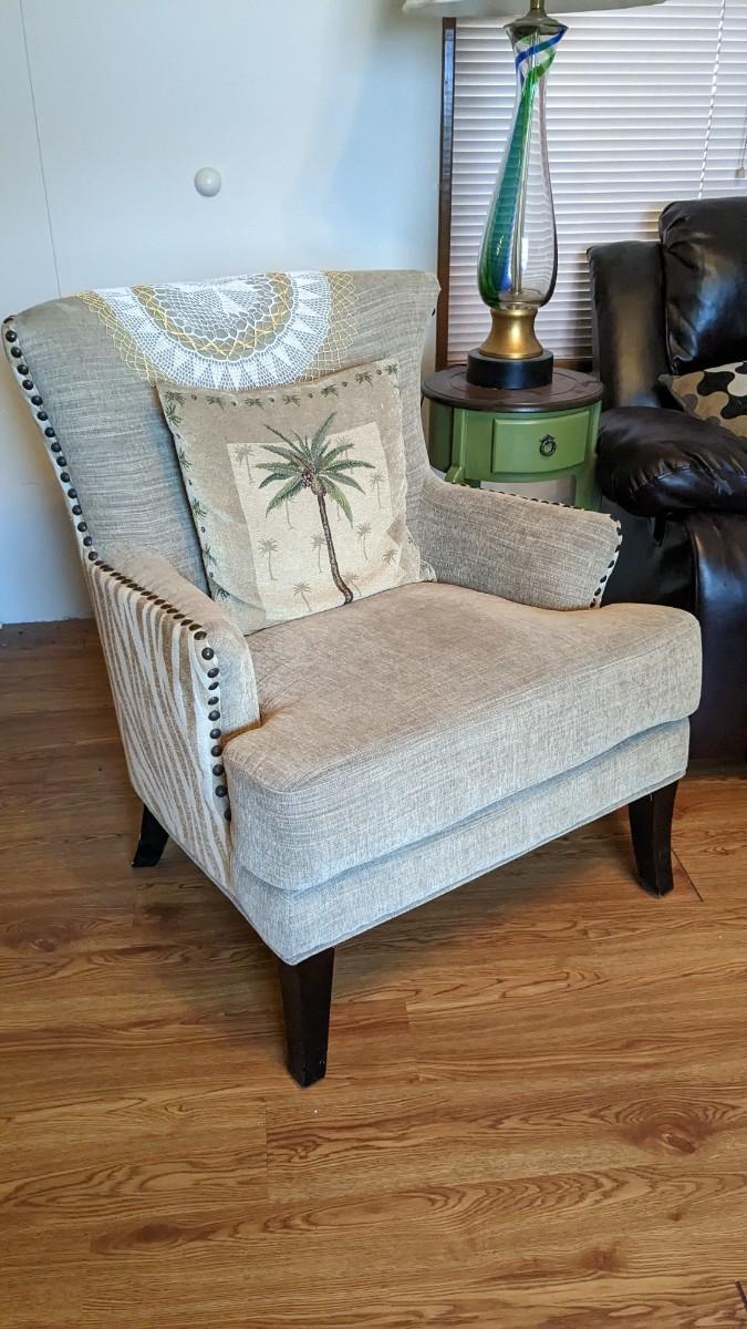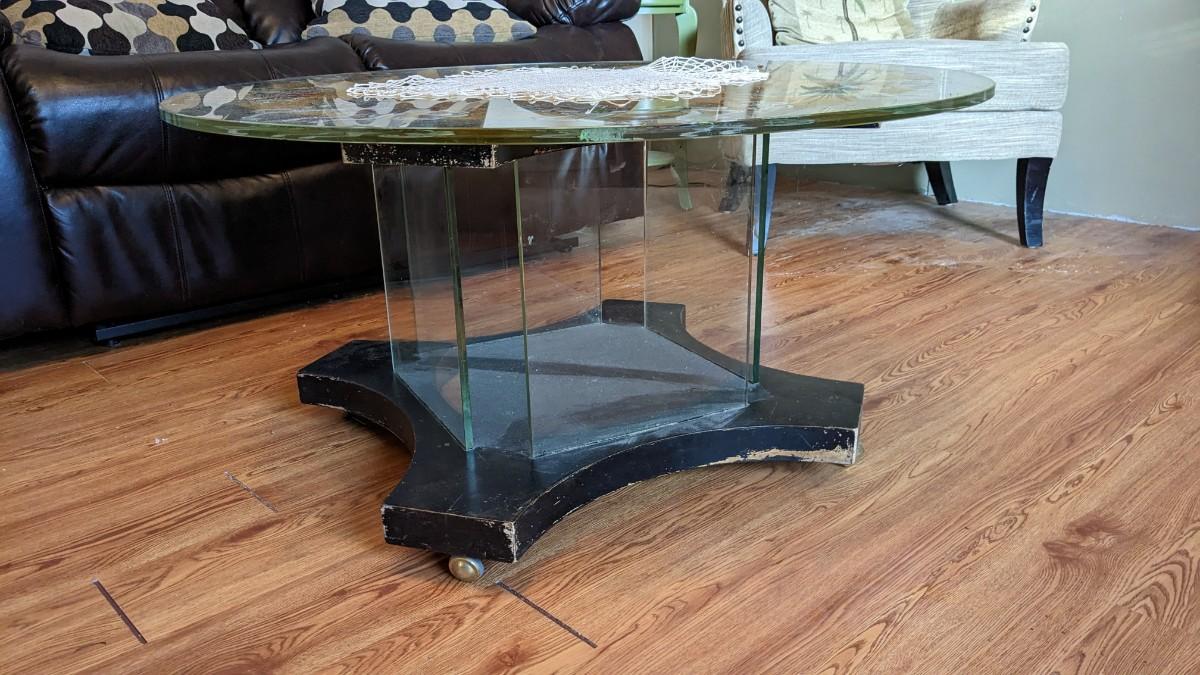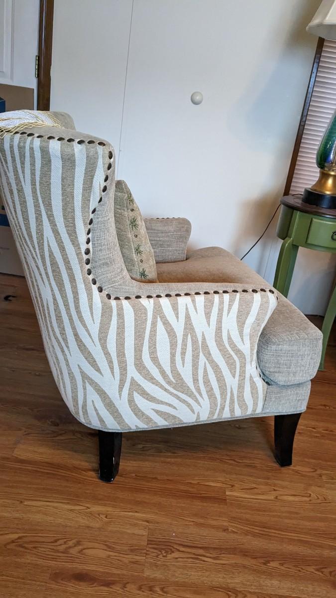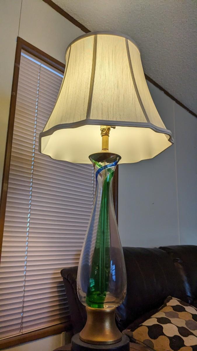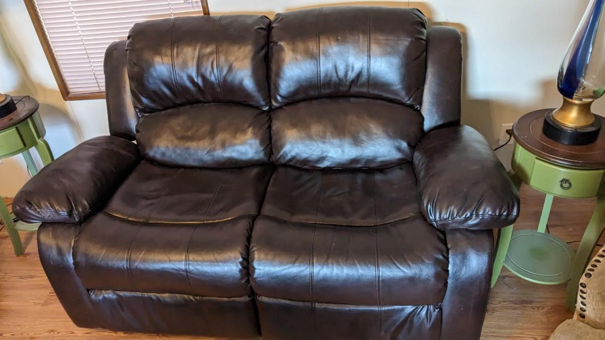 (2) 29.5"x28"x35.25", seat sits 18.5" from ground, nice dual upholstery sitting chairs. 63"x29"x29.5", seat sits 19" from ground faux leather reclining loveseat (note one side isn't operabel) (2) 13"x 27.5" side tables with small drawer, (2) 36.5" STUNNING blown glass lamps with tri color swirl in each, and a very unique 37" wide 18.75" tall- round coffee table with wheels, gold gilding and Lipizzaner horses trotting around the edge and display base. This is a really unique piece and very pretty. No shipping. Winning bidder responsible for removal of all furniture. NOTE THIS IS A TRUCK BED FULL OF FURNITURE. Please plan accordingly. livingroom