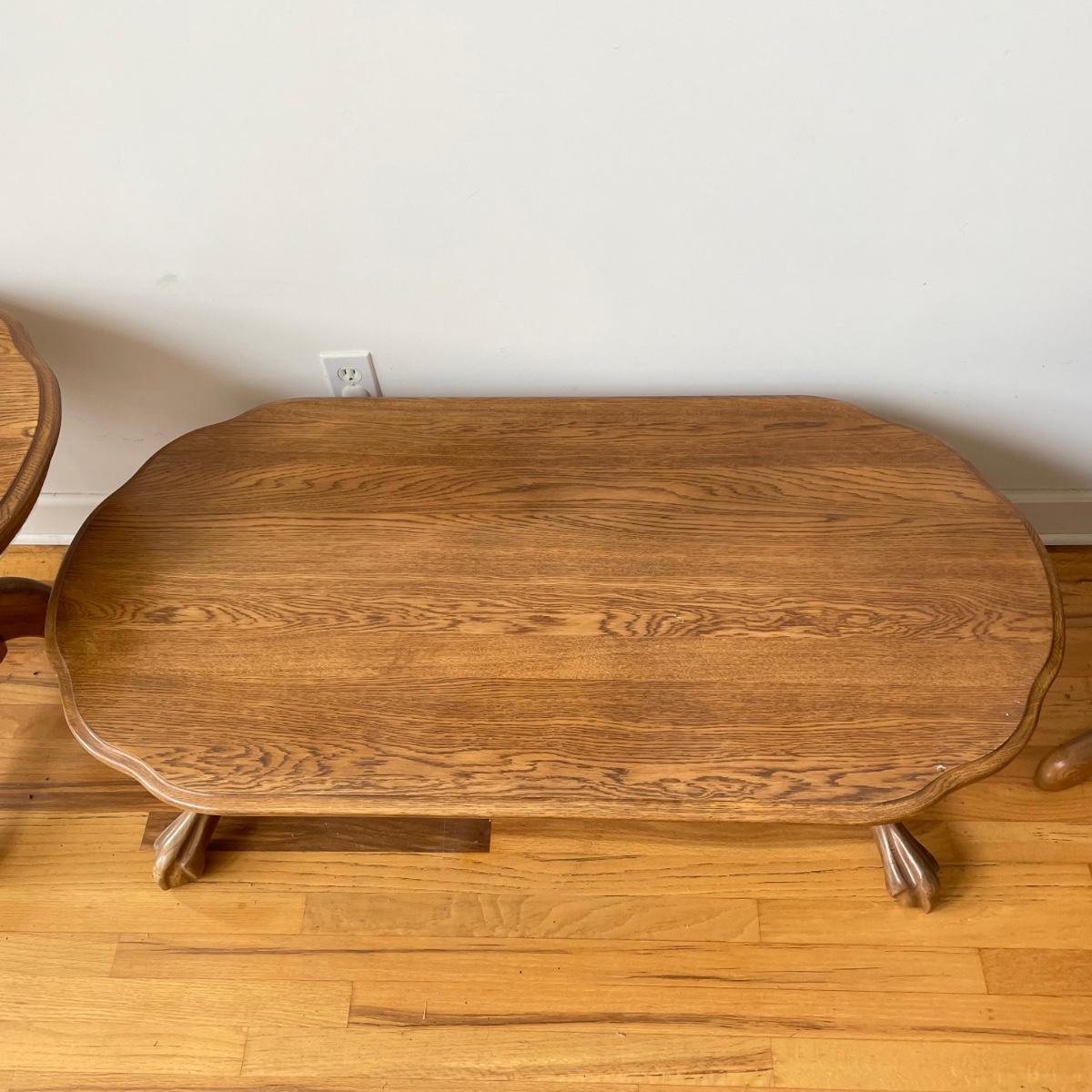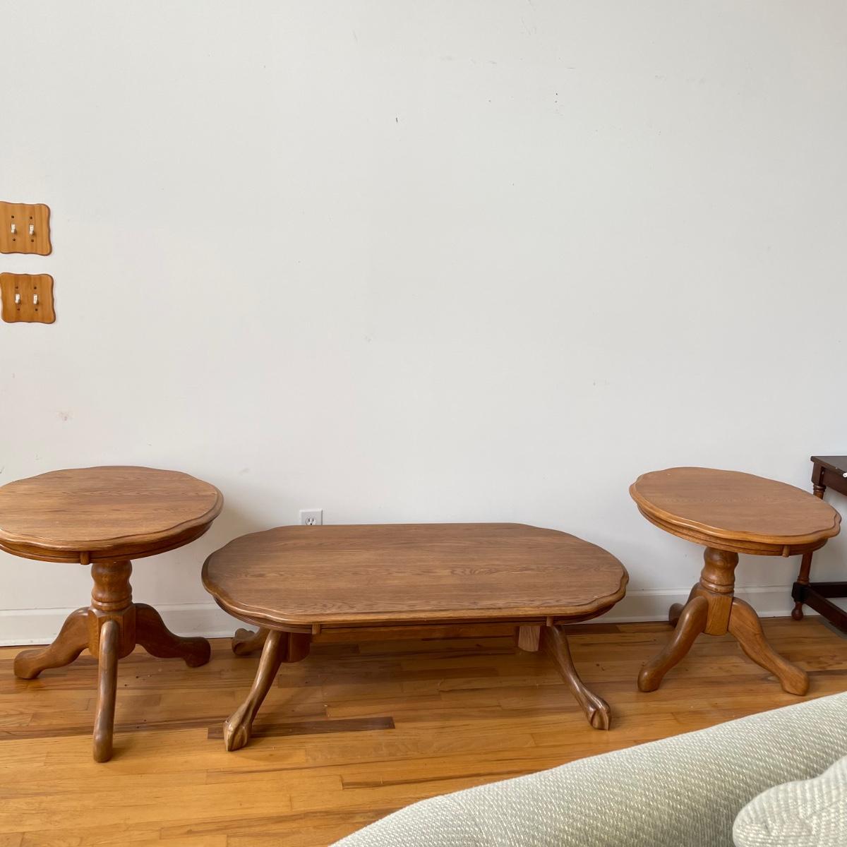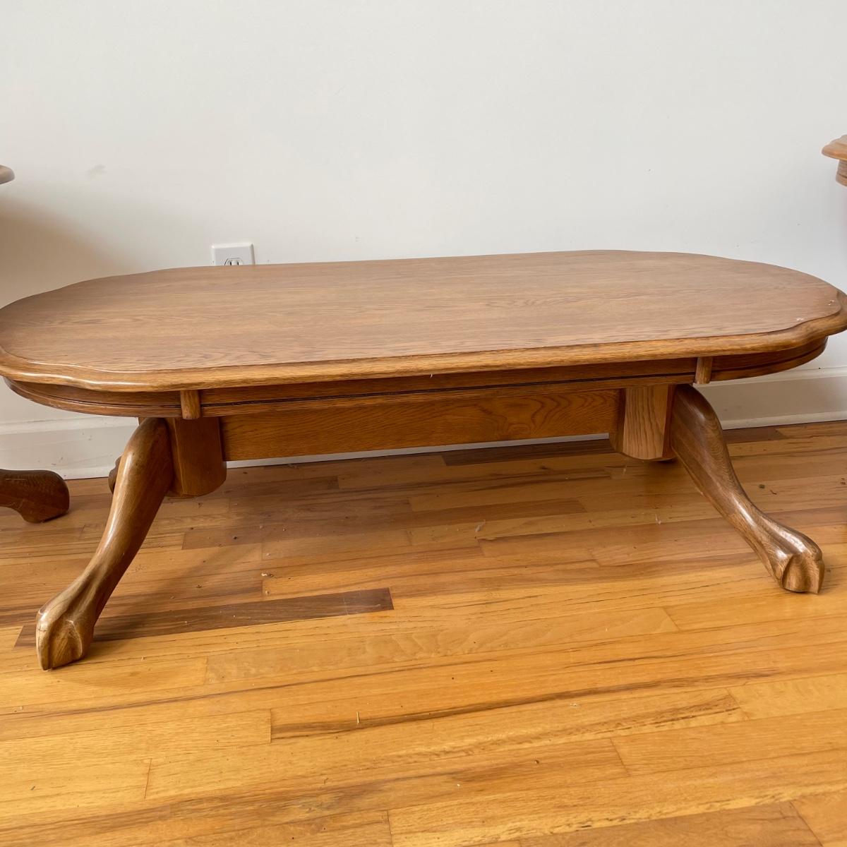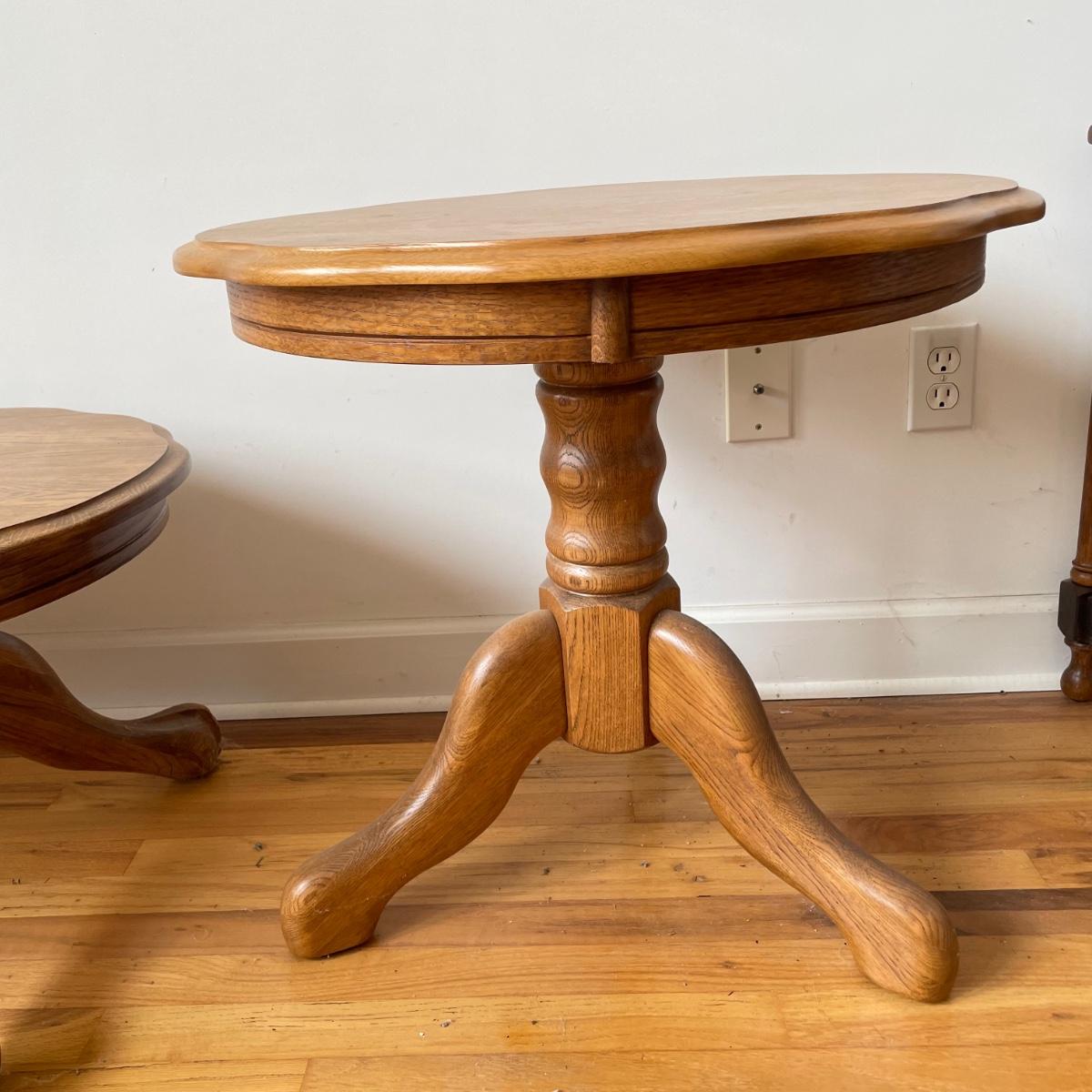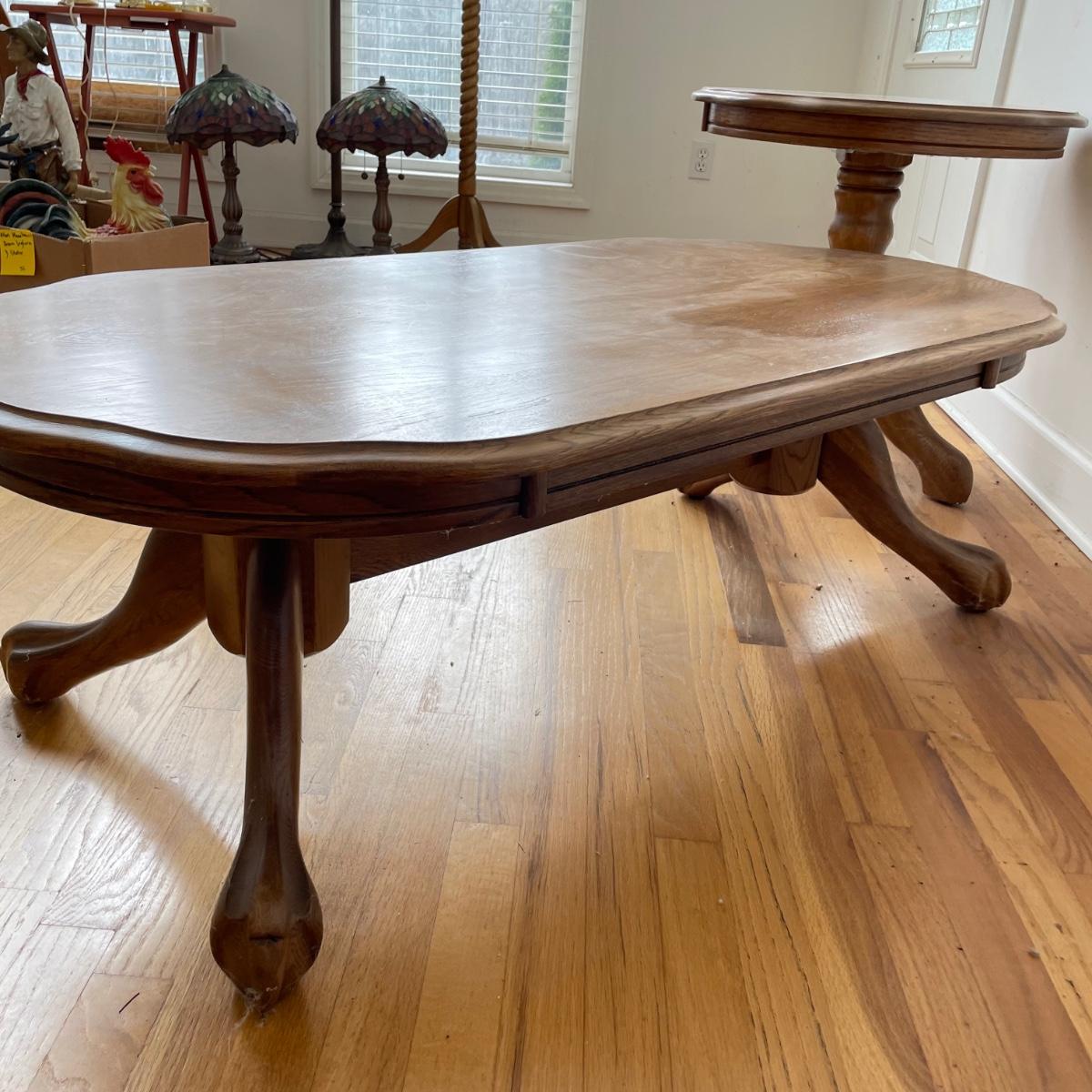 Two matching end tables with pedestal bases and a coffee table with claw feet. All appear to be solid wood with an oak style finish. The end tables measure roughly 24”d x 23” and the coffee table is about 48” x 24” x 16”. Minimal blemishes, some noted in photos, the coffee table has a very slight variance of color on its top. Local pick up only.