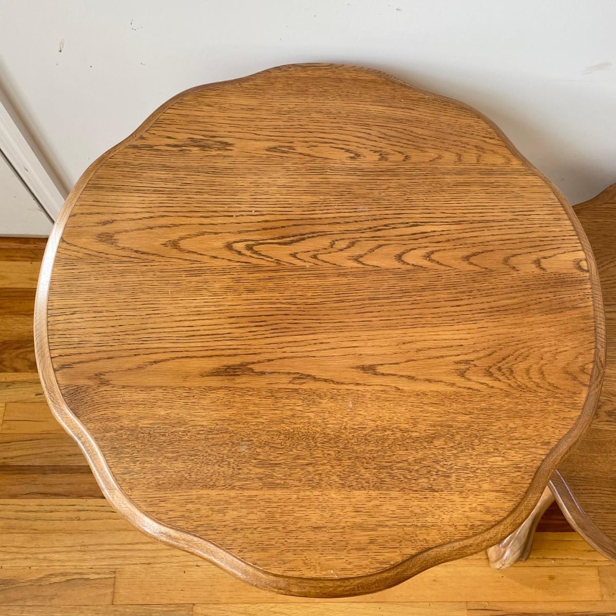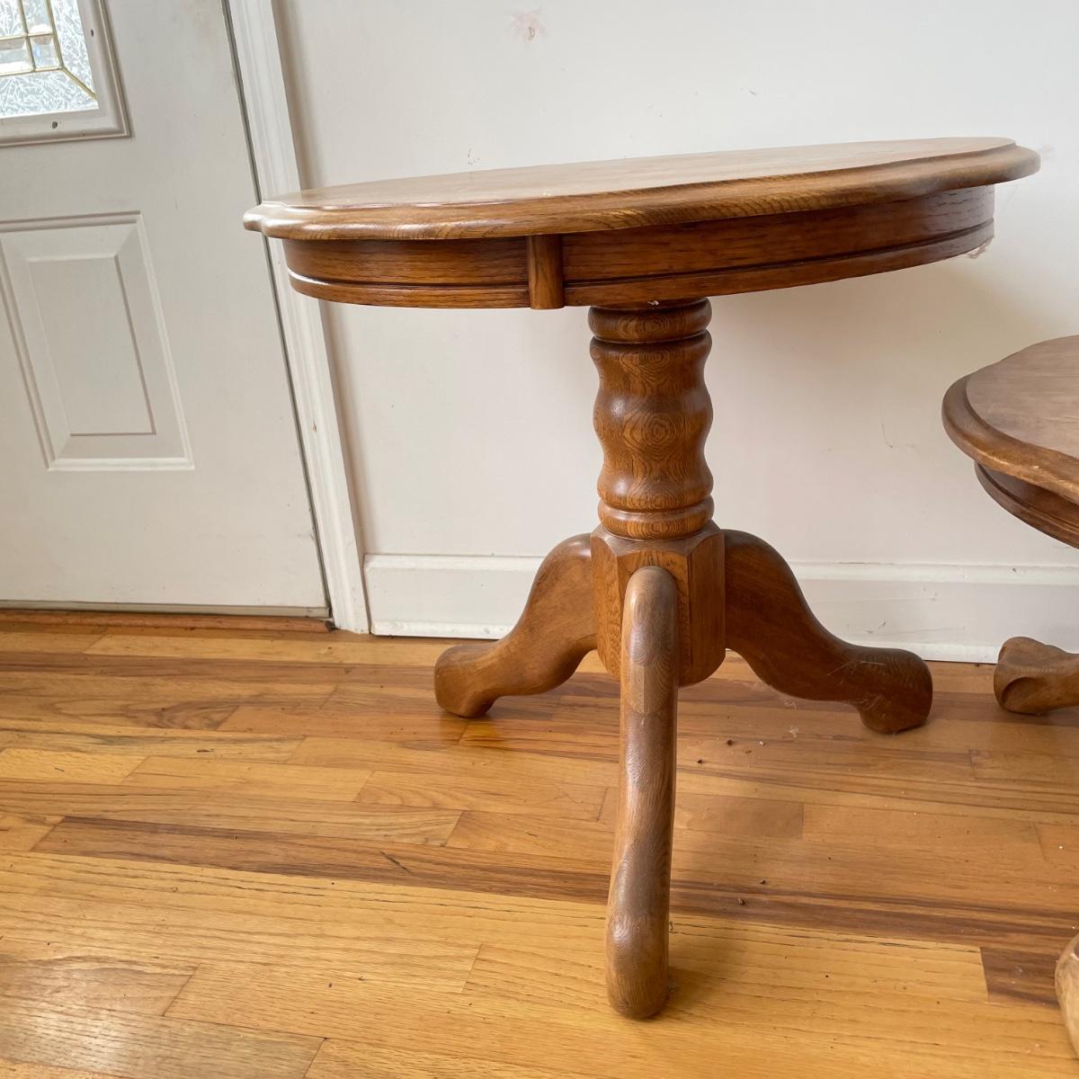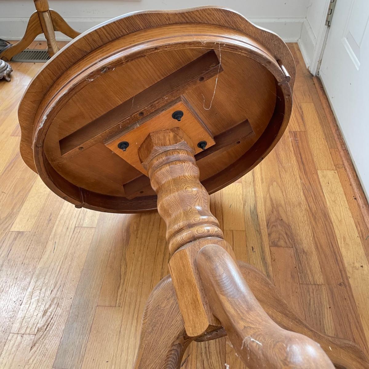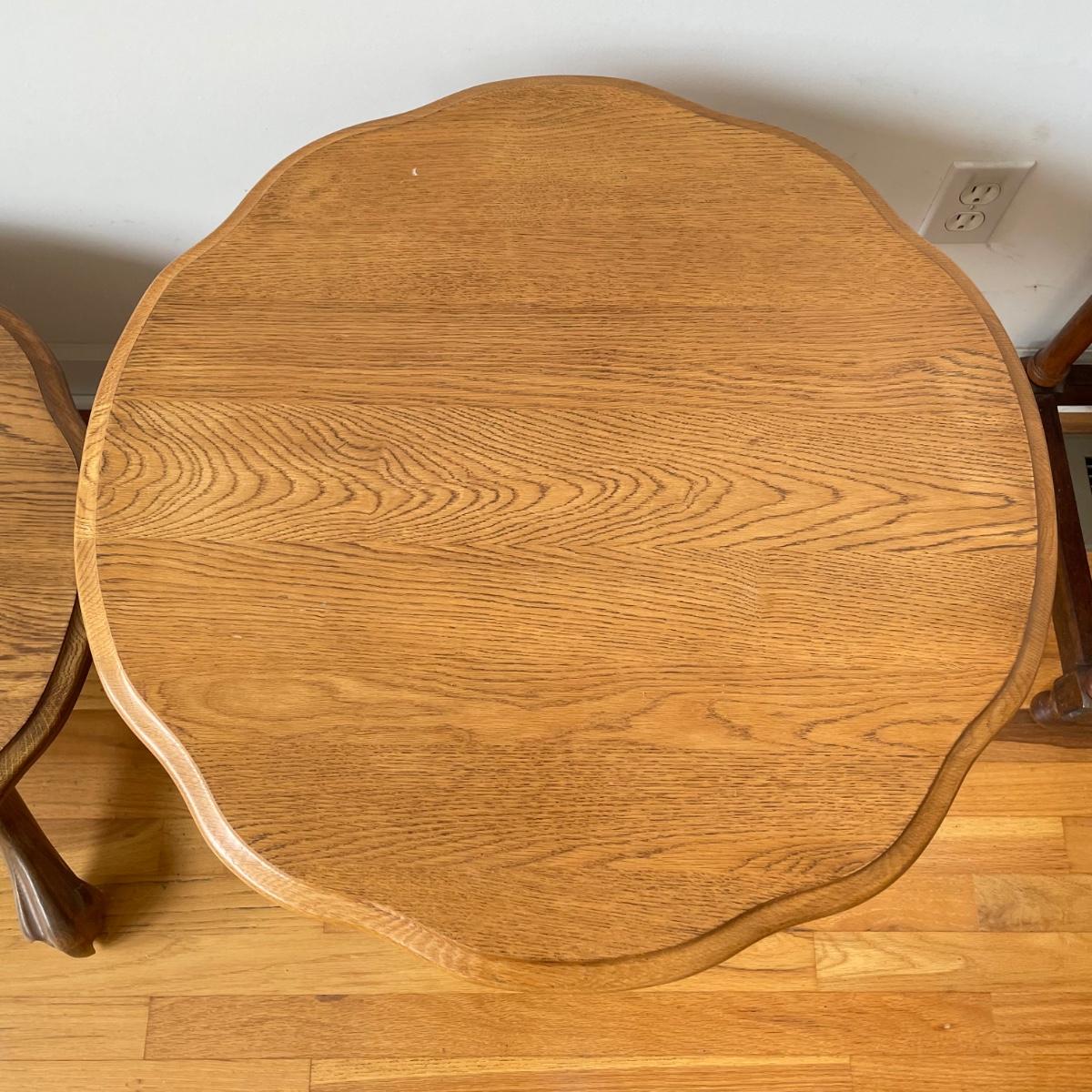 Two matching end tables with pedestal bases and a coffee table with claw feet. All appear to be solid wood with an oak style finish. The end tables measure roughly 24”d x 23” and the coffee table is about 48” x 24” x 16”. Minimal blemishes, some noted in photos, the coffee table has a very slight variance of color on its top. Local pick up only.