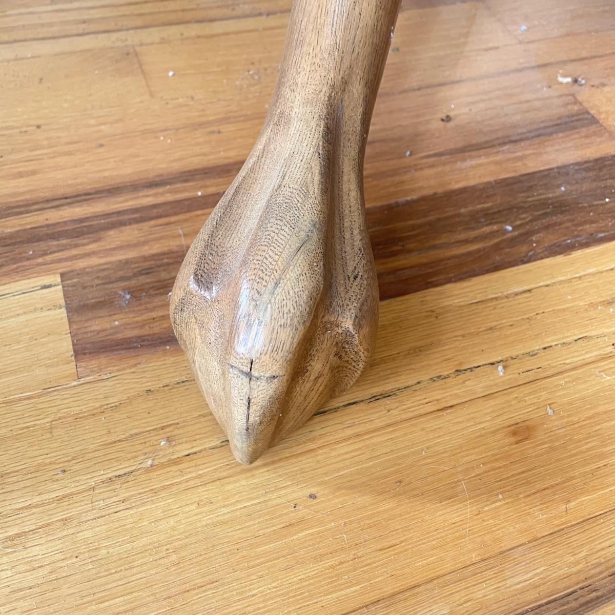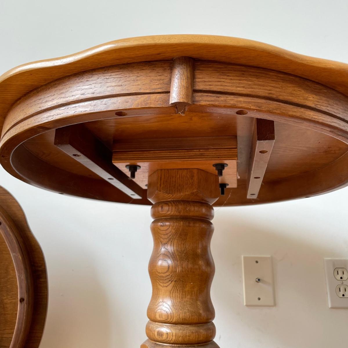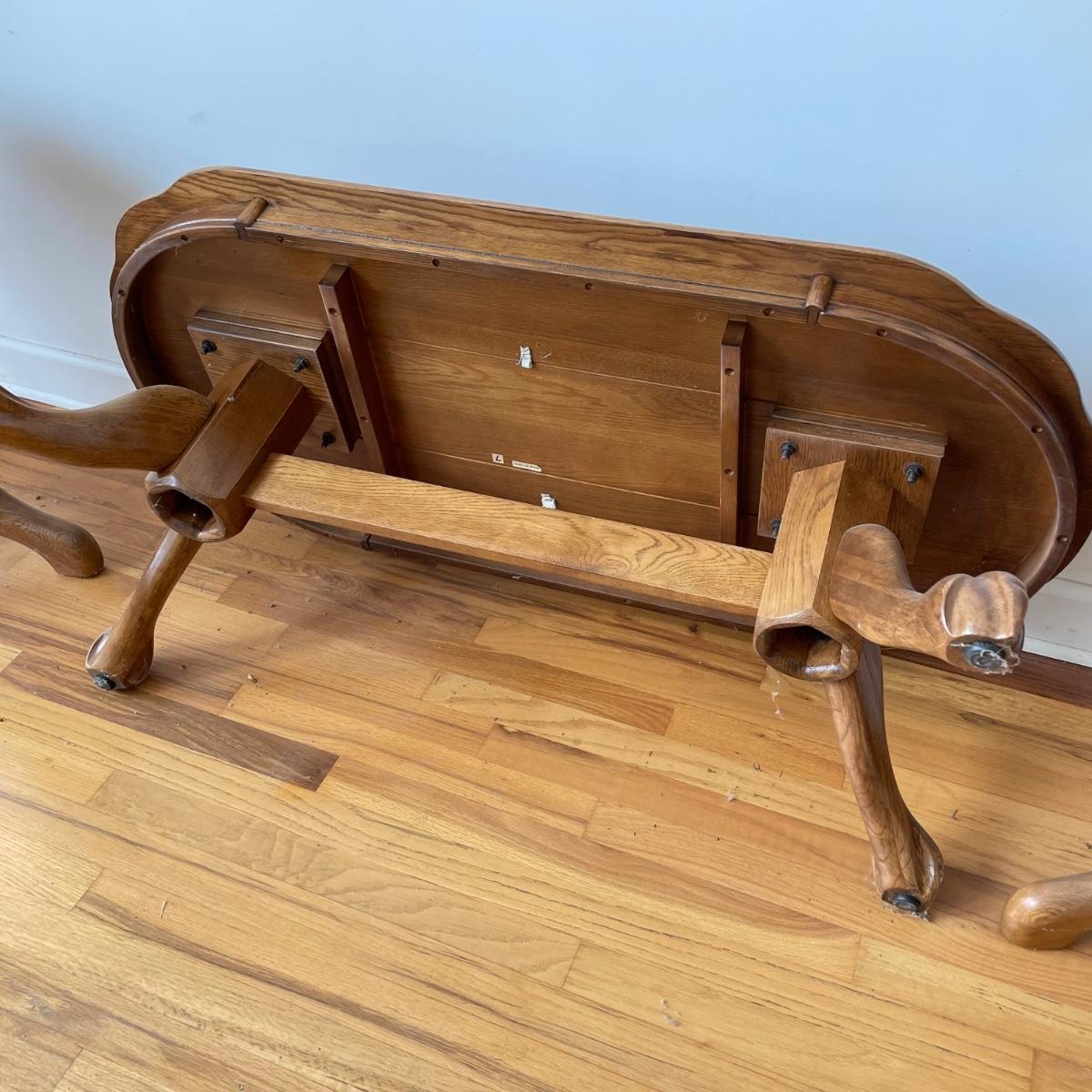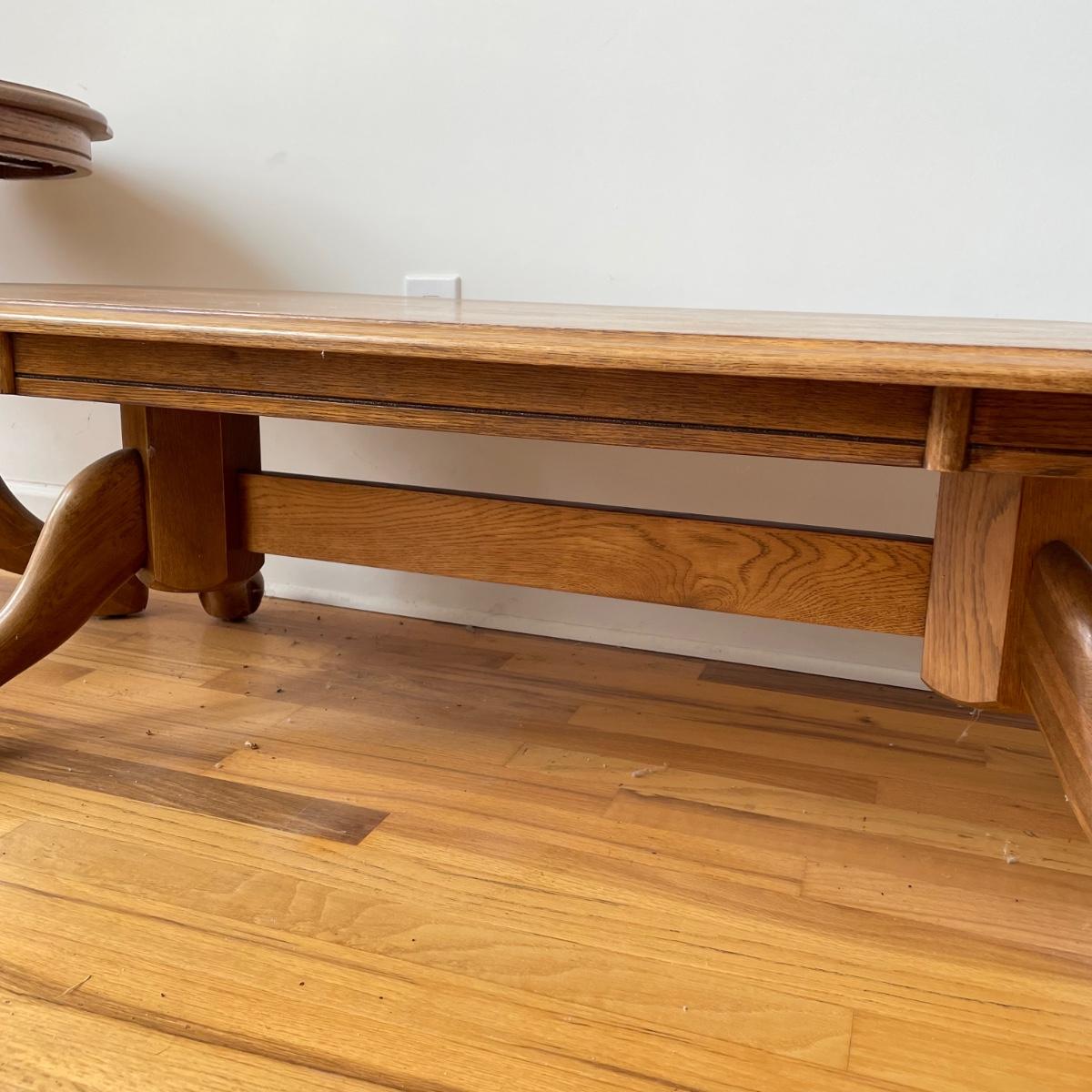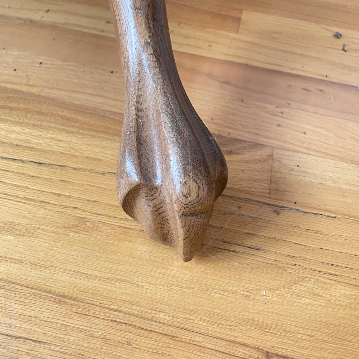 Two matching end tables with pedestal bases and a coffee table with claw feet. All appear to be solid wood with an oak style finish. The end tables measure roughly 24”d x 23” and the coffee table is about 48” x 24” x 16”. Minimal blemishes, some noted in photos, the coffee table has a very slight variance of color on its top. Local pick up only.