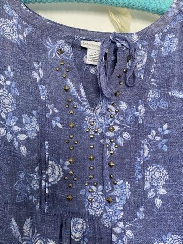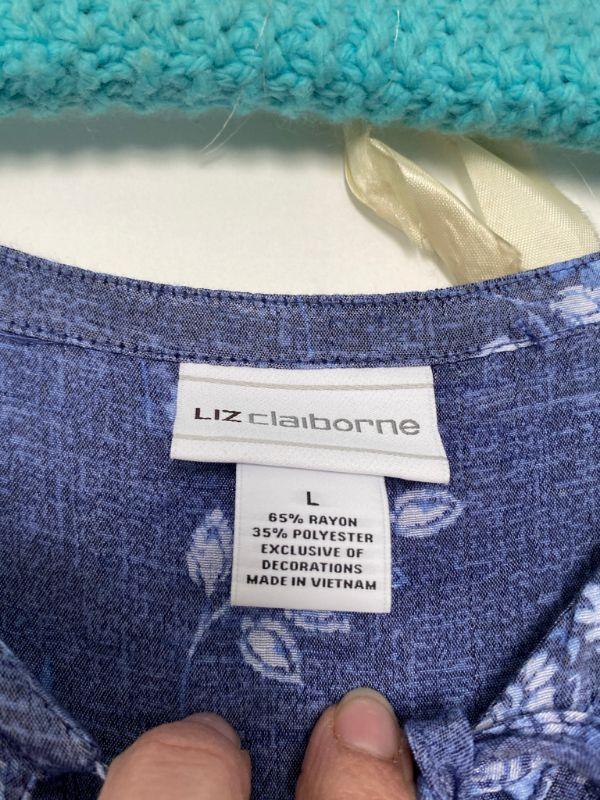 Liz Claiborne Blue with white floral short sleeve blouse. Tie at the collar. Size Large.