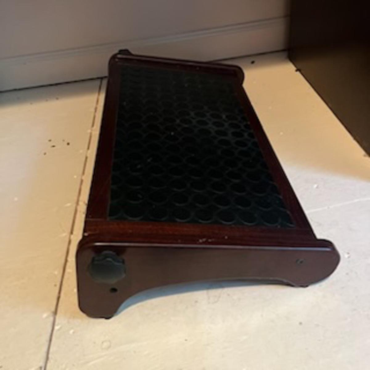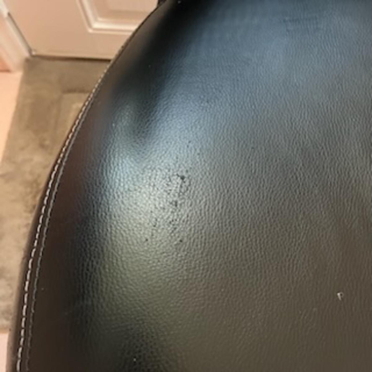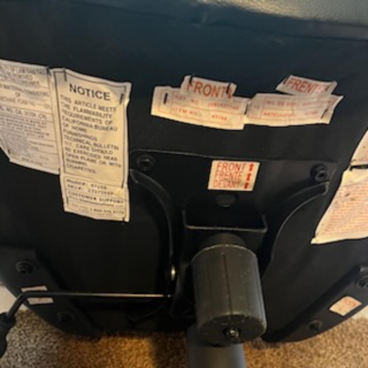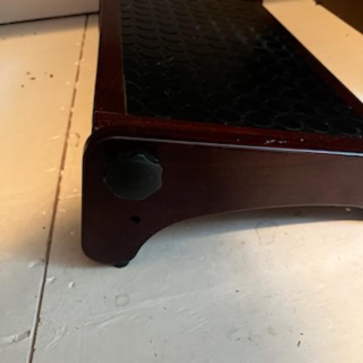 Lizell footrest. Top appears to be thick textured rubber. Measures 22” X 12” X 5.25”H. Instructions and Allen wrench included. True Innovations desk chair swivels with adjustable height lever. Base is made of heavy duty plastic. The seat appears to be vinyl and has a small worn spot. See photo. Chair is 21” X 20” X 41”H, although height is adjustable. Adjusts to lowest seat height of 17” and tallest seat height of 21”. Local pickup only.