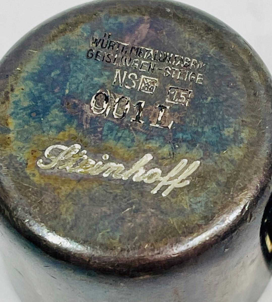 WMF is the abbreviation for Württembergische Metallwarenfabrik, which means Württemberg Metal Factory and was created in 1880 in the small town of Geislingen on the river Steige (Geislingen an der Steige), after the successful merger of two smaller silver plate foundries. The bottom of the cup is marked by long inscription "WÜRTT. METALLW. FABRIK GEISLINGEN-STEIGE" and by the abbreviation "WMF" placed in a rectangle.