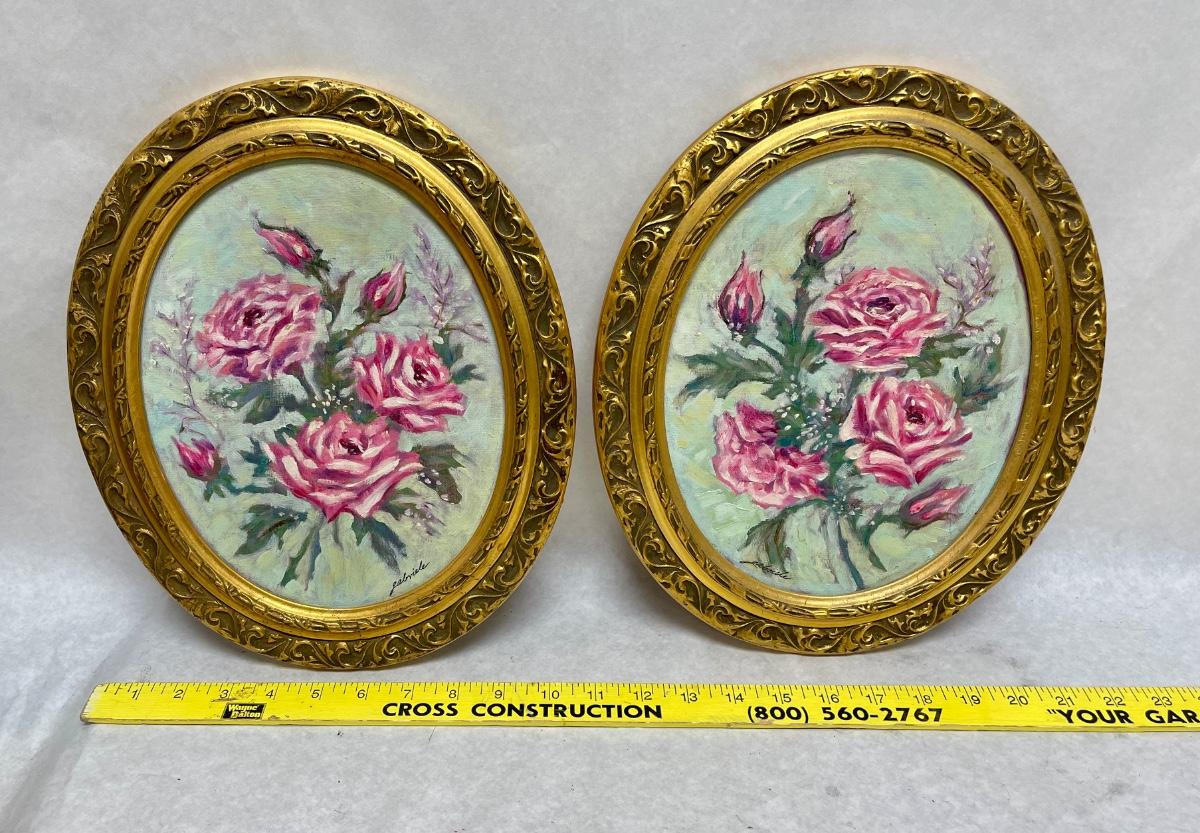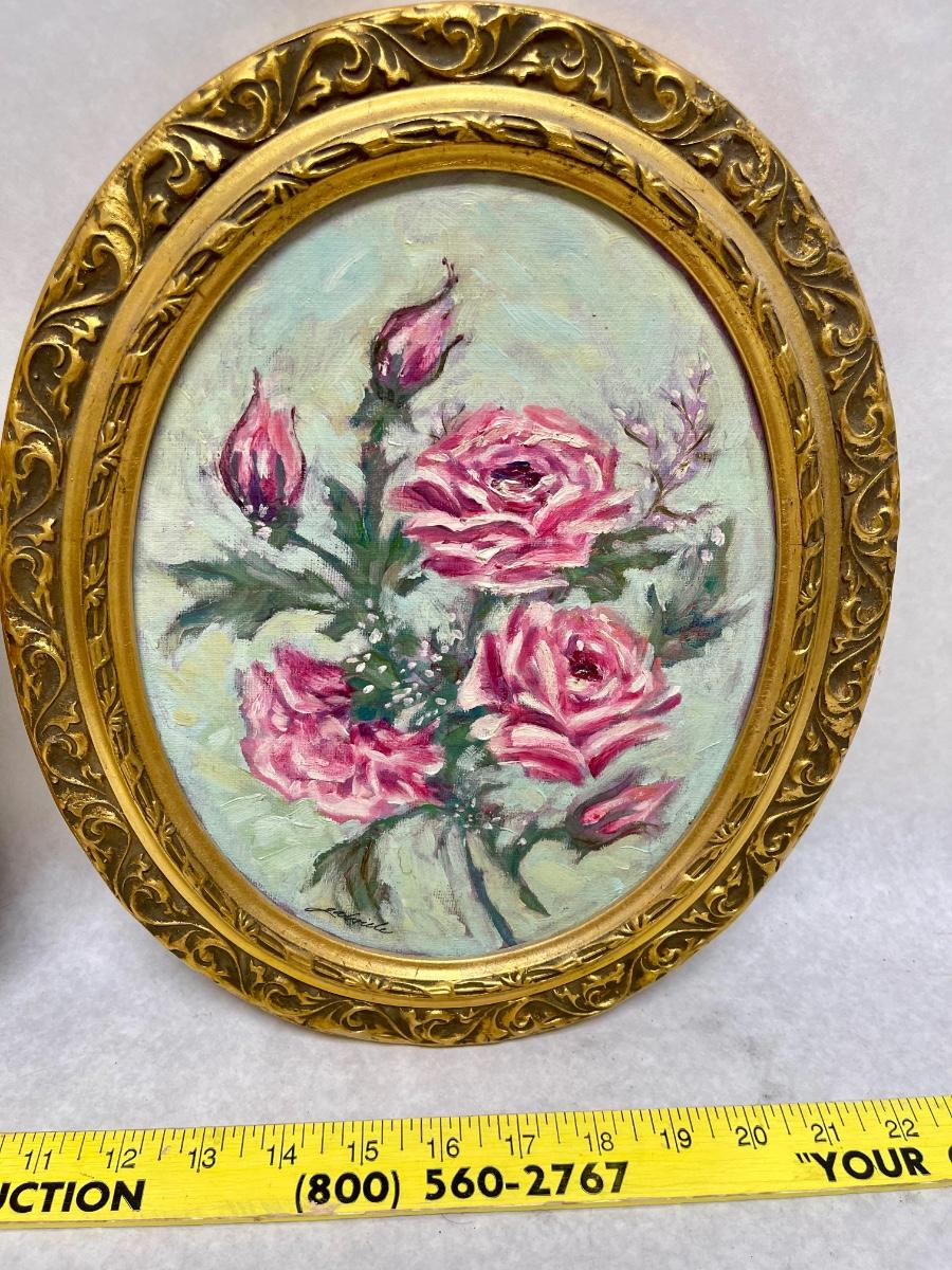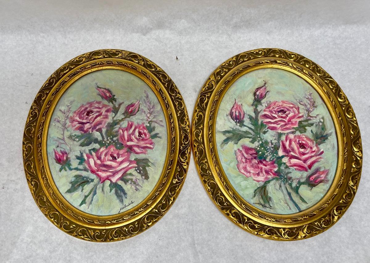 Framed Oval Paintings Pink Roses on green background with gold gilt frames signed Gabriele