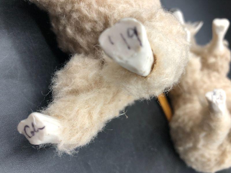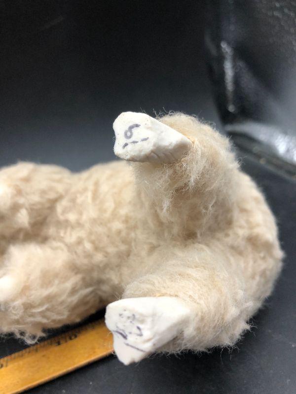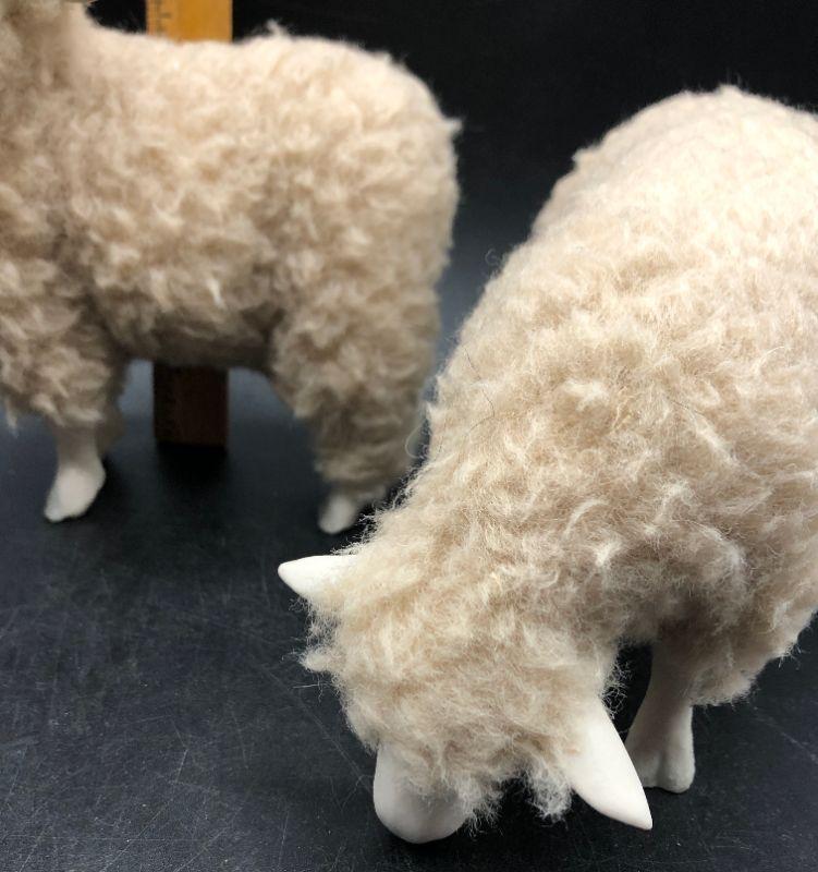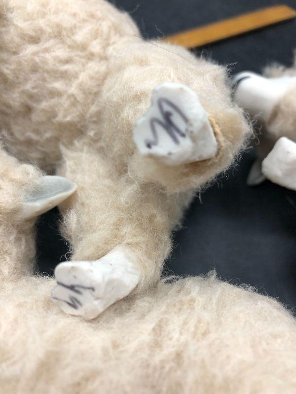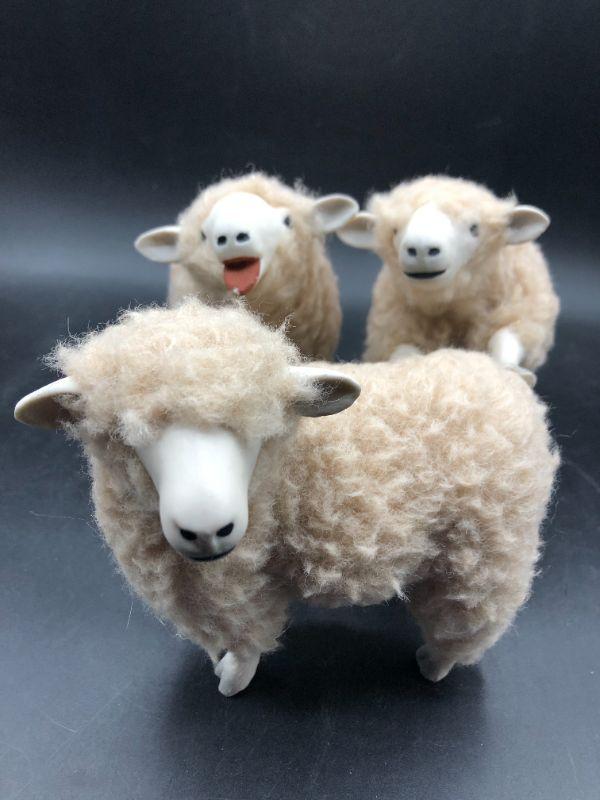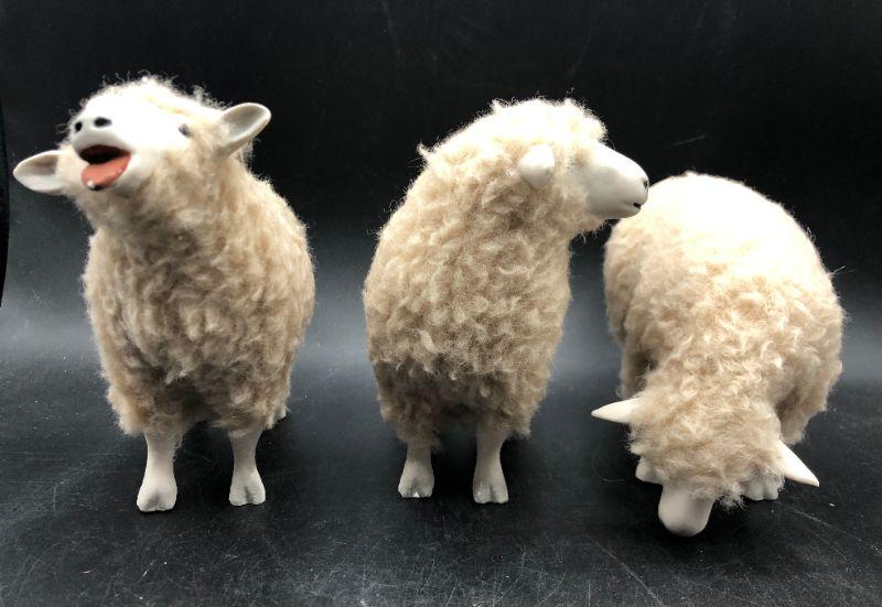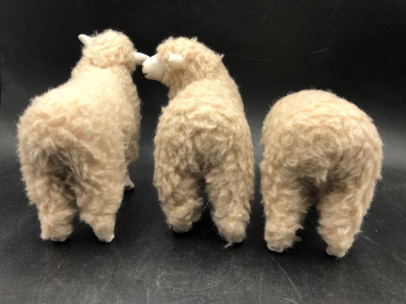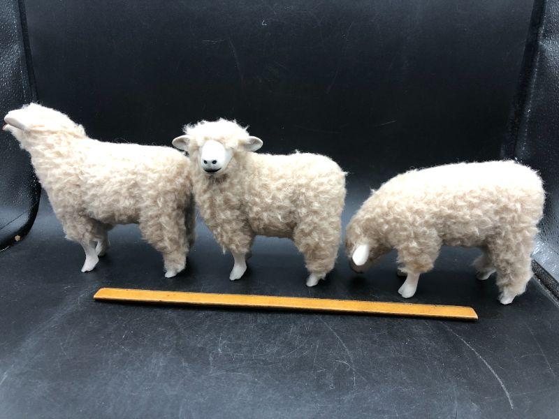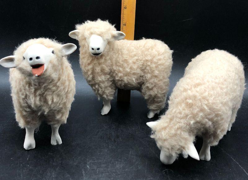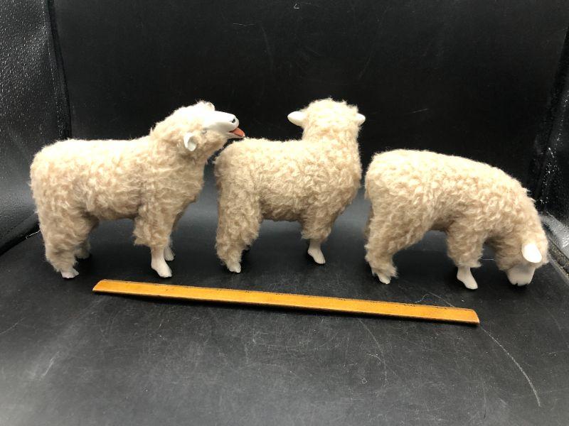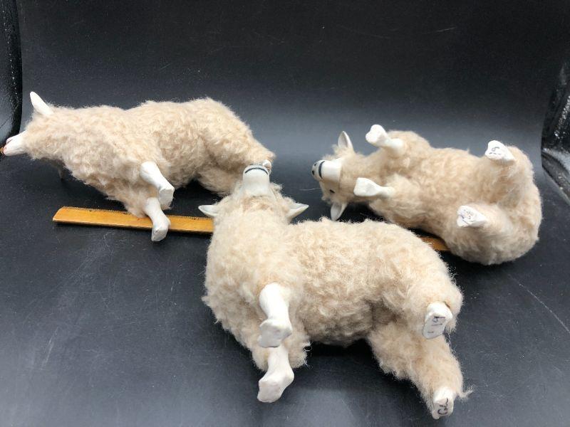 Set of 3 cute wooly sheep figurines. Each one different from the other. Porcelain feet and faces. Wooly bodies. About 6" size. Signed marks on the bottom of feet.