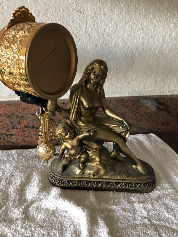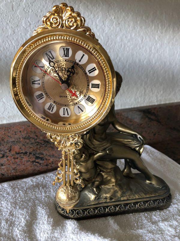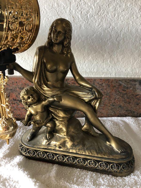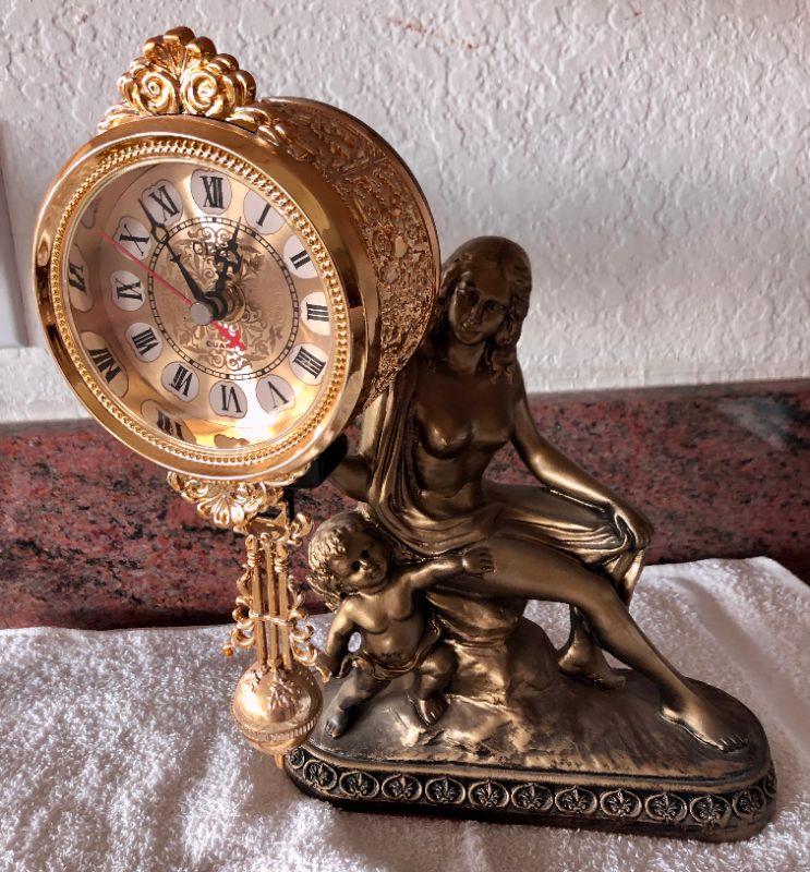 Art Nouveau style woman and cherub mantle clock. Unbranded. Bright gold and brass finish. Currently not running. 12" size.