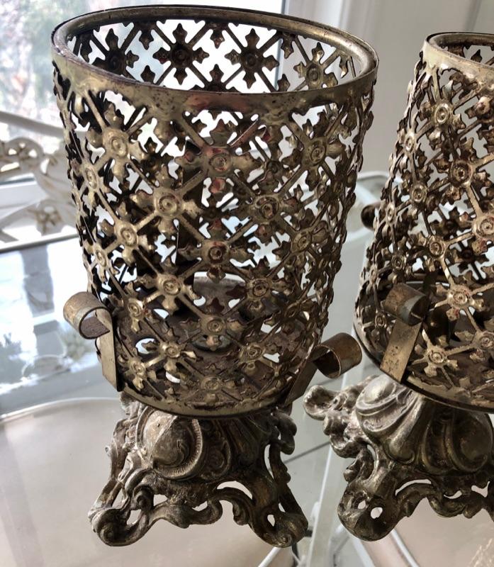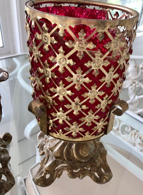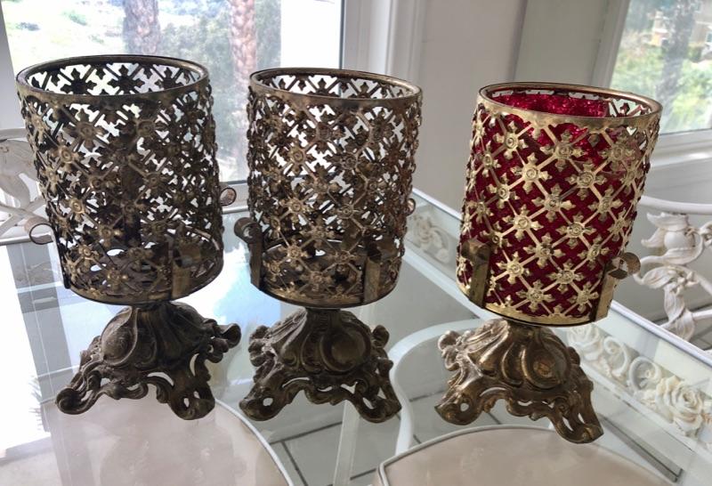 Set of 3 vintage candle holders. Ornate holders have a regency Moroccan look to them. The red lining on the end one is damaged can be removed to give the open metal look.