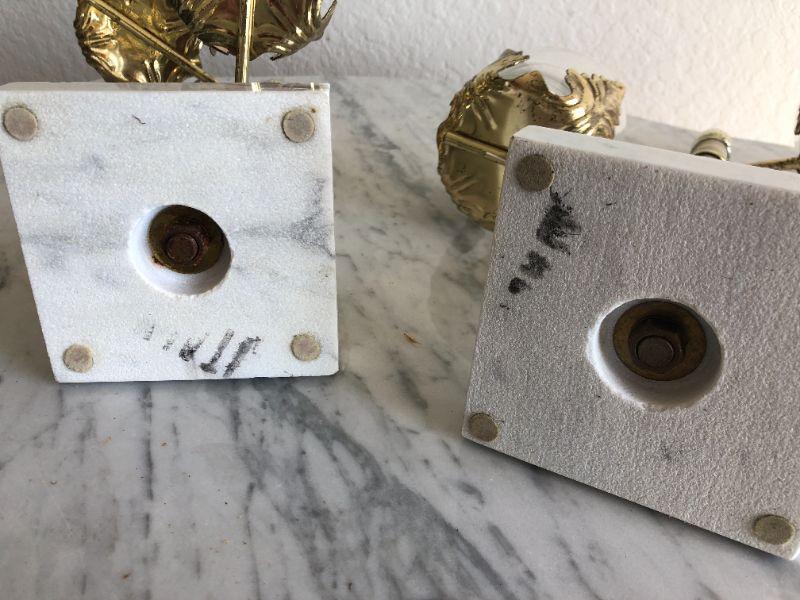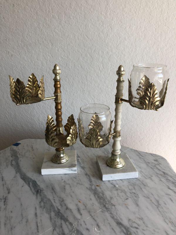 Pair of regency style candle holders. Adjustable arms. One is missing the glass pieces, but candles could easily sit in holder without glass.