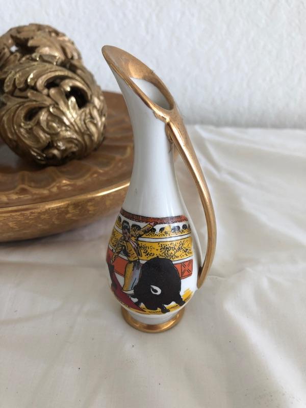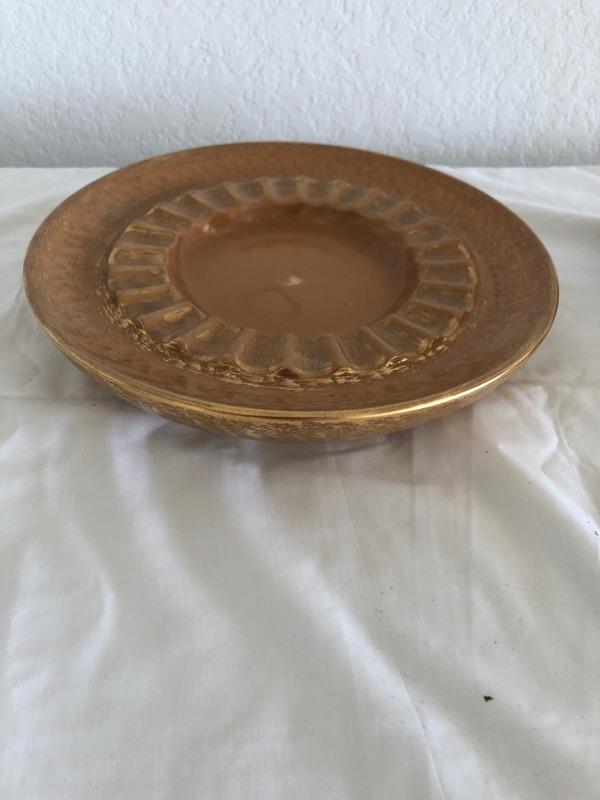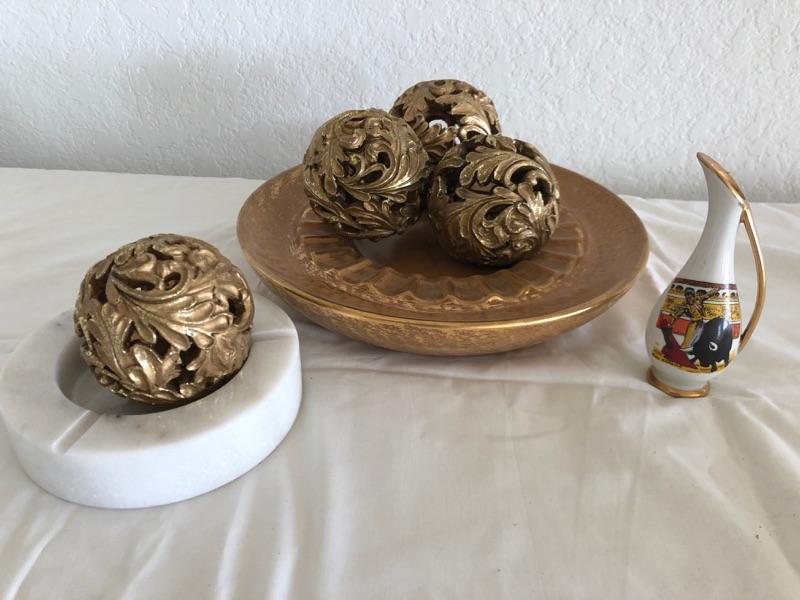 Vintage decor gold gilt lot. Filigree balls, ashtrays and small pitcher souvenir from Spain possibly.
