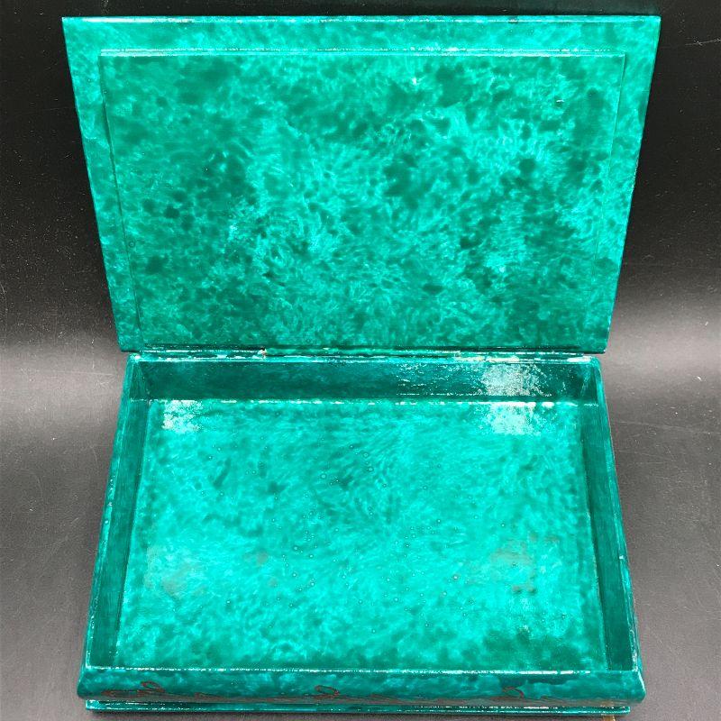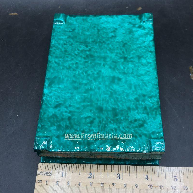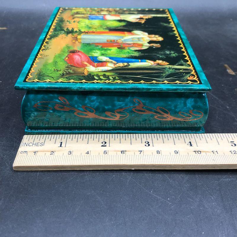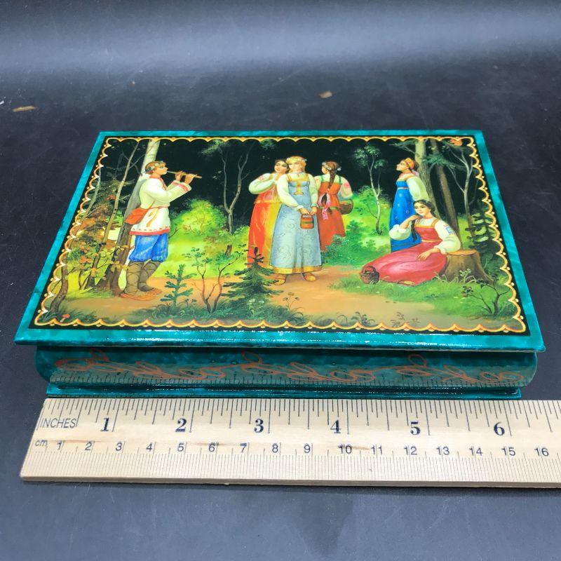 Russian lacquered enamel trinket box, hinged lid, people in forest listening to music