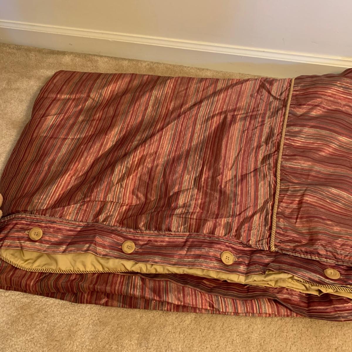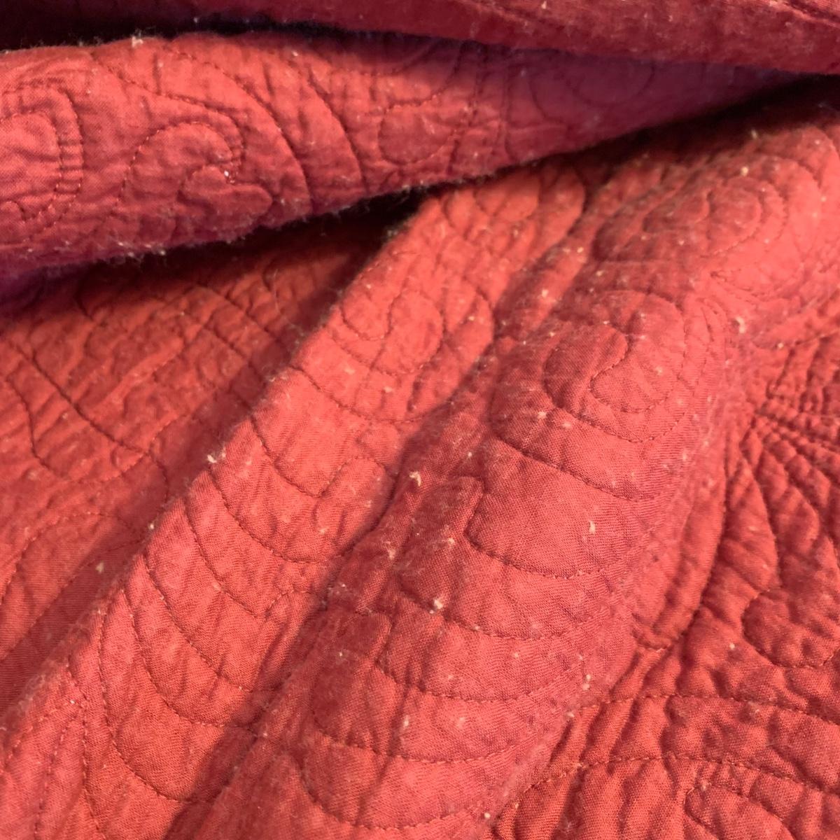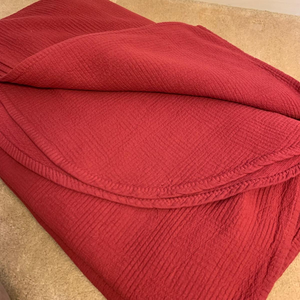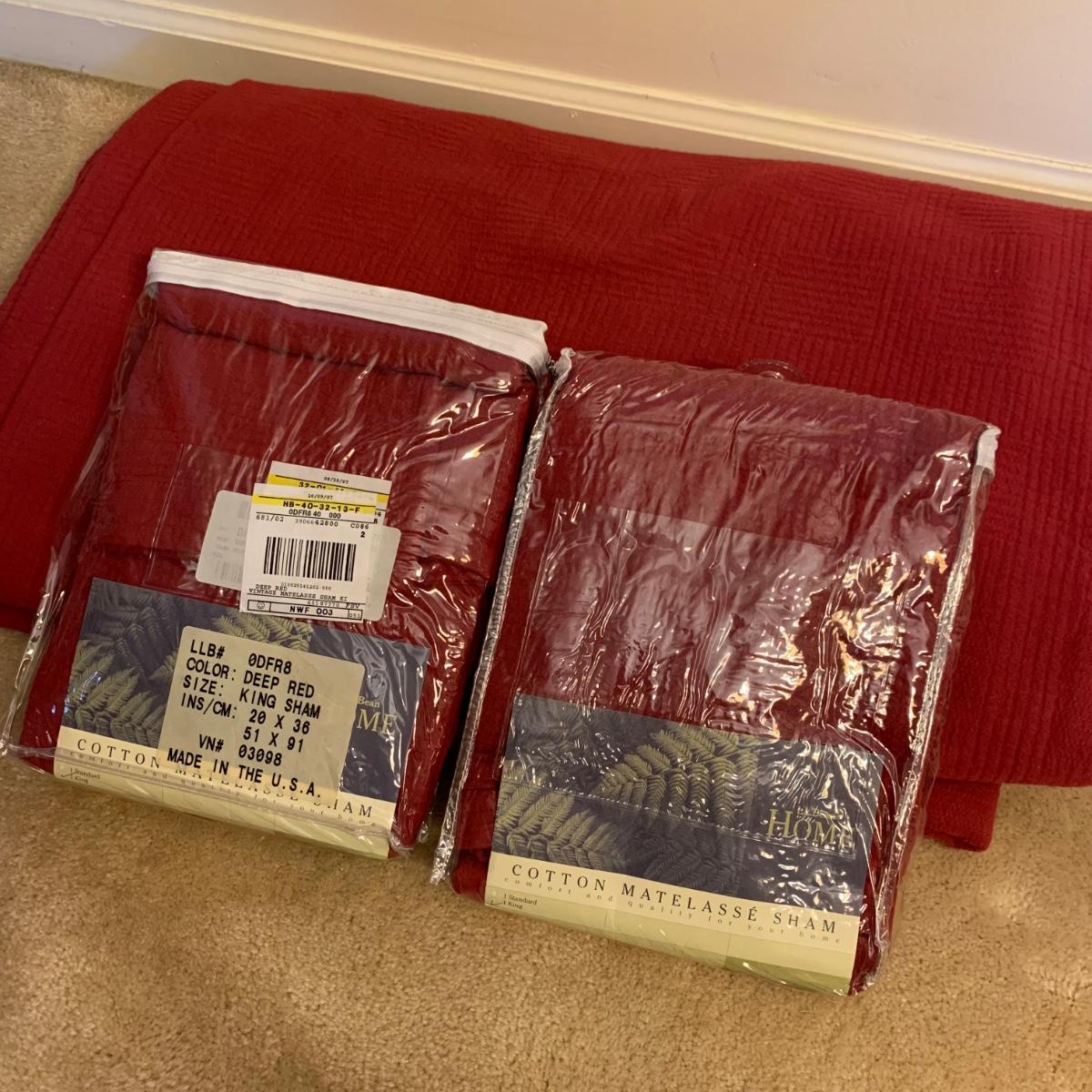 This lot contains a variety of blankets and related items. There is an L.L. Bean deep red king size cotton matelassé sham and bedspread set, a red king size down duvet, three blankets, and a striped sateen duvet cover. The shams appear to be unused in their original packaging. The matching bedspread has a small pair of holes from a safety pin. There is no size label found on the duvet cover, but it is quite large and appears to be king size. The red quilted blanket’s tag has been removed. It has some fuzz on it that appears to be from another blanket as it is removable; it is not pilled. The tan blanket is Egyptian cotton and very soft and it is approximately 92” x 92”.
