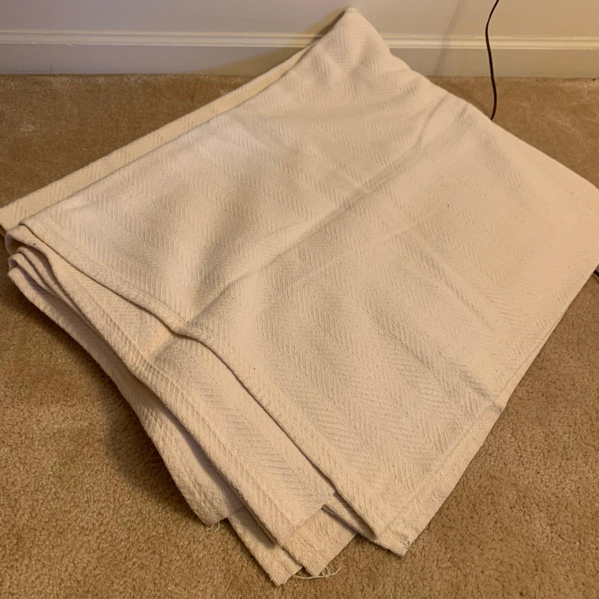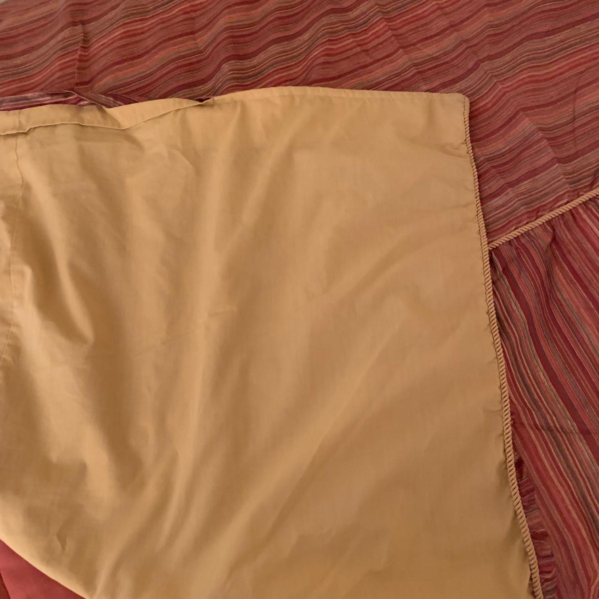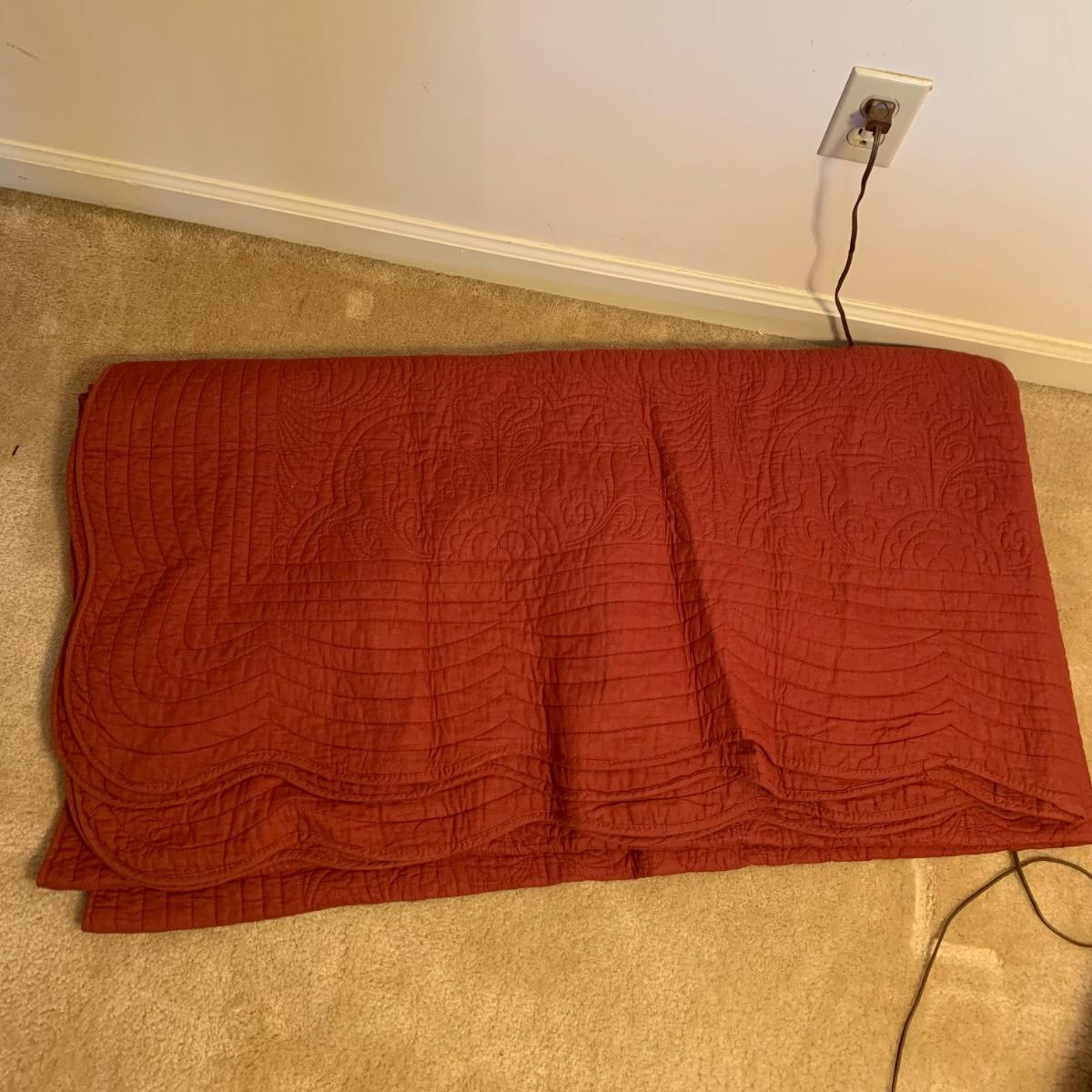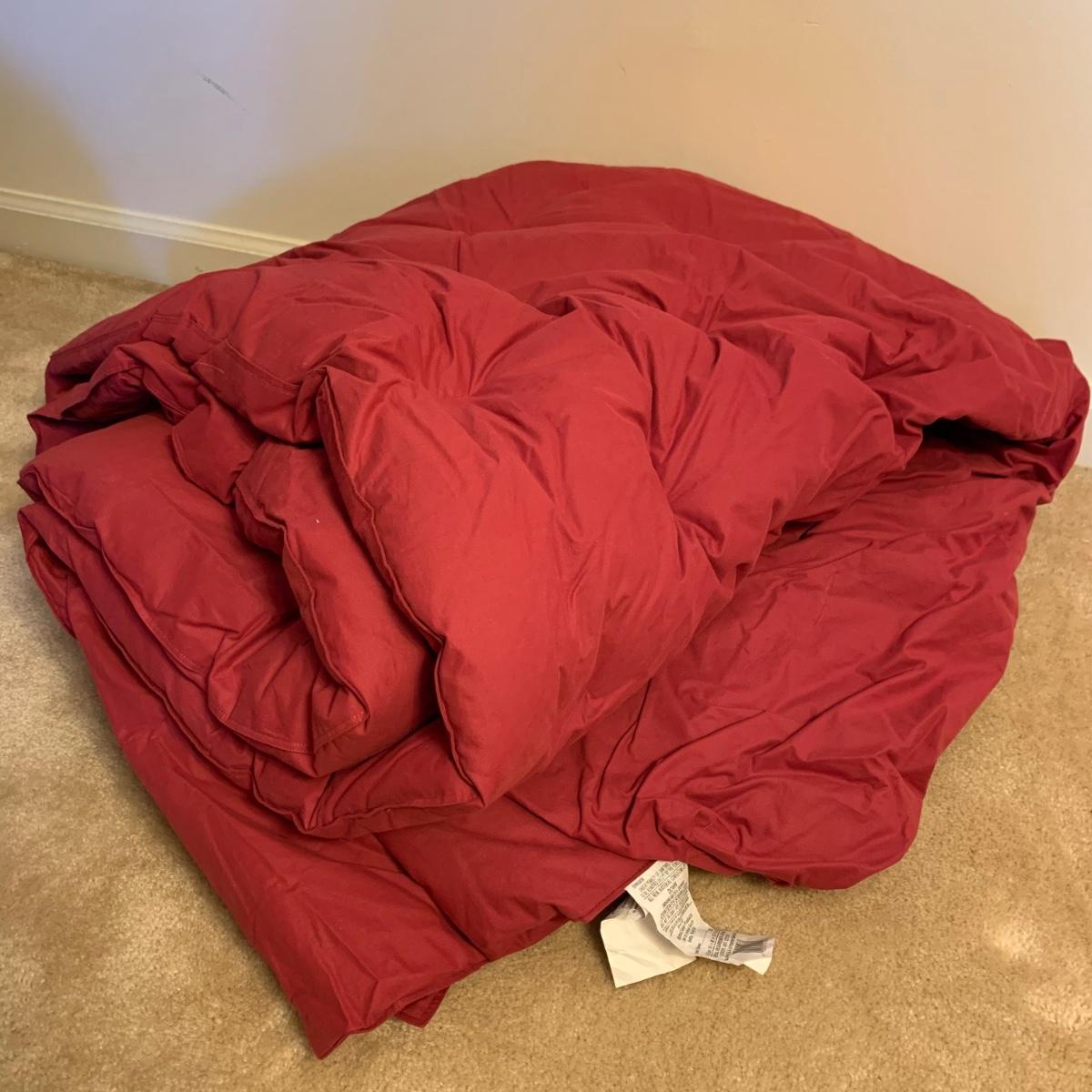 This lot contains a variety of blankets and related items. There is an L.L. Bean deep red king size cotton matelassé sham and bedspread set, a red king size down duvet, three blankets, and a striped sateen duvet cover. The shams appear to be unused in their original packaging. The matching bedspread has a small pair of holes from a safety pin. There is no size label found on the duvet cover, but it is quite large and appears to be king size. The red quilted blanket’s tag has been removed. It has some fuzz on it that appears to be from another blanket as it is removable; it is not pilled. The tan blanket is Egyptian cotton and very soft and it is approximately 92” x 92”.