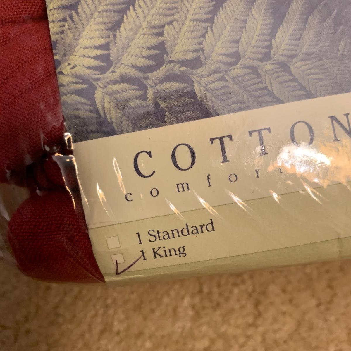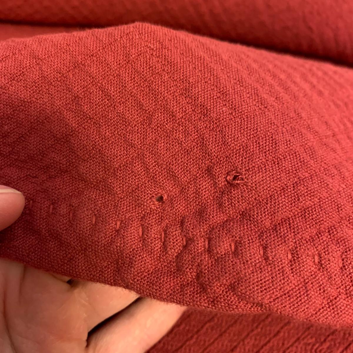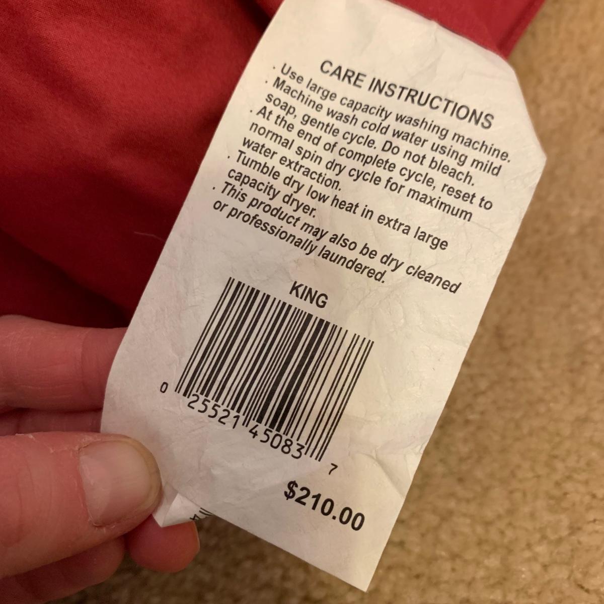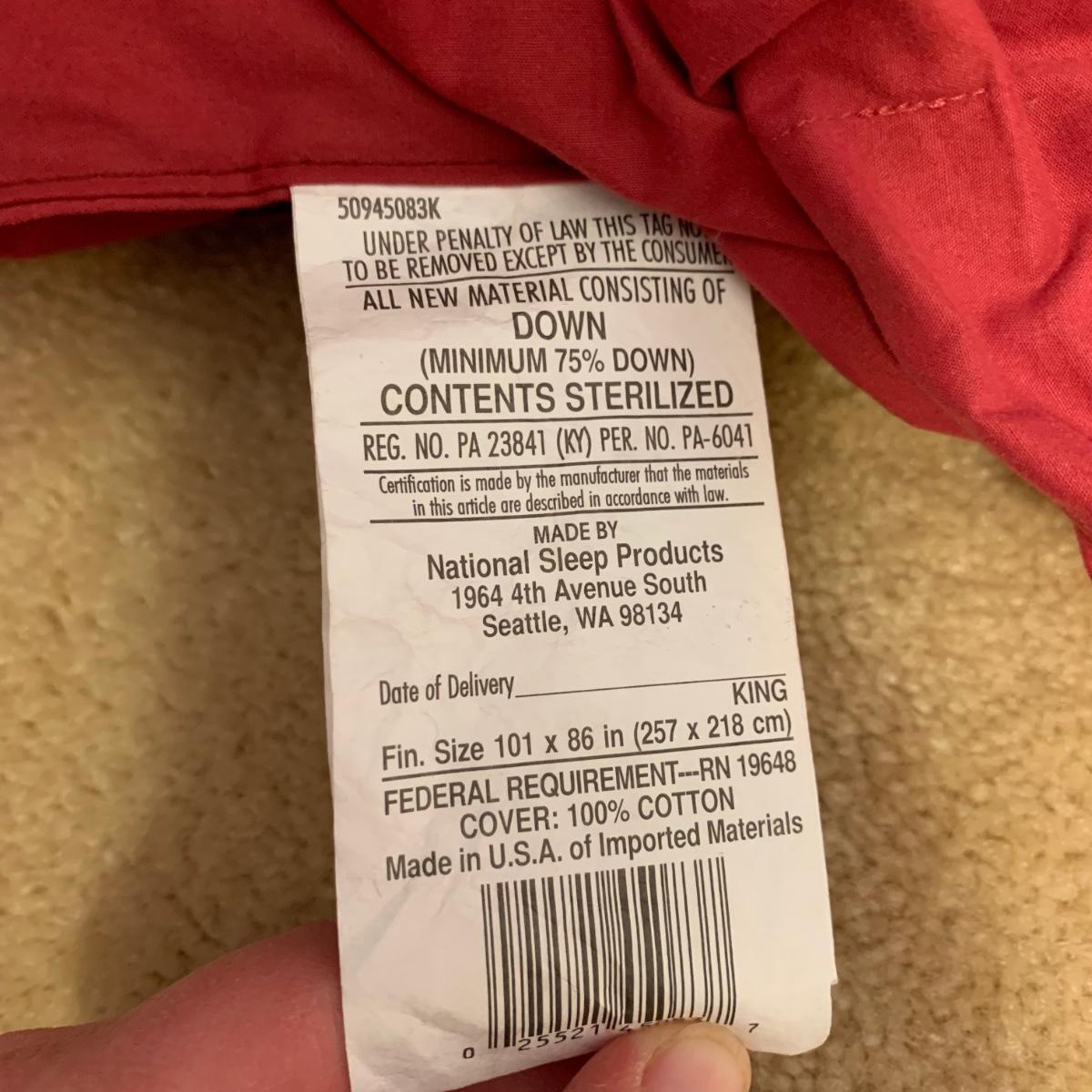 This lot contains a variety of blankets and related items. There is an L.L. Bean deep red king size cotton matelassé sham and bedspread set, a red king size down duvet, three blankets, and a striped sateen duvet cover. The shams appear to be unused in their original packaging. The matching bedspread has a small pair of holes from a safety pin. There is no size label found on the duvet cover, but it is quite large and appears to be king size. The red quilted blanket’s tag has been removed. It has some fuzz on it that appears to be from another blanket as it is removable; it is not pilled. The tan blanket is Egyptian cotton and very soft and it is approximately 92” x 92”.