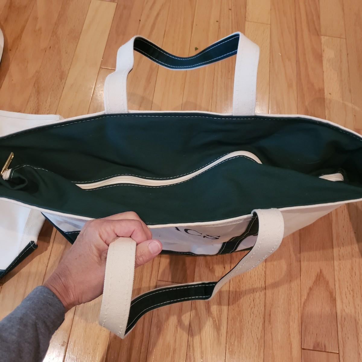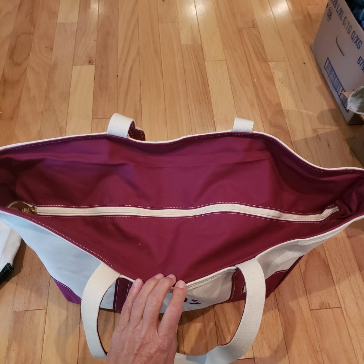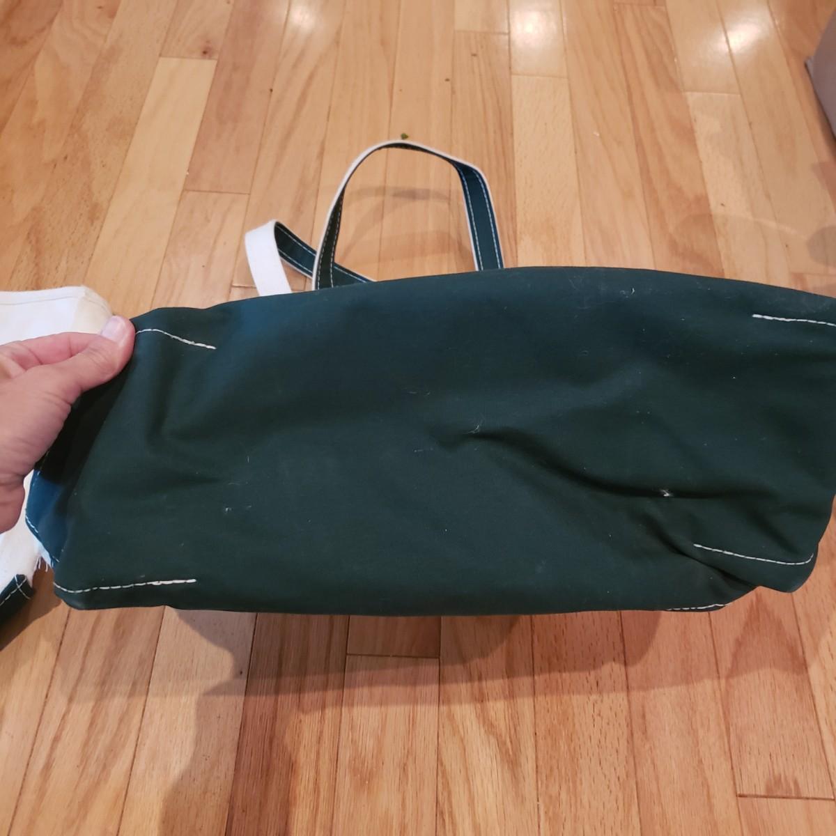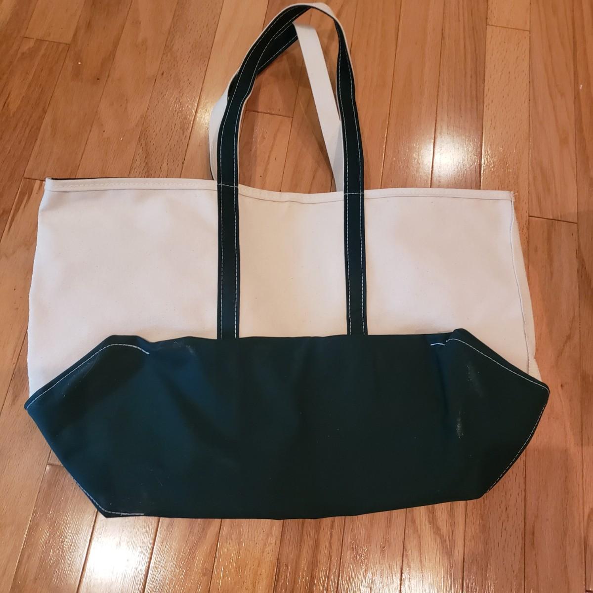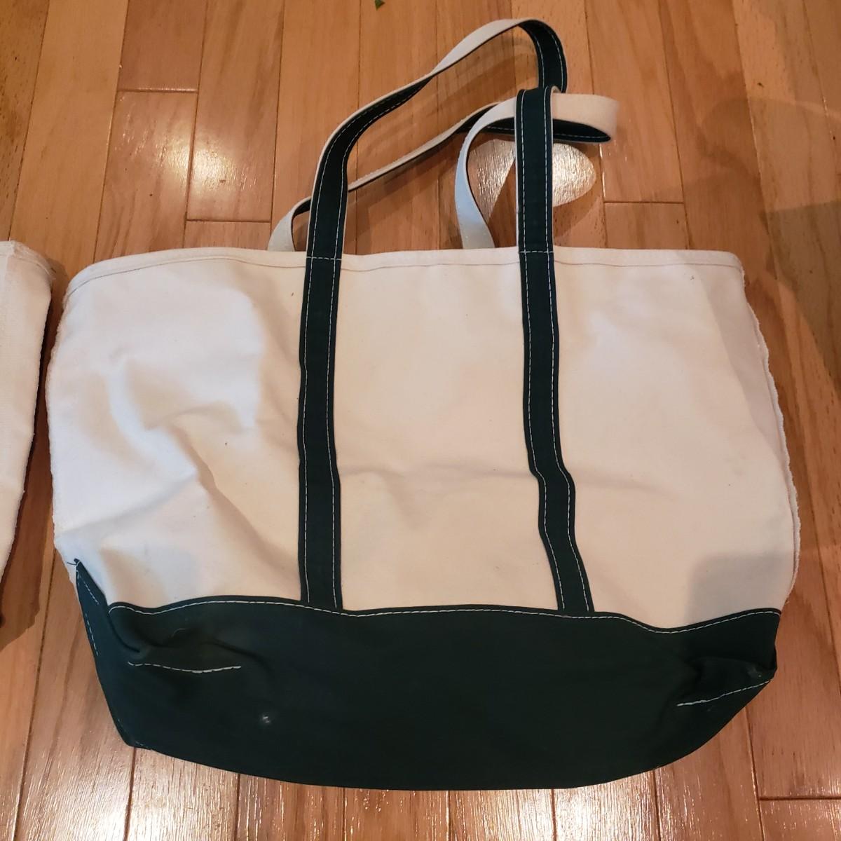There are four identcal in style L.L.Bean canvas bags in this lot, two large bags and two extra large bags. All bags have a zipper up top that can receed inside or for more capacity push up, as seen in the last picture. The blue/cream bag (EAS) and the green/cream bag (ACS) are the same size, 22" x 7" x 15"H. The red/cream (EAS) and green/cream (ACS) bags measure 24" x 9" x 17"H. The canvas is a heavy duty, thick material.