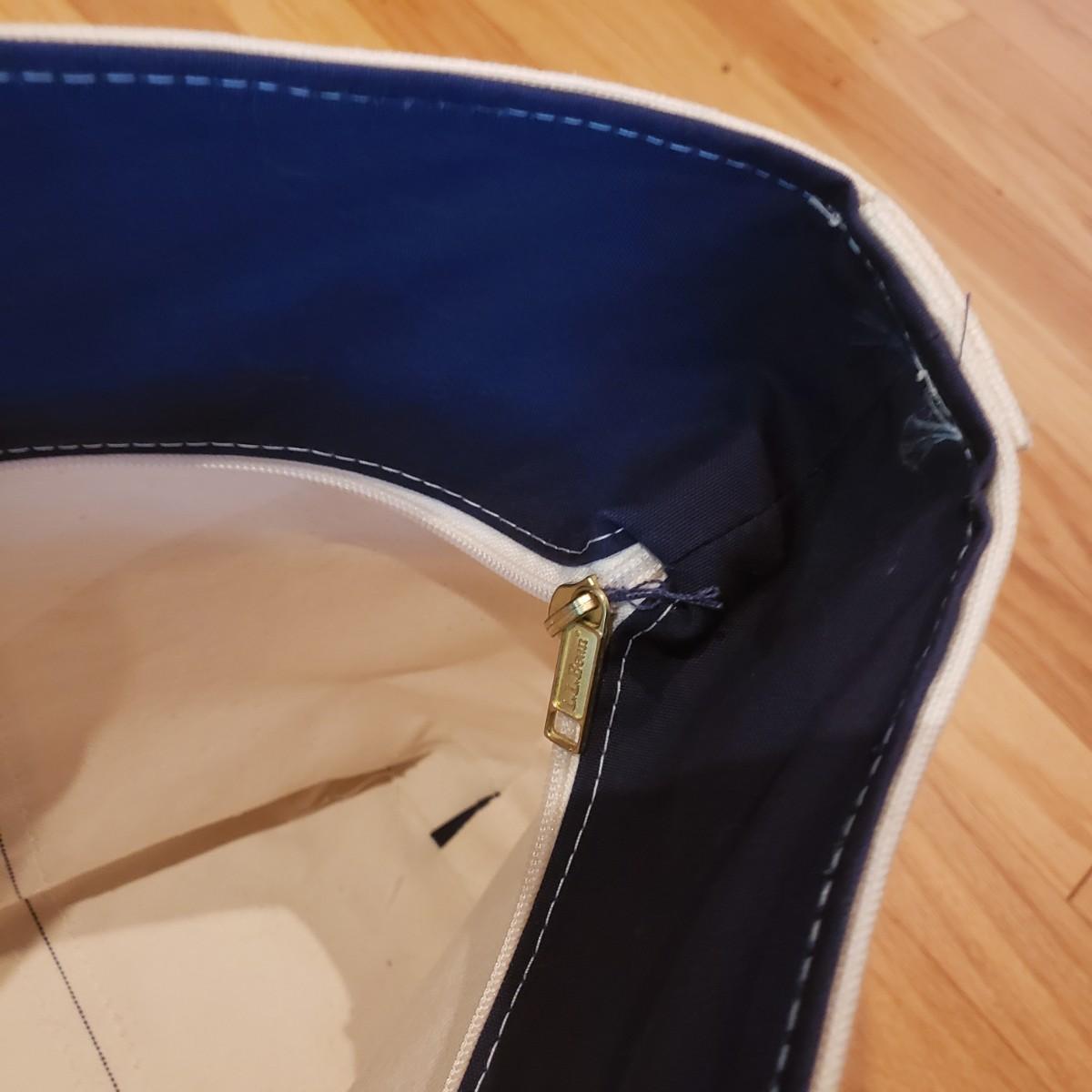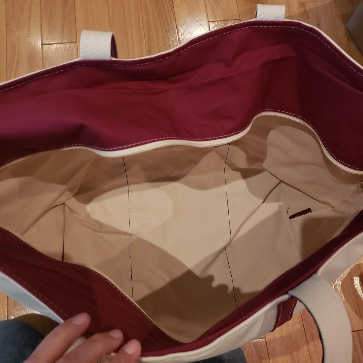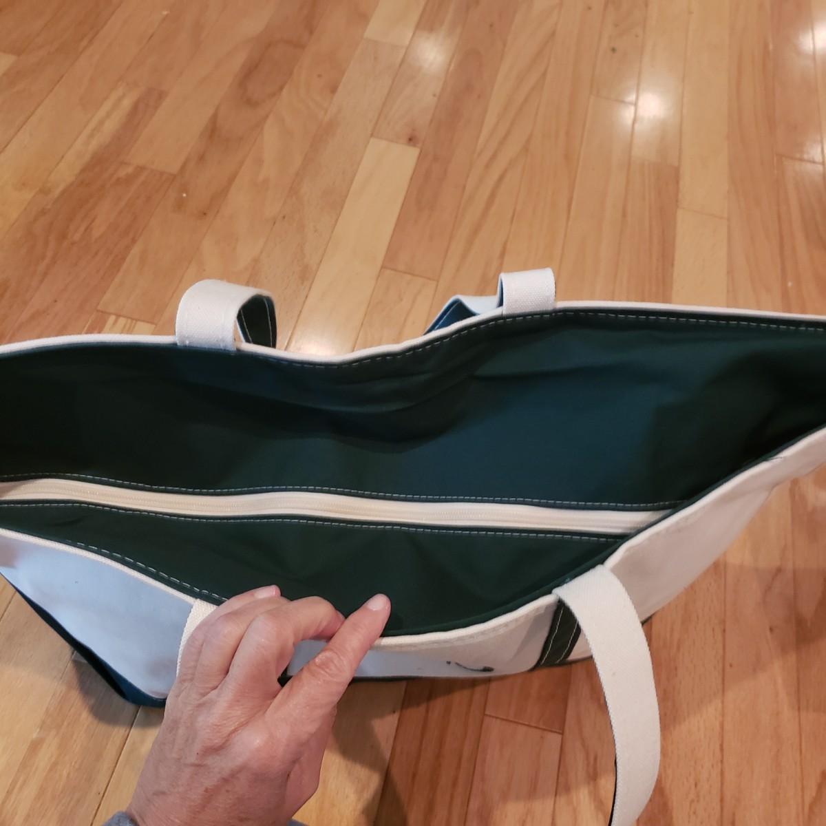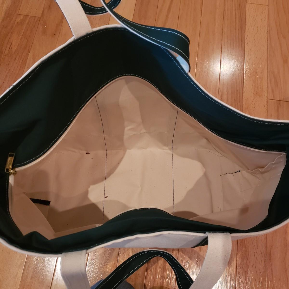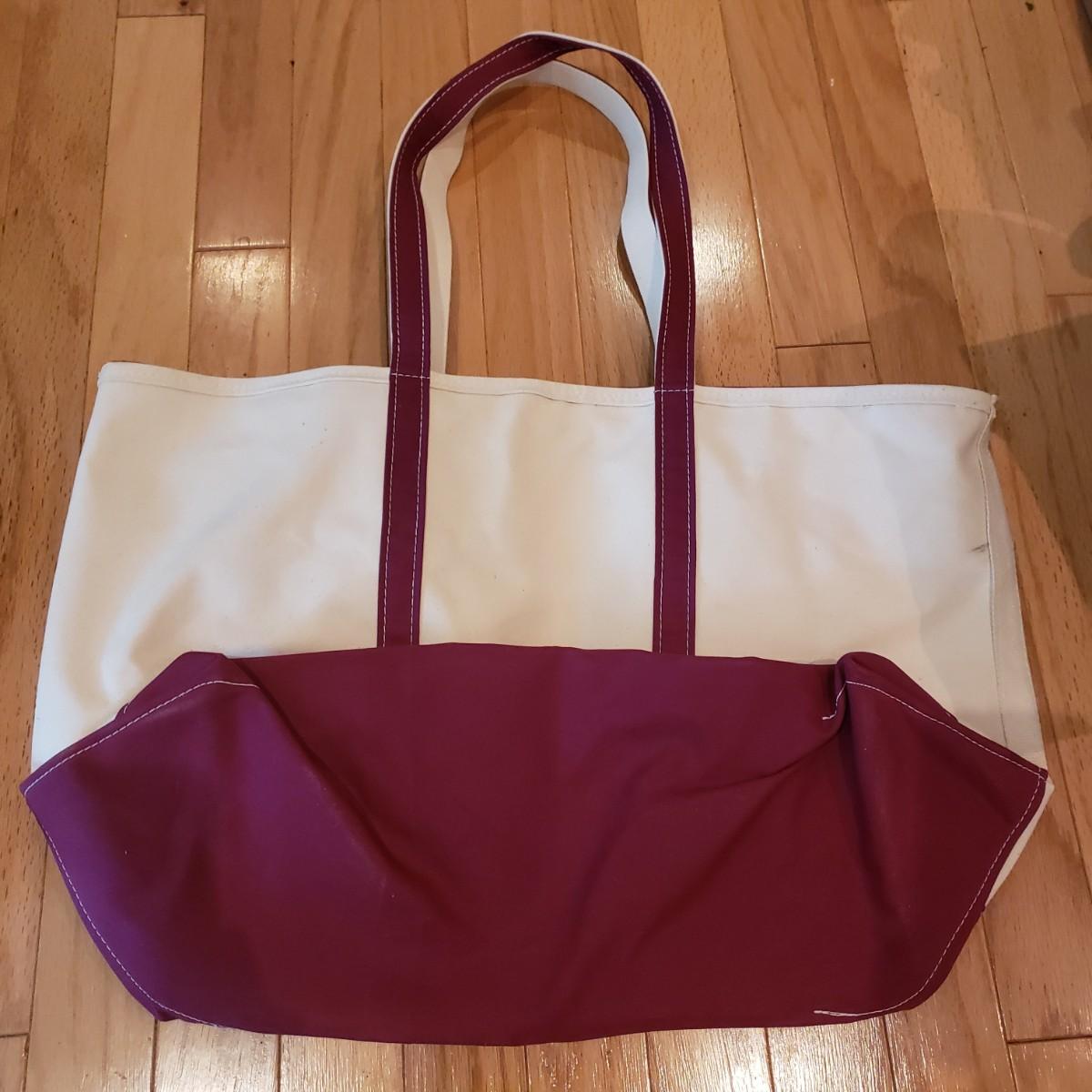 There are four identcal in style L.L.Bean canvas bags in this lot, two large bags and two extra large bags. All bags have a zipper up top that can receed inside or for more capacity push up, as seen in the last picture. The blue/cream bag (EAS) and the green/cream bag (ACS) are the same size, 22" x 7" x 15"H. The red/cream (EAS) and green/cream (ACS) bags measure 24" x 9" x 17"H. The canvas is a heavy duty, thick material.