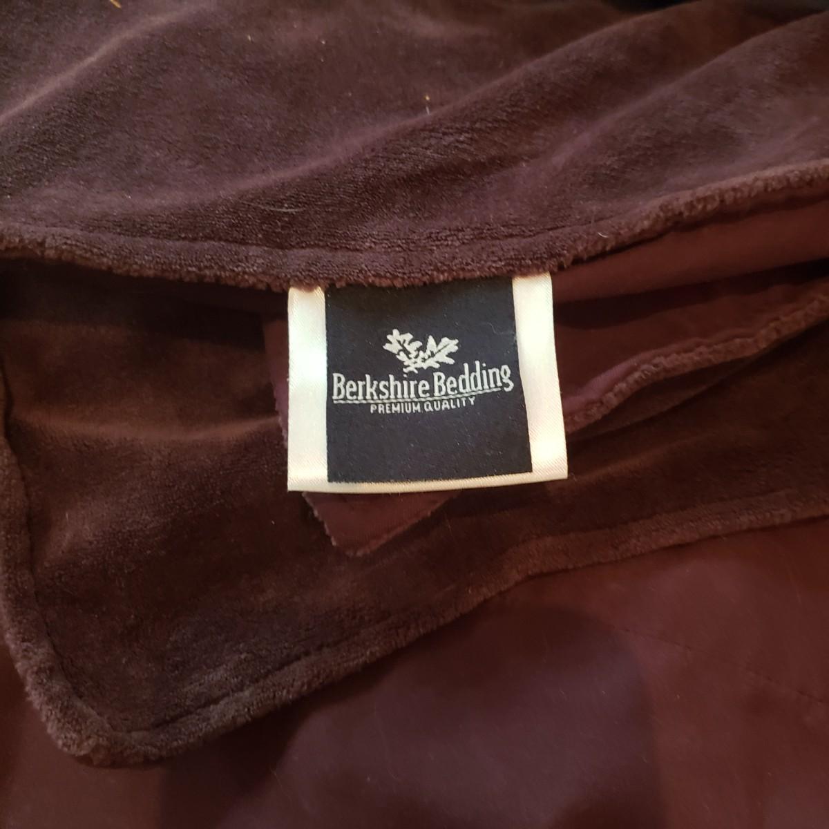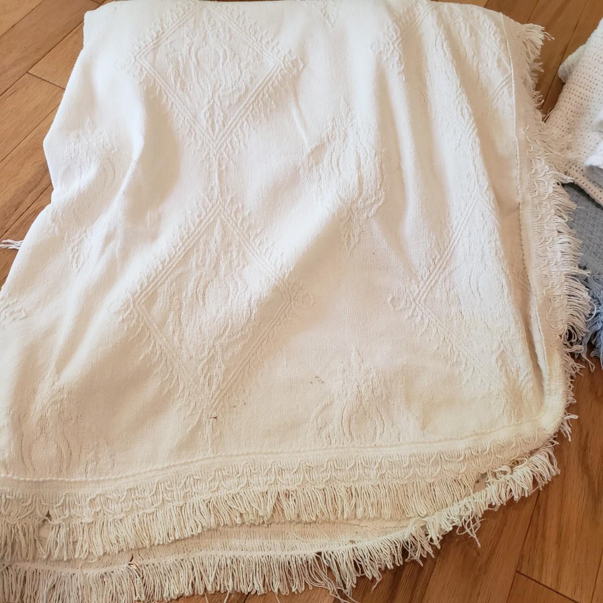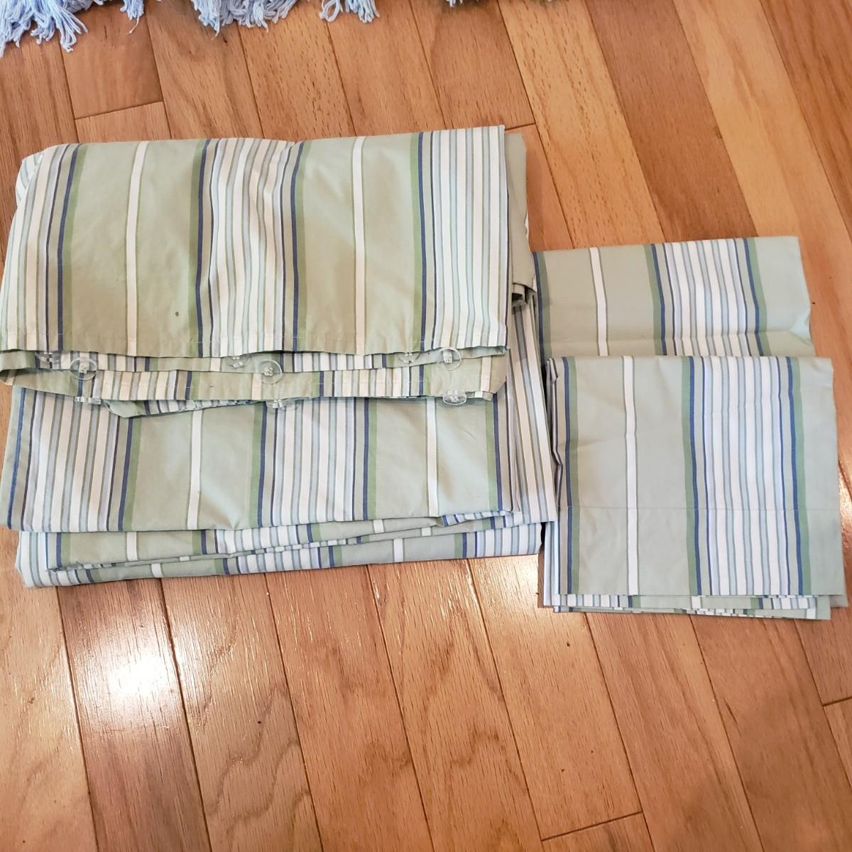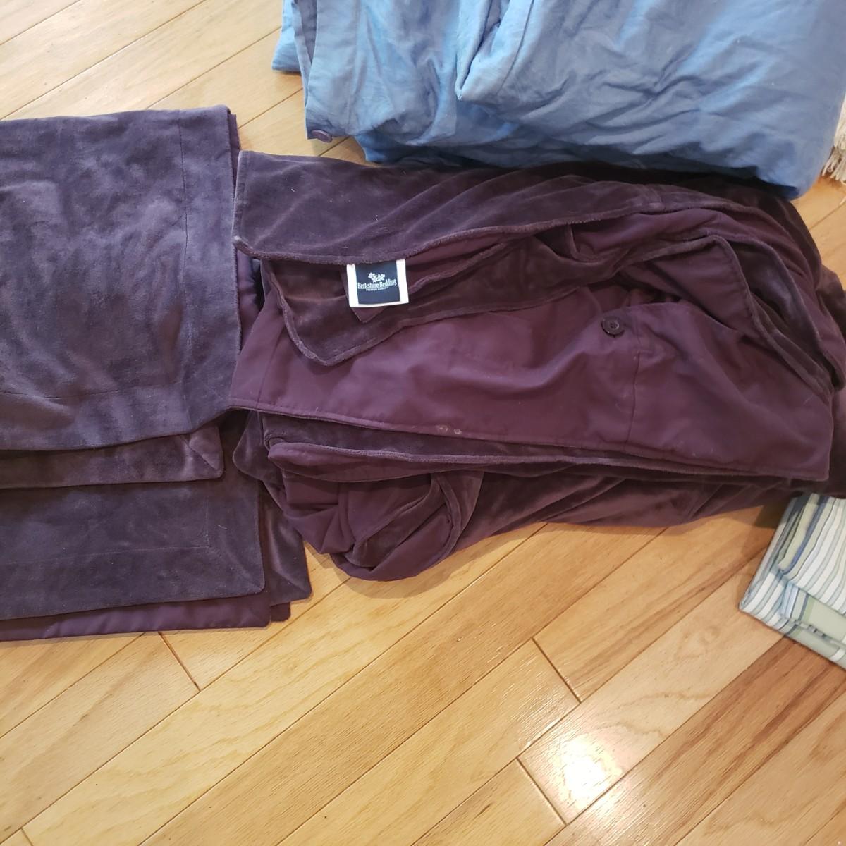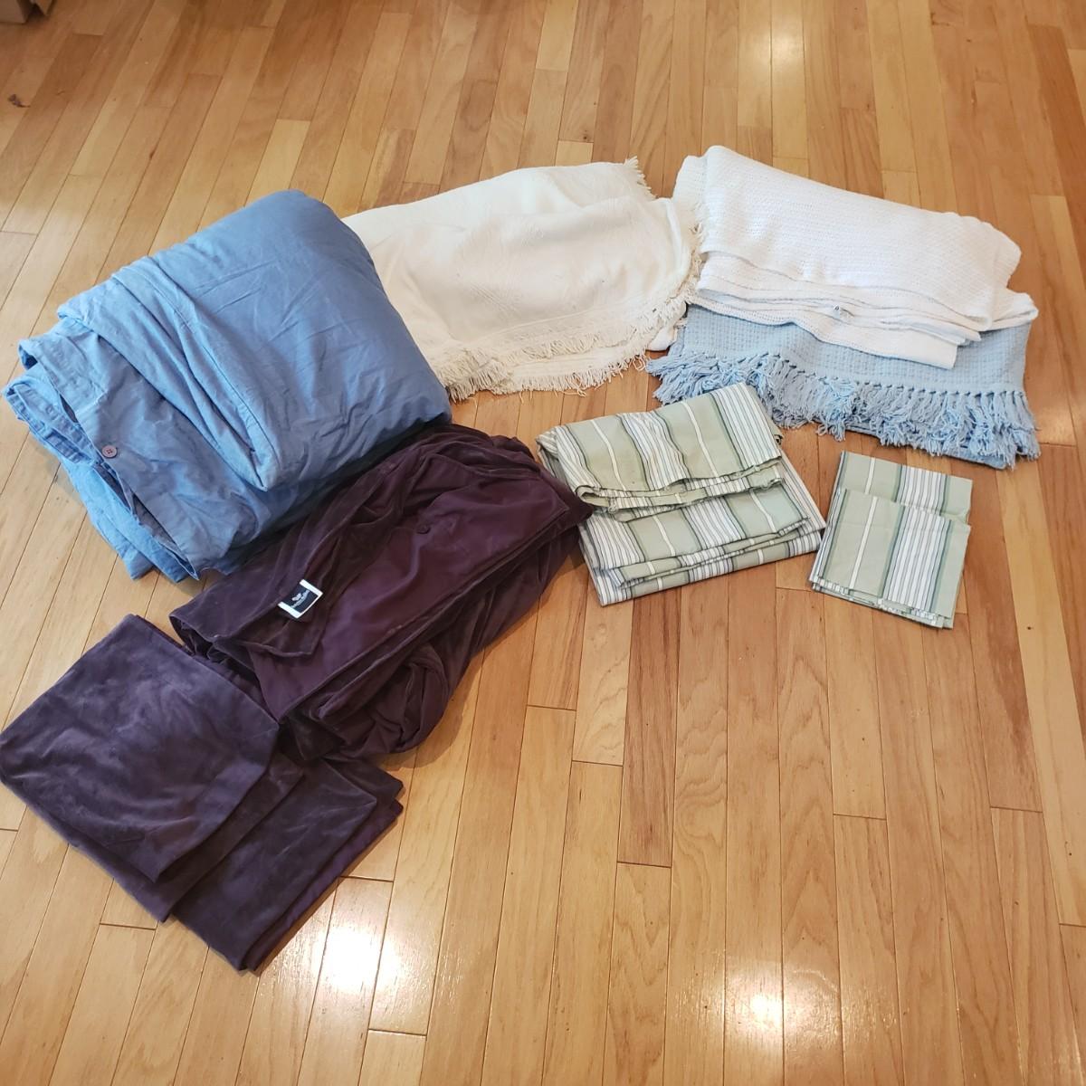 This double size bedding lot features three duvet covers, down comforter, pillow shams, a bedspread, blanket and throw blanket. The purple crushed velvet duvet by Berkshire Bedding comes with two pillow shams. It's super soft! The blue, cotton with a paisley print on it has a navy blue down comforter inside. The L.L. Bean duvet cover and two pillow shams have green and blue stripes and is 100% cotton. There is a cream colored cotton, fringed bedspread. There is a spot on the bottom corner, see picture. Lastly are two cotton blankets. The white one, by Cannon is a double size and the light blue is a throw style.