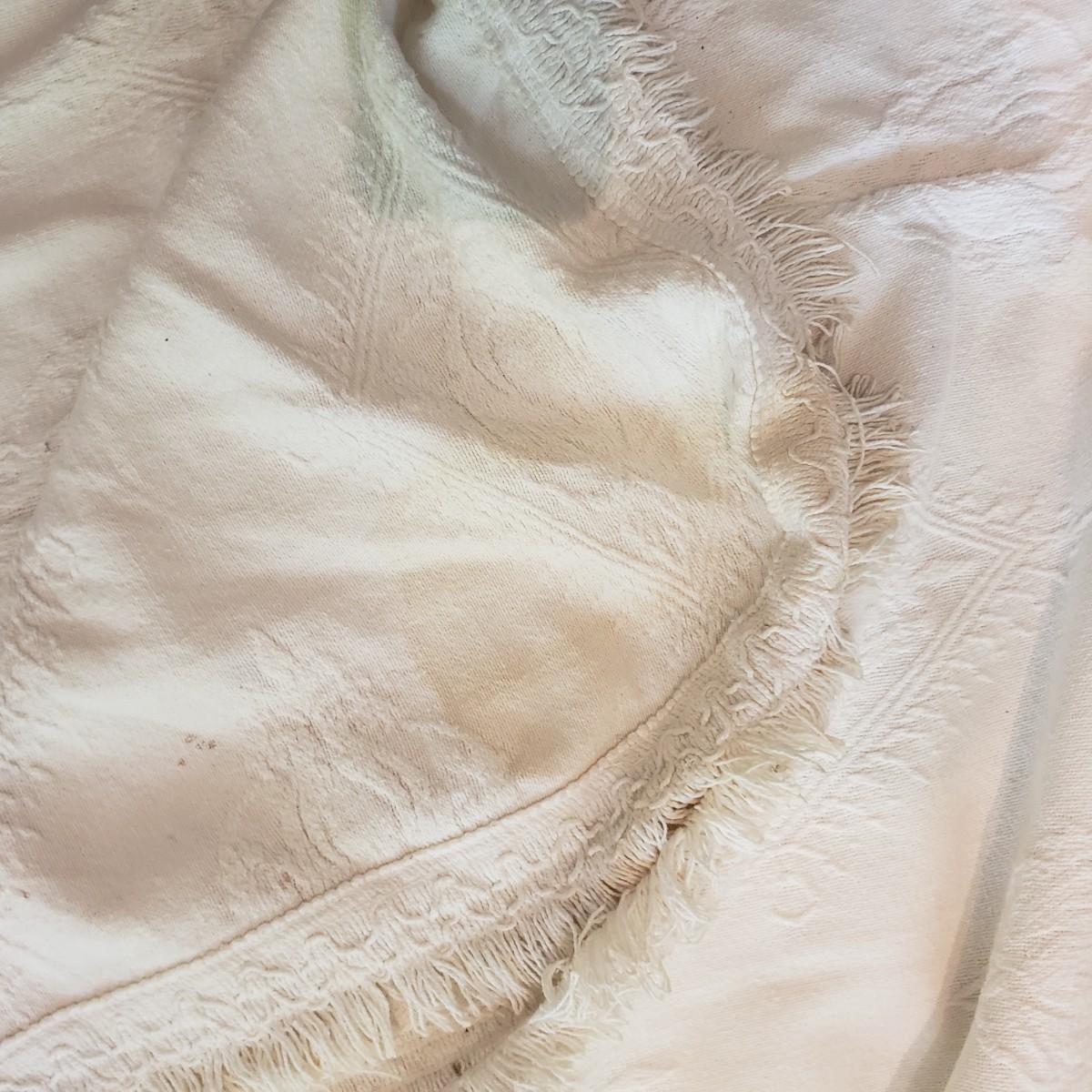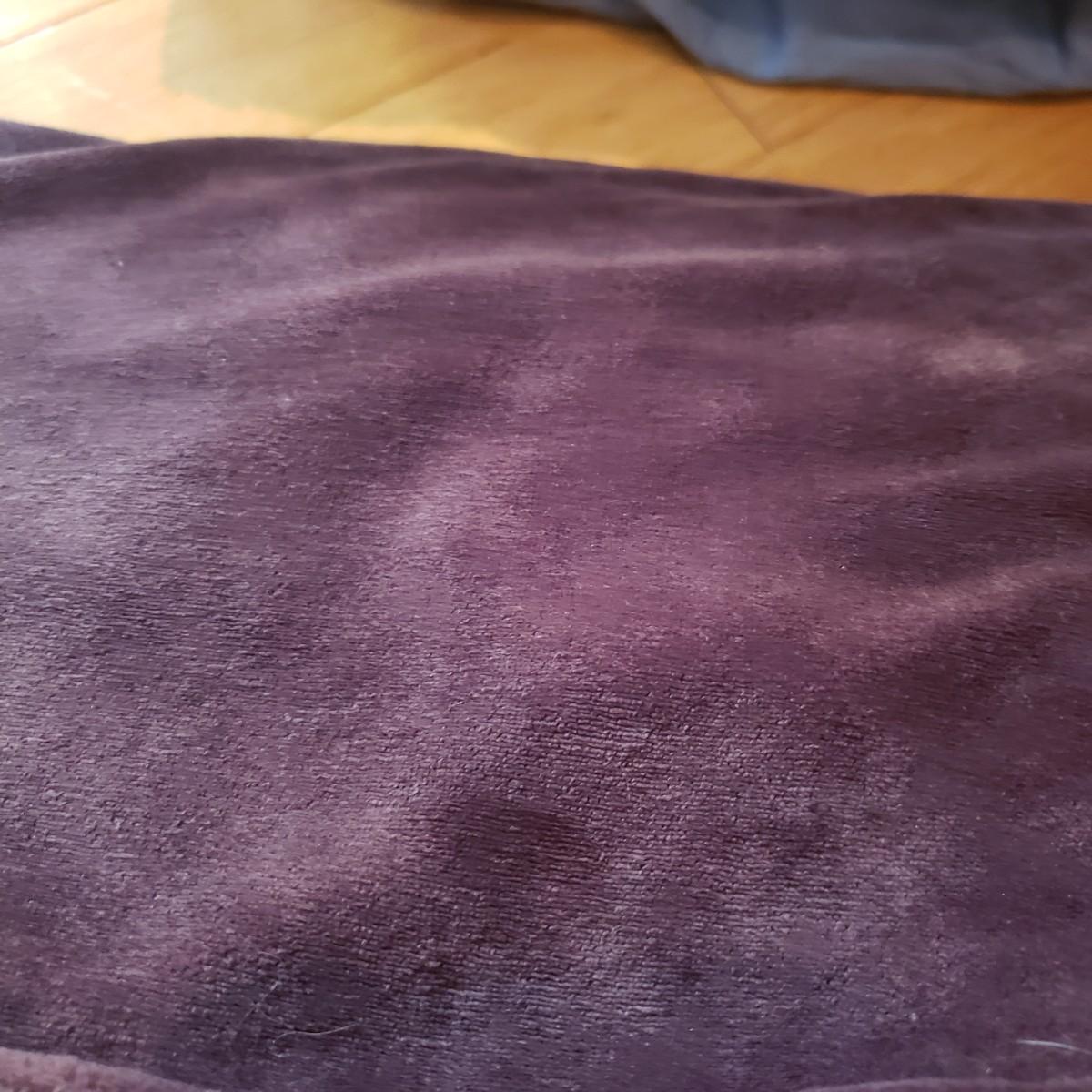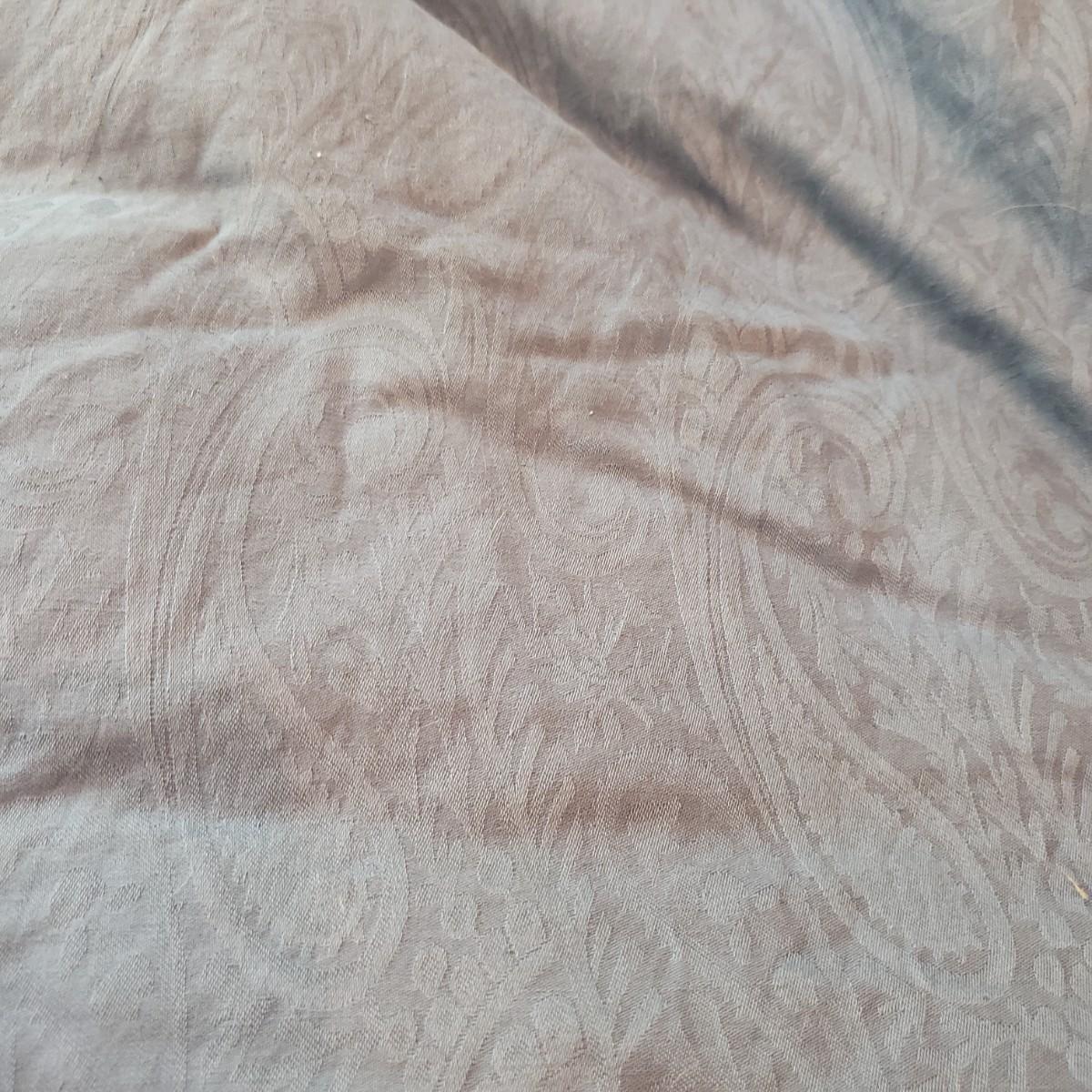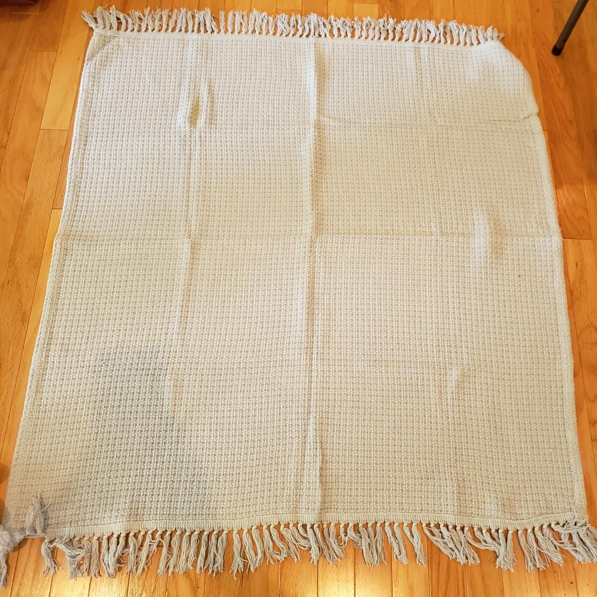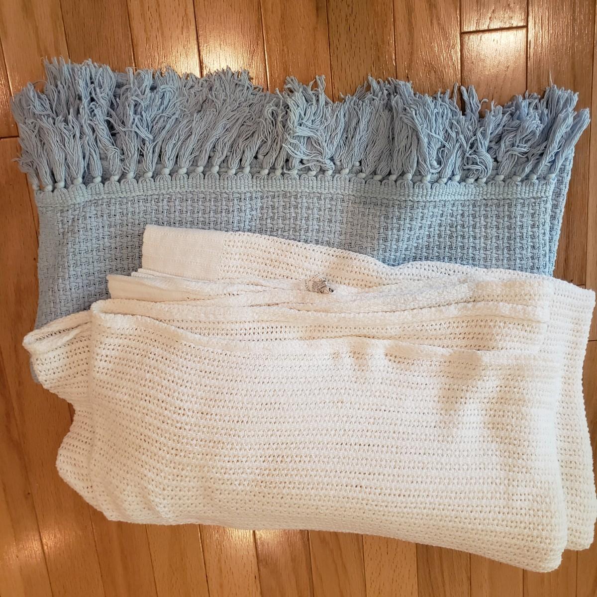 This double size bedding lot features three duvet covers, down comforter, pillow shams, a bedspread, blanket and throw blanket. The purple crushed velvet duvet by Berkshire Bedding comes with two pillow shams. It's super soft! The blue, cotton with a paisley print on it has a navy blue down comforter inside. The L.L. Bean duvet cover and two pillow shams have green and blue stripes and is 100% cotton. There is a cream colored cotton, fringed bedspread. There is a spot on the bottom corner, see picture. Lastly are two cotton blankets. The white one, by Cannon is a double size and the light blue is a throw style.