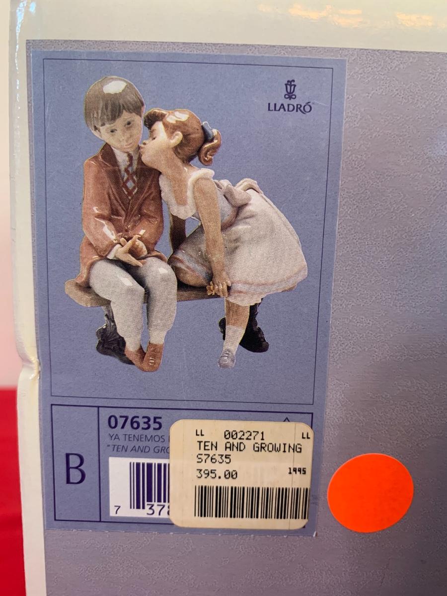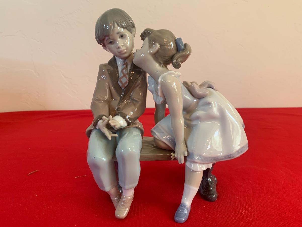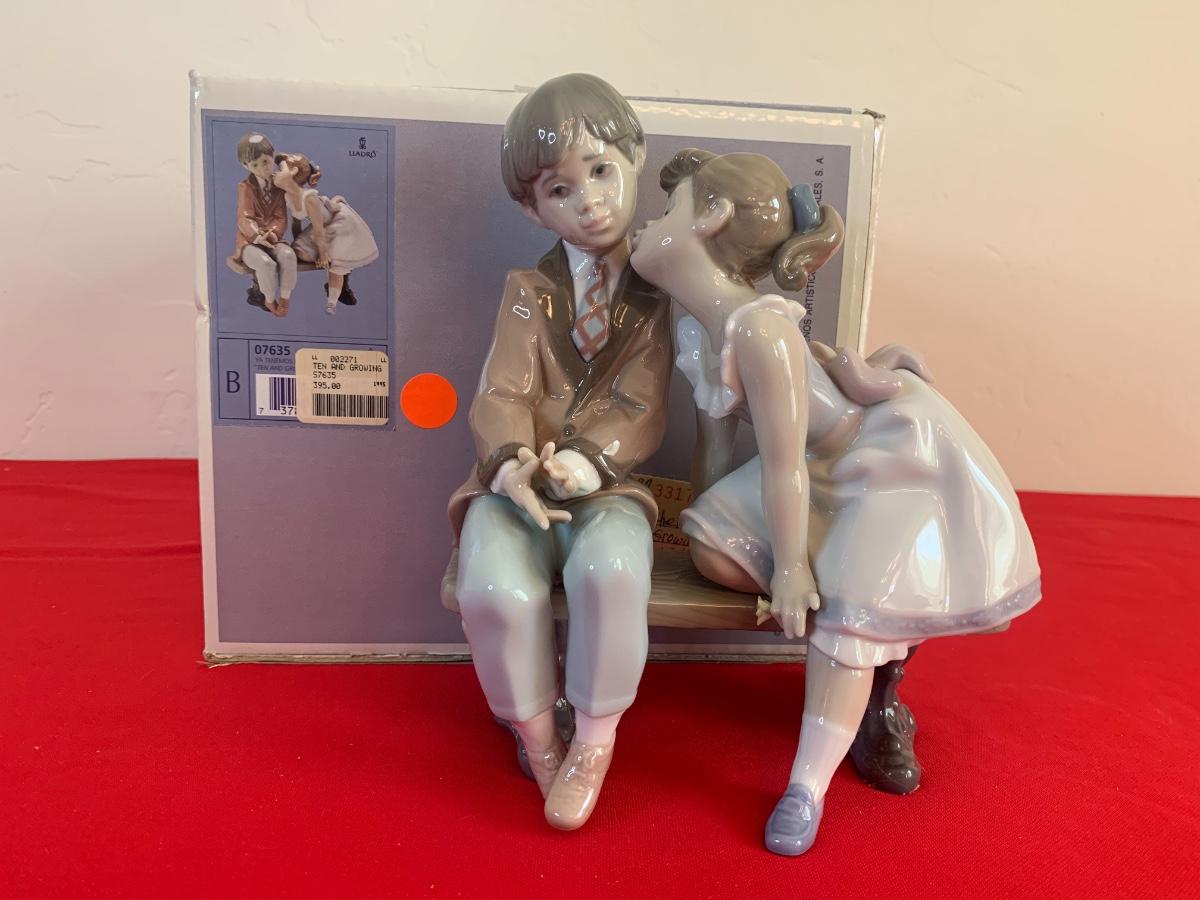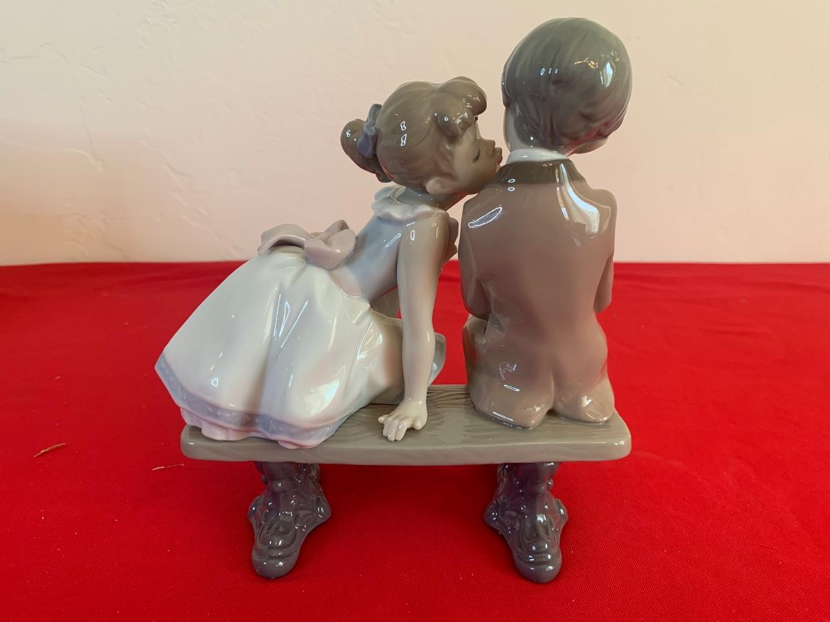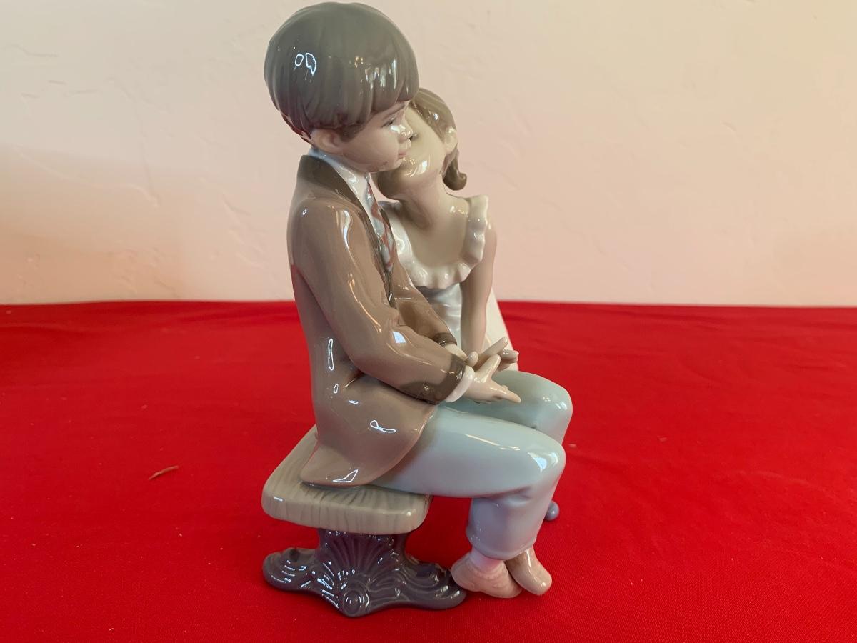 Lot includes a very nice Lladro figurine marked 07635, little girl kissing her crush. Very good condition, in original box.