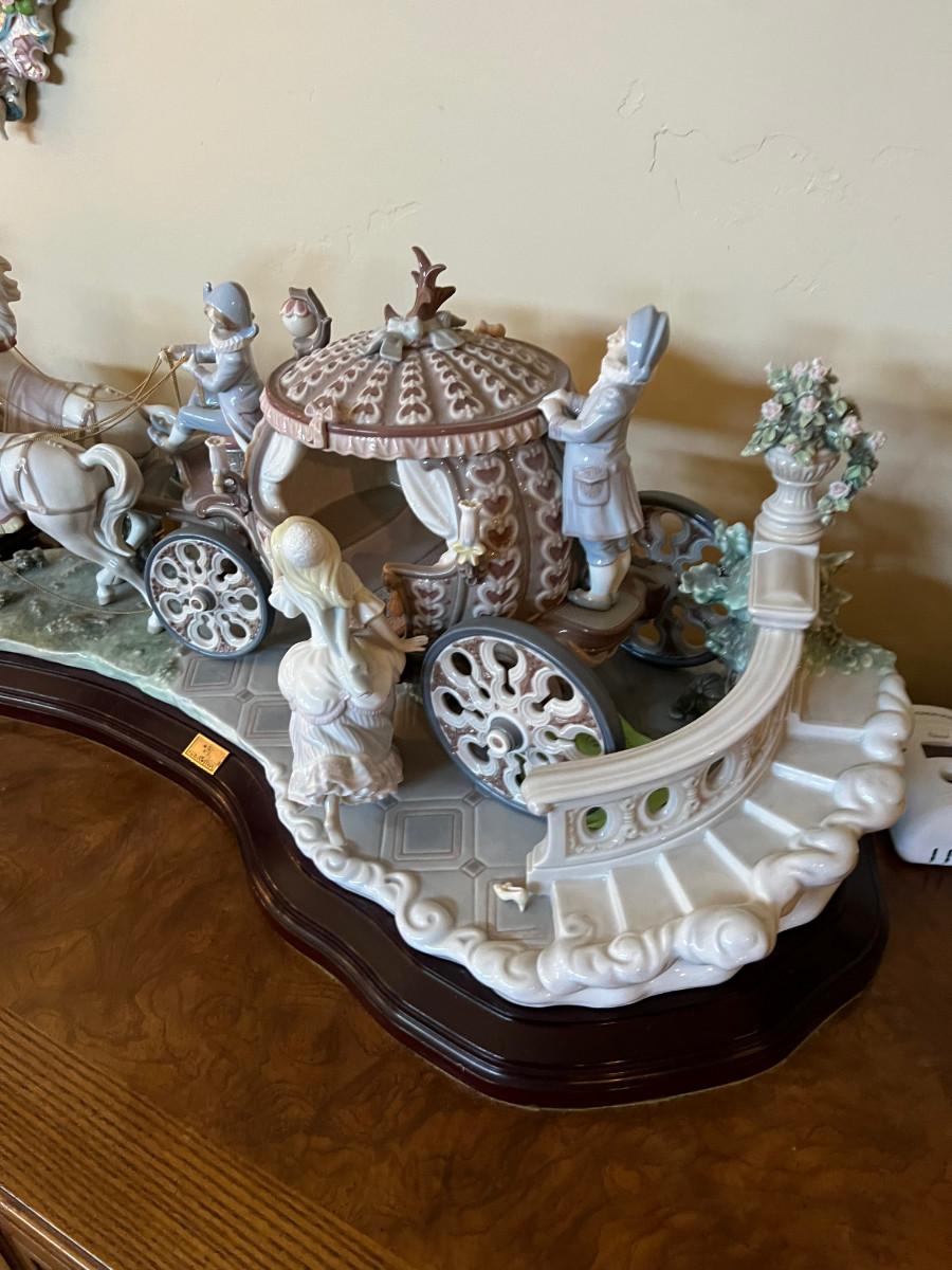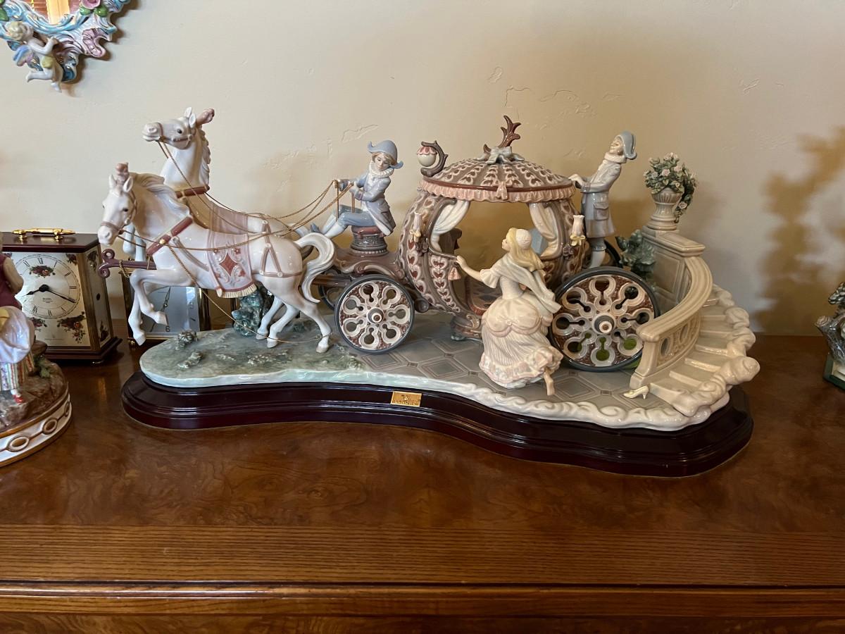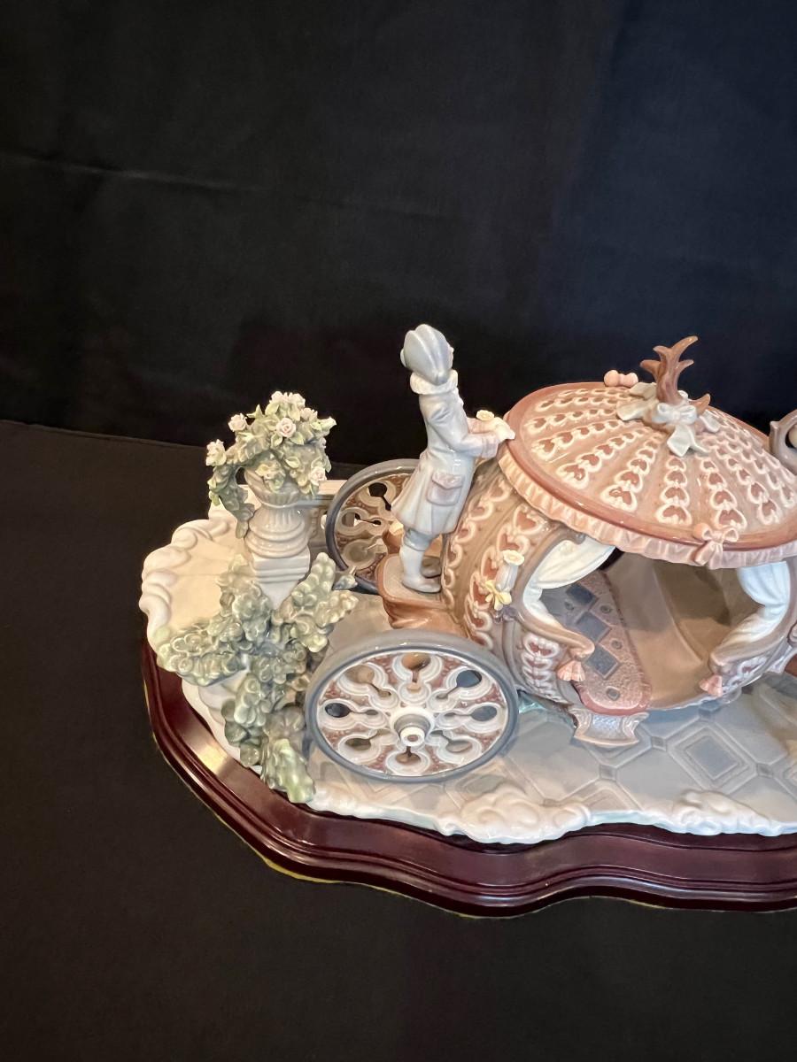 RARE SIGNED LLADRO 1493 CINDERELLA COACH AT THE STROKE OF TWELVE LTD ED RETIRED. Up for sale is this Pre-owned Lladro "Cinderella" At the Stroke of Twelve. Large Figurine w/ hardwood base. Please view all photos and description before you buy. Presented for your consideration is the most desirable LLADRO figure "At the Stroke of 12" depicting Cinderella losing her shoe as she tries to catch the coach. The Limited Edition of 1500 was introduced in 1986 and was sold out and retired in 1992. It was designed by Jose Roig. This sensational piece measures about 25" long, 11" high and the same across. The bottom has the signature of the artist "J. Ruiz" Jose Roig the Sculpture and is number 50 of only 1500 ever made. Comes with the original hardwood base. Item is in excellent condition no known damage or repairs. Unfortunately, we do not have the original box and if shipping is needed a boxing fee will be added.