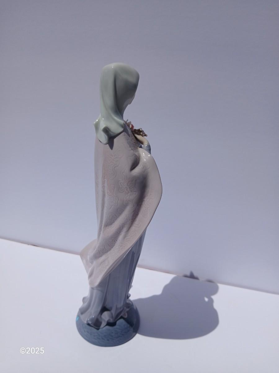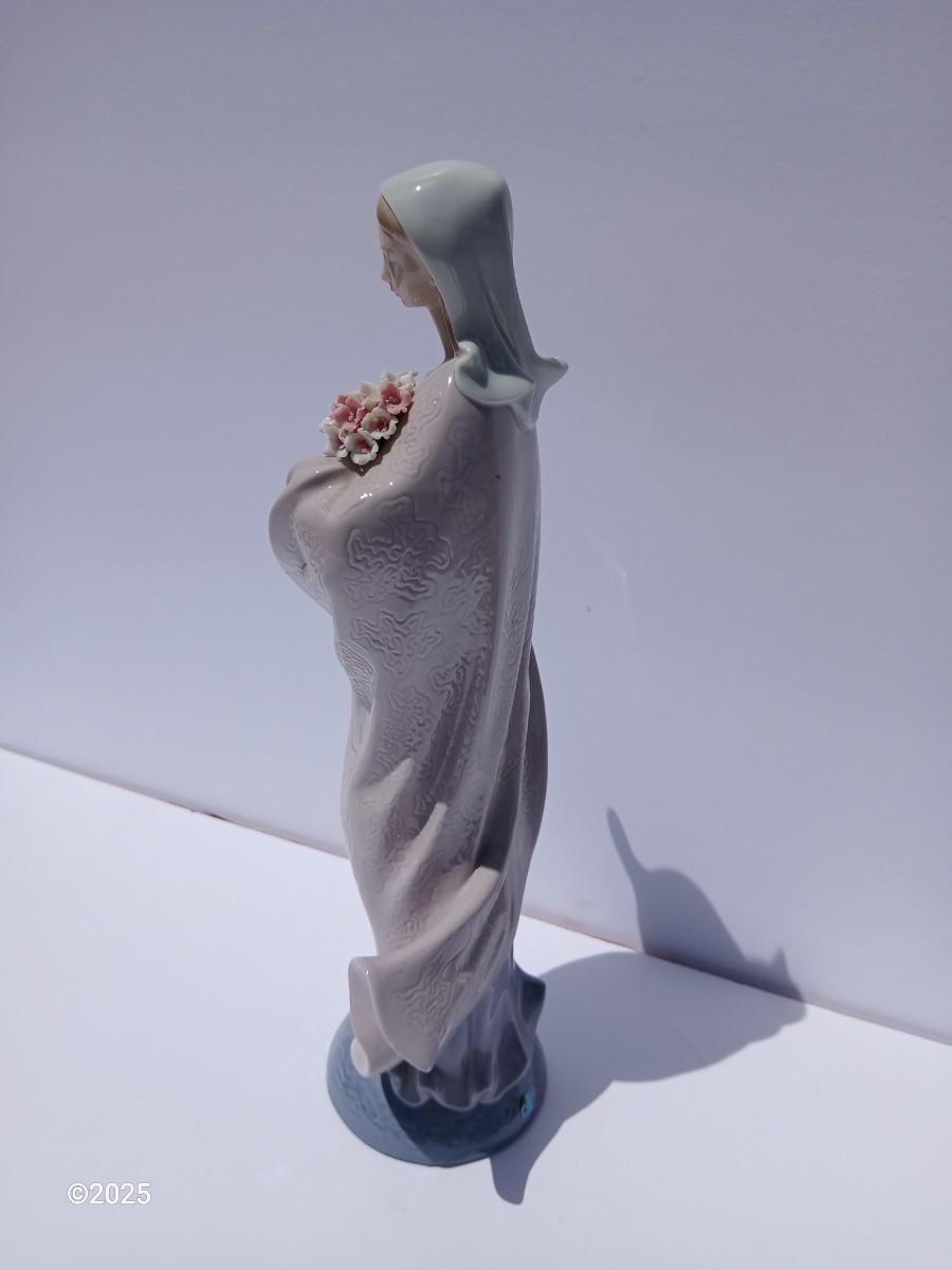 Graceful and serene, this exquisite Lladro porcelain figurine depicts the Madonna holding a delicate bouquet of flowers.