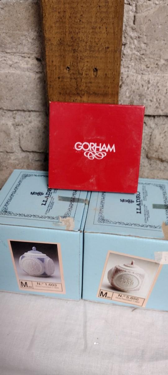 Pair of Lladro ornaments and a Gorham ornament new in their boxes. Gorham is 1992 annual sterling ornament.