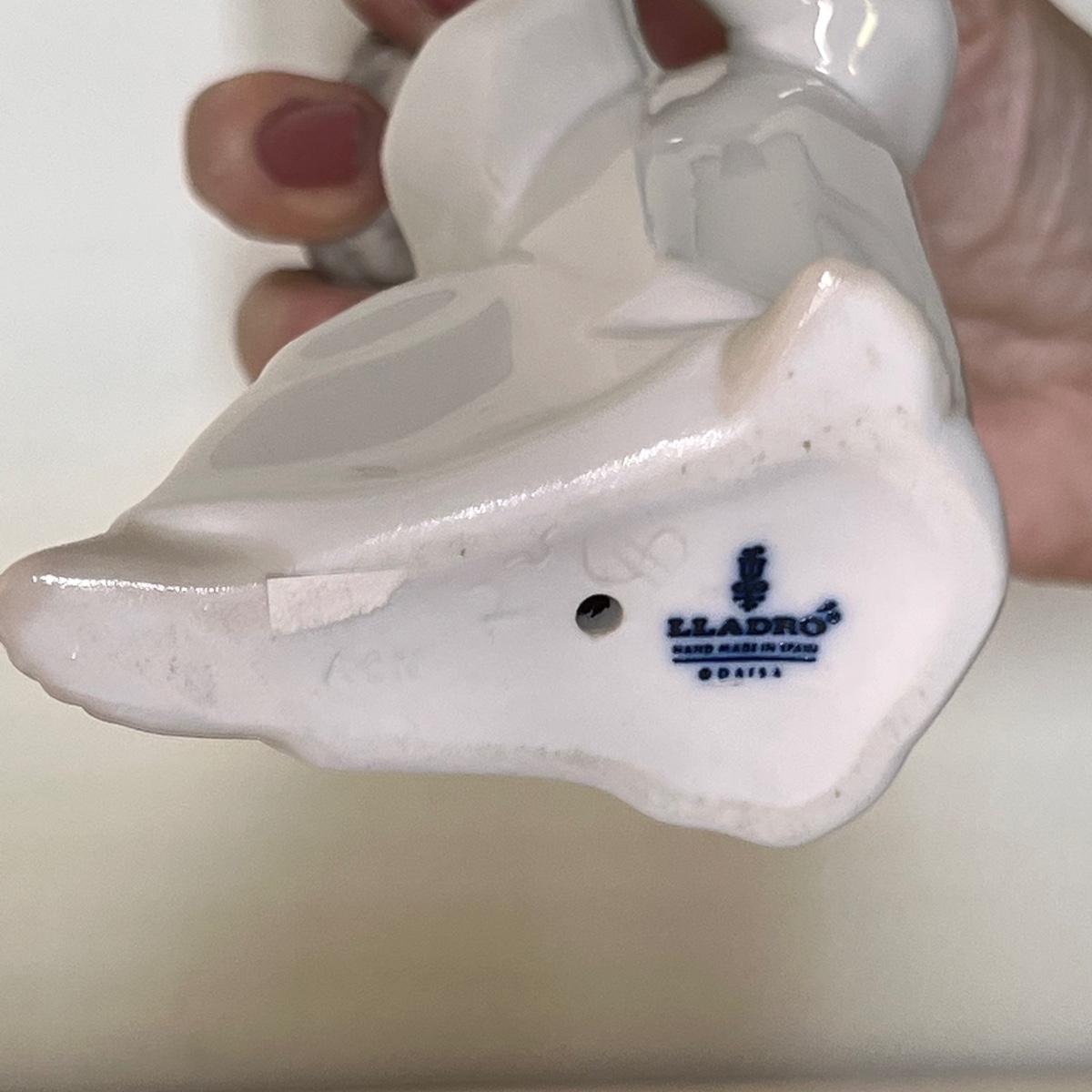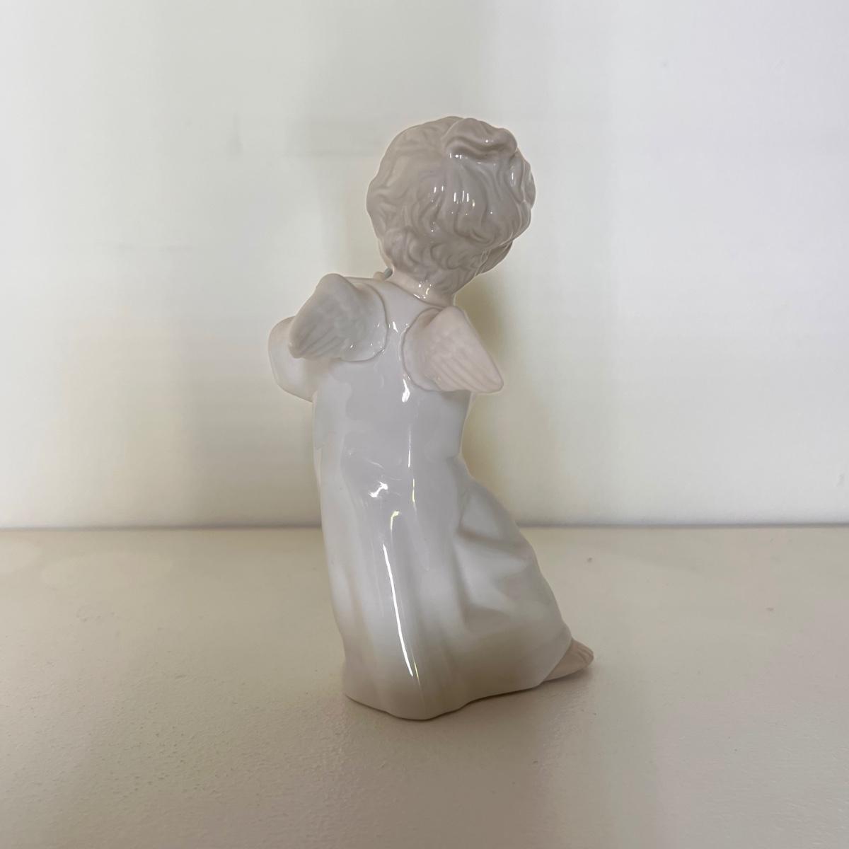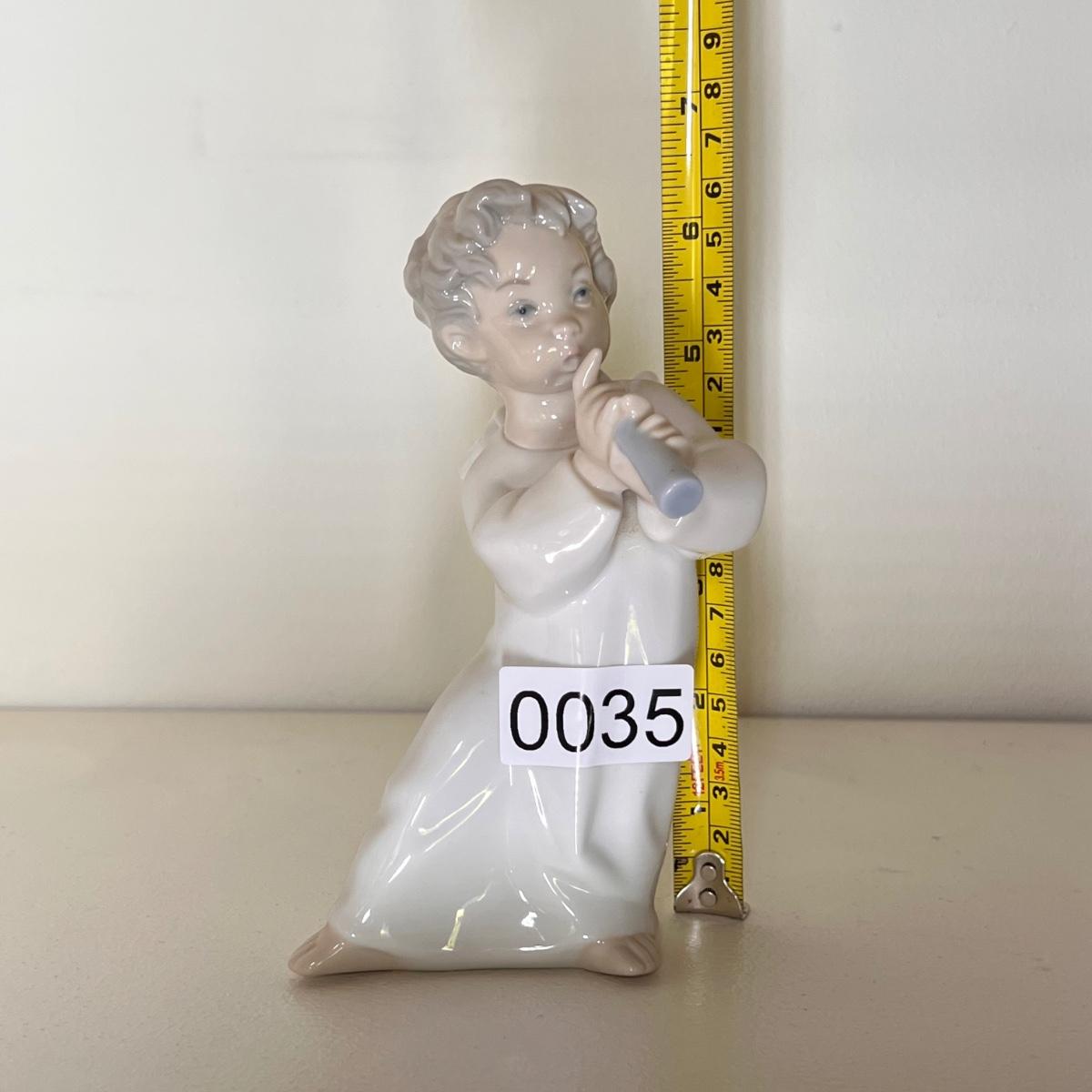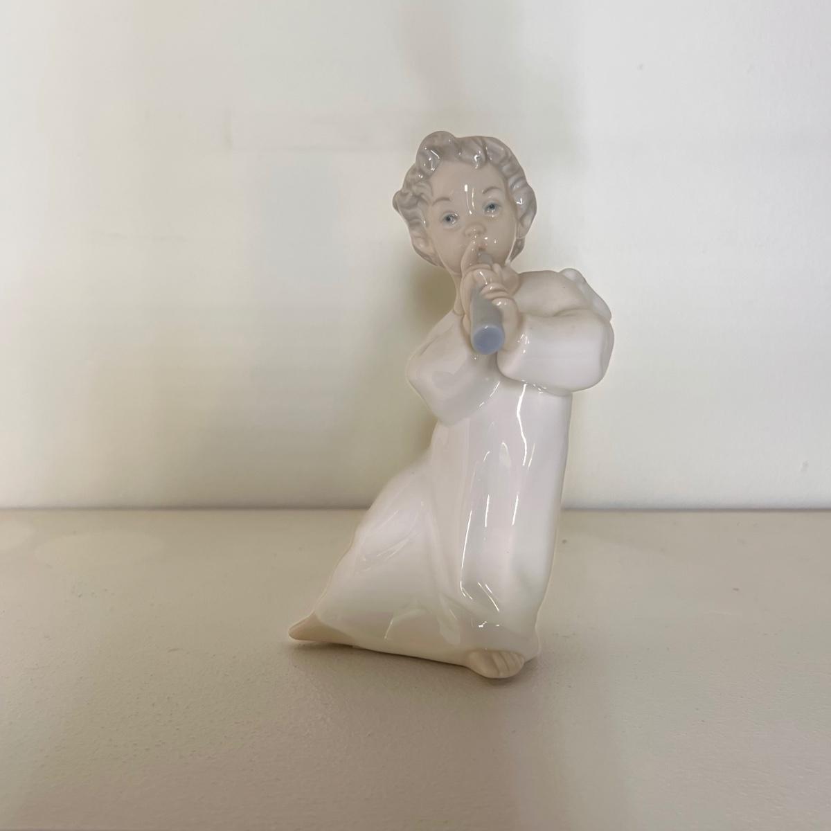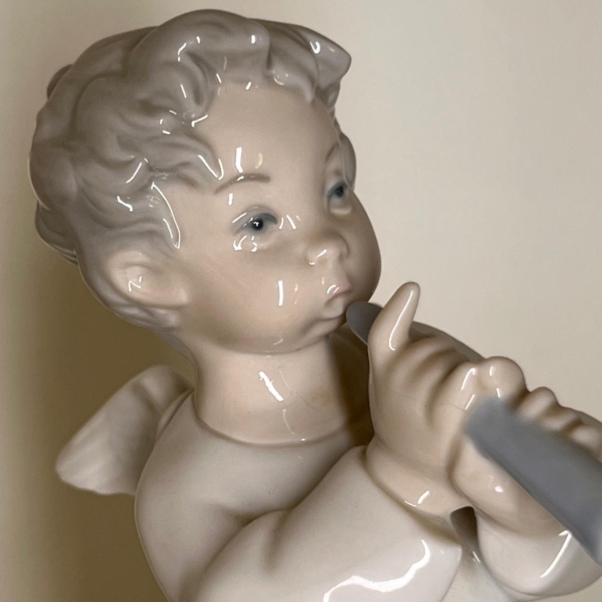Glossy porcelain angel figurine playing a flute. Holiday, christmas