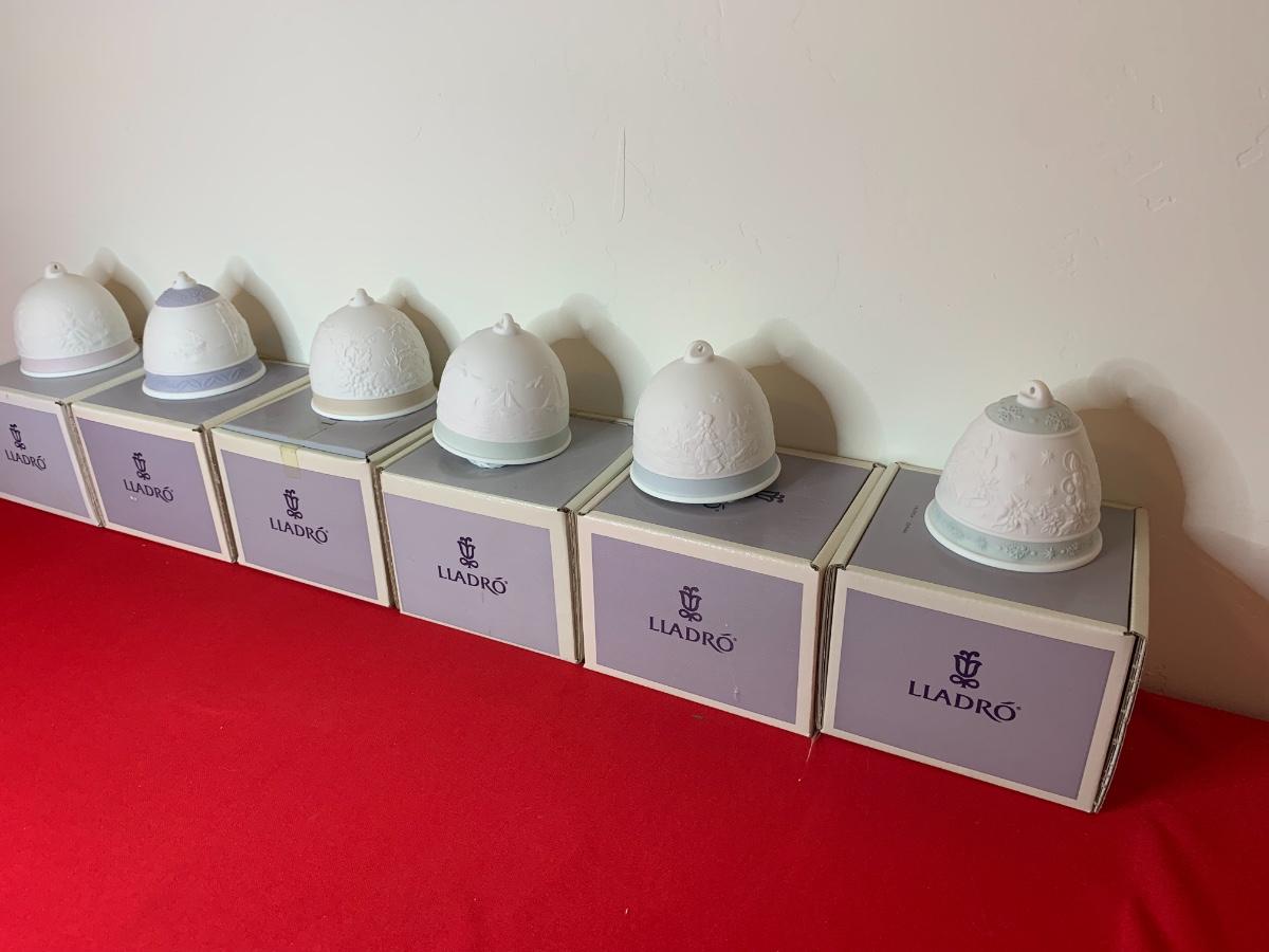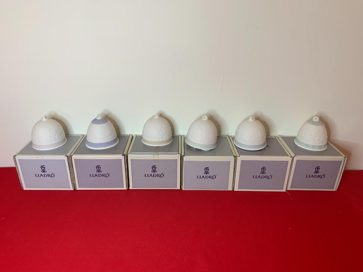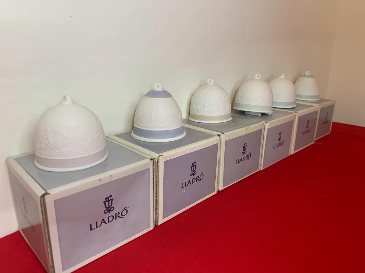 Lot includes 6 Lladro bells with pastel trim. Porcelain. Excellent condition, in original boxes.