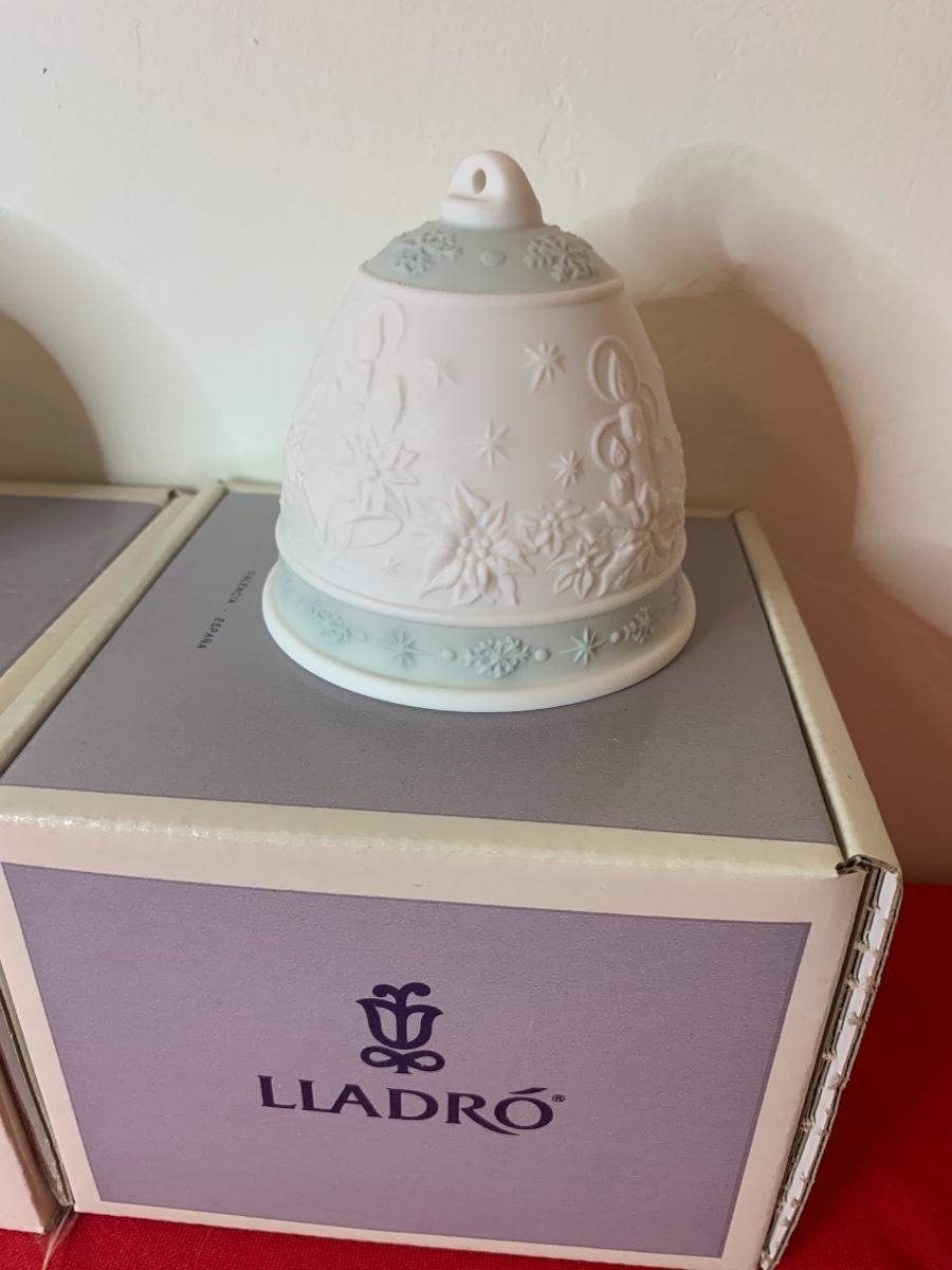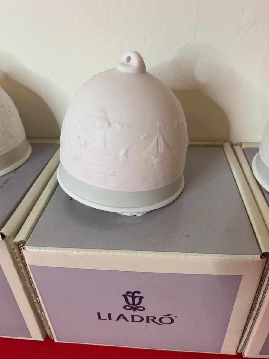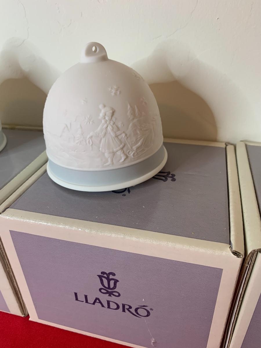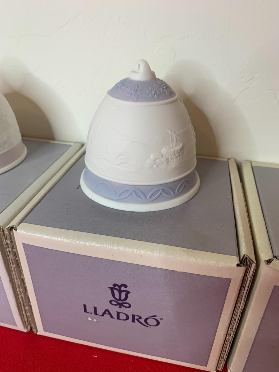 Lot includes 6 Lladro bells with pastel trim. Porcelain. Excellent condition, in original boxes.