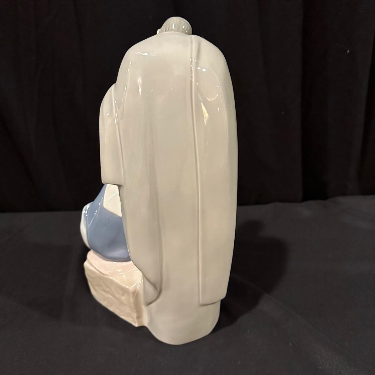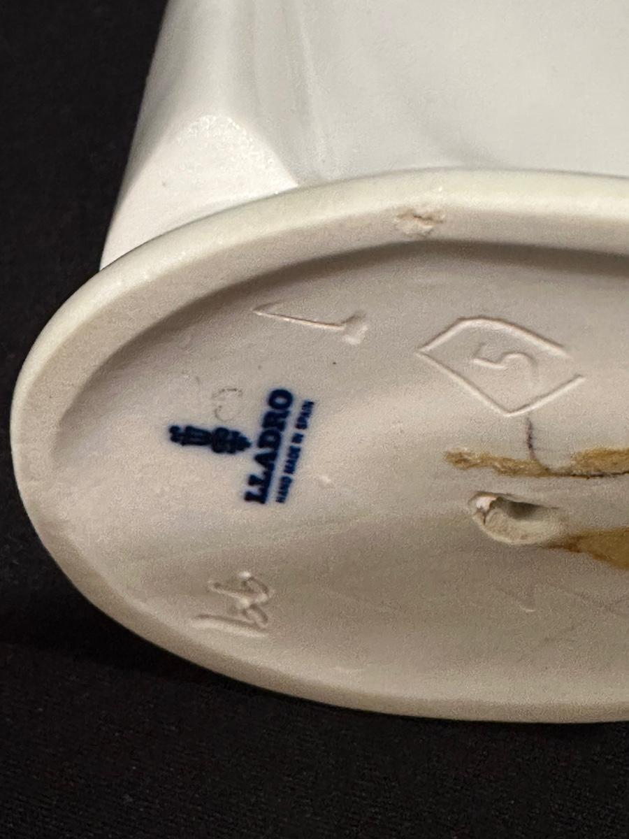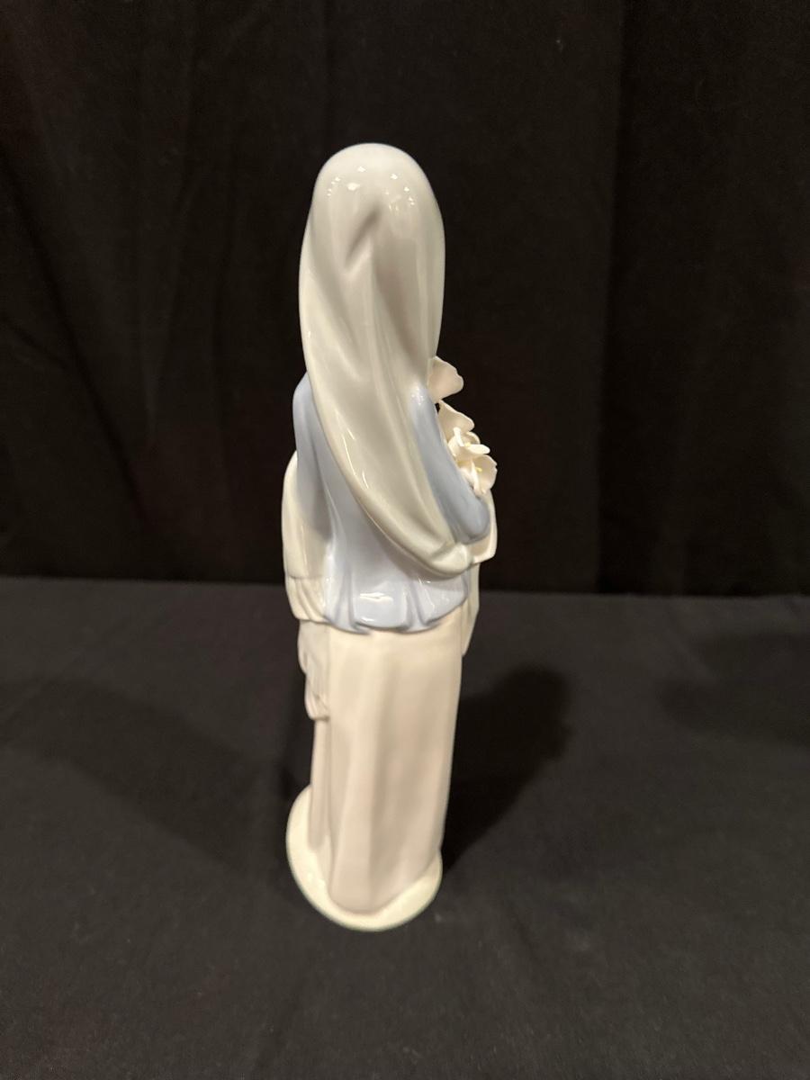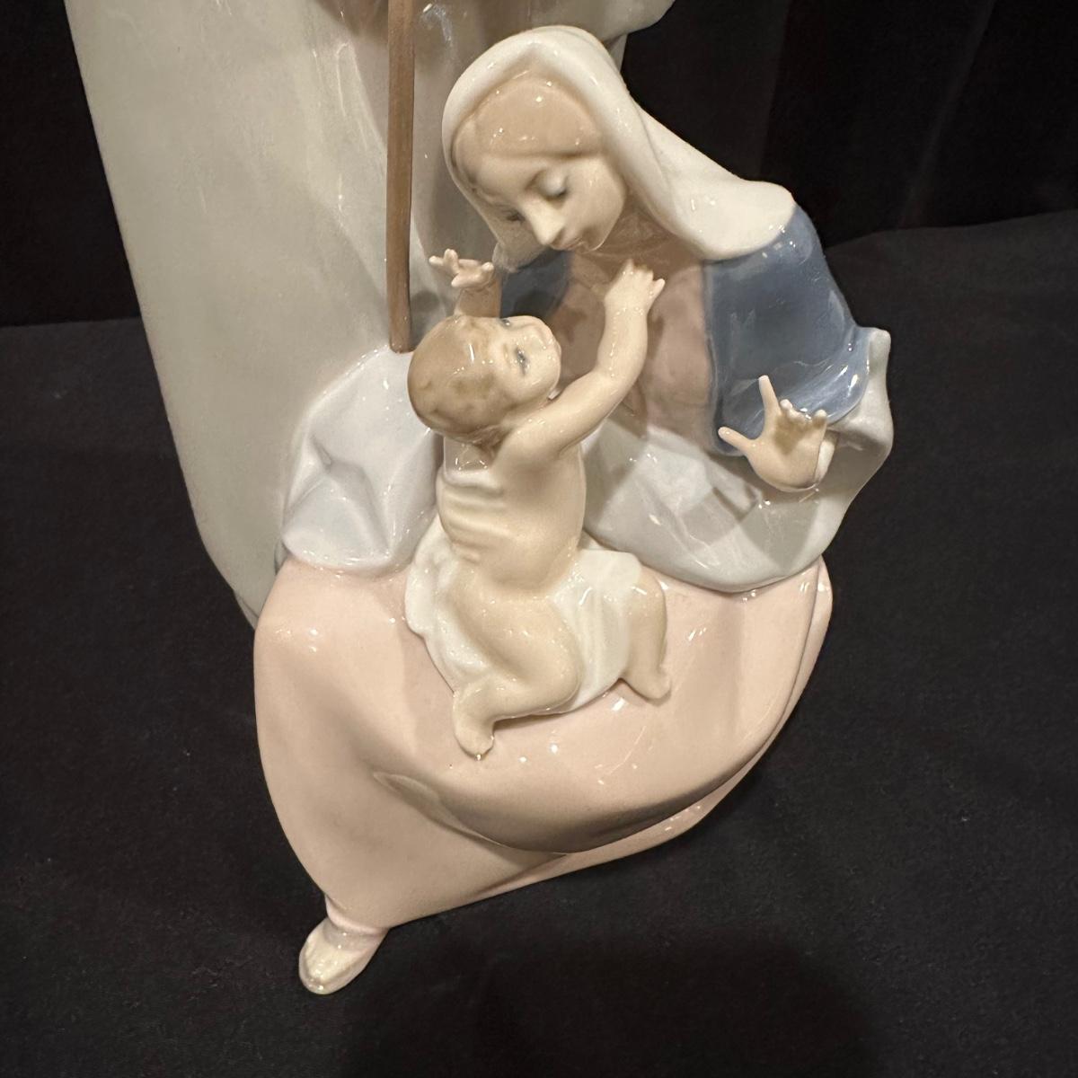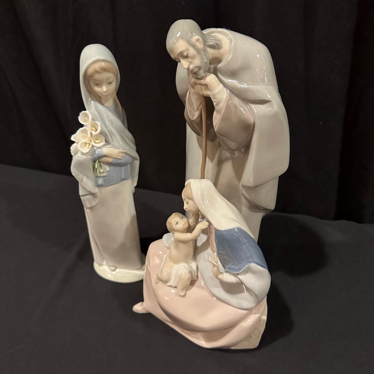 Two Lladro figurines, one of which appears to be the Blessed Family. Both figurines are marked Lladro. Another figurine of a lady with a bouquet is included; flower is chipped in the bouquet of the single figurine. All appear to be porcelain. See photo. Tallest piece measures 5" x 6" x 10.5”H. Shipping available.