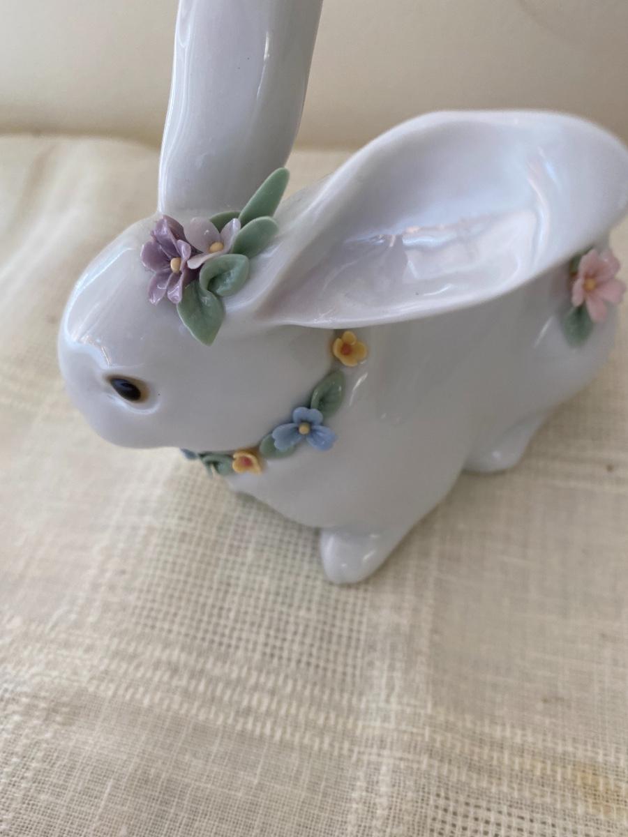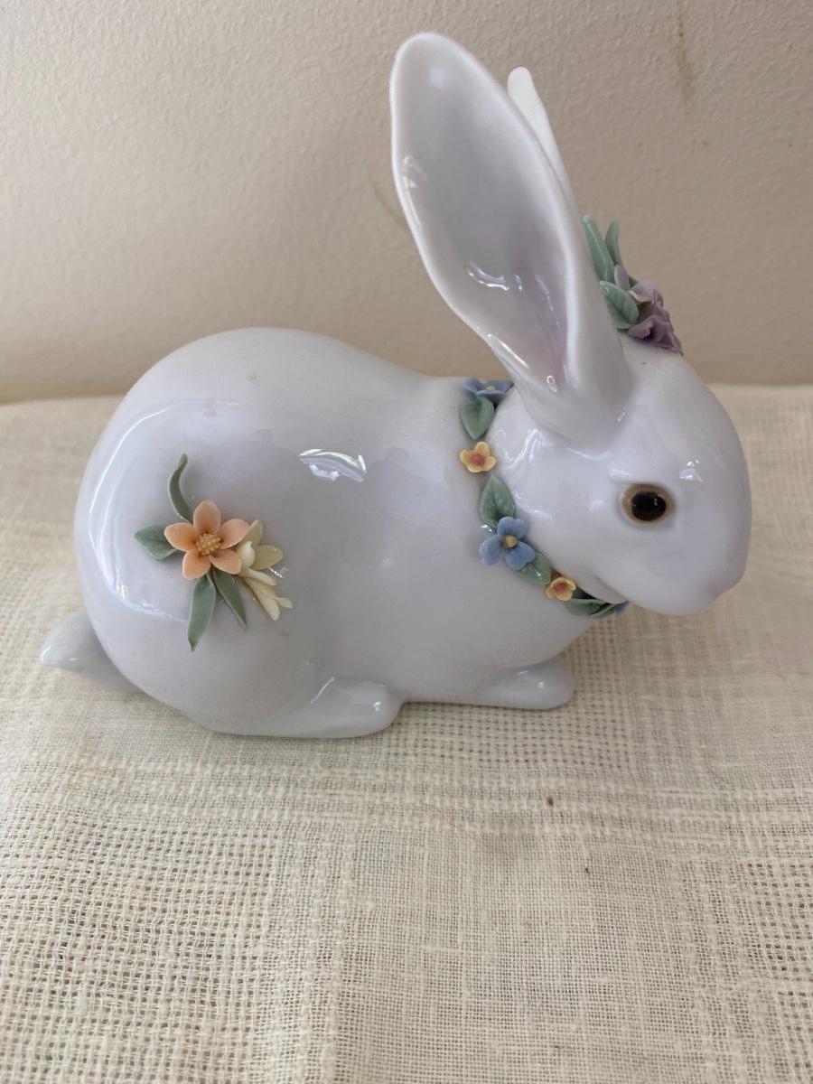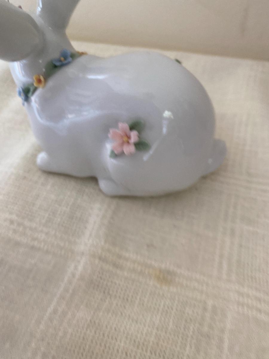 The bunny appears to be in very good condition. Includes original box. No chips to the flowers detected. It measures 5 inches long and 4 inches high. In small box in guestroom closet.