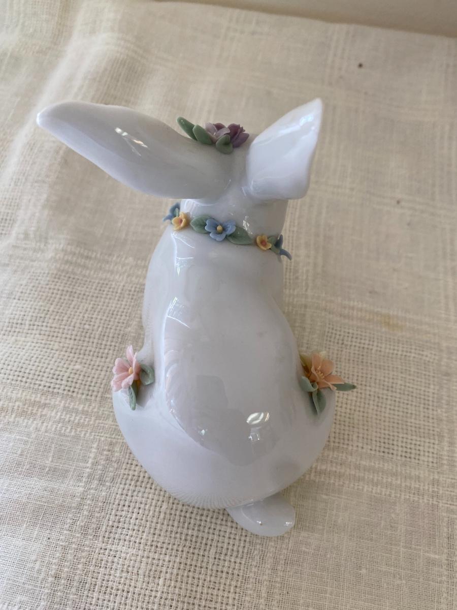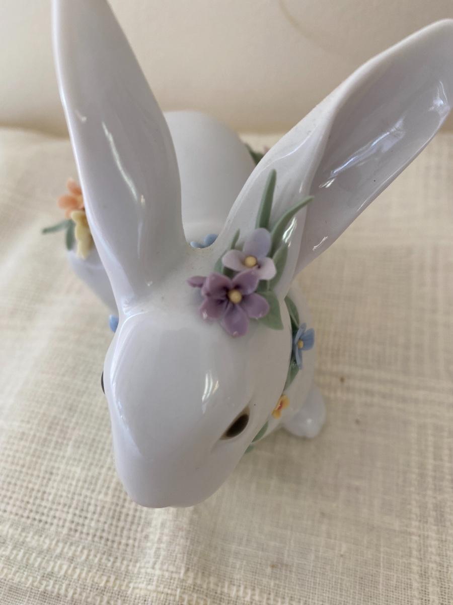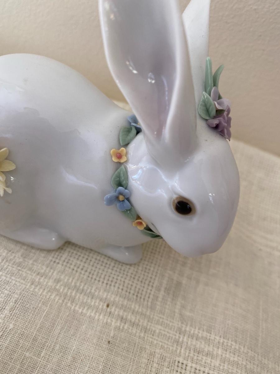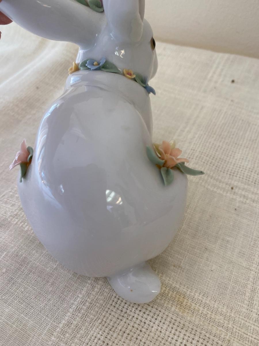 The bunny appears to be in very good condition. Includes original box. No chips to the flowers detected. It measures 5 inches long and 4 inches high. In small box in guestroom closet.