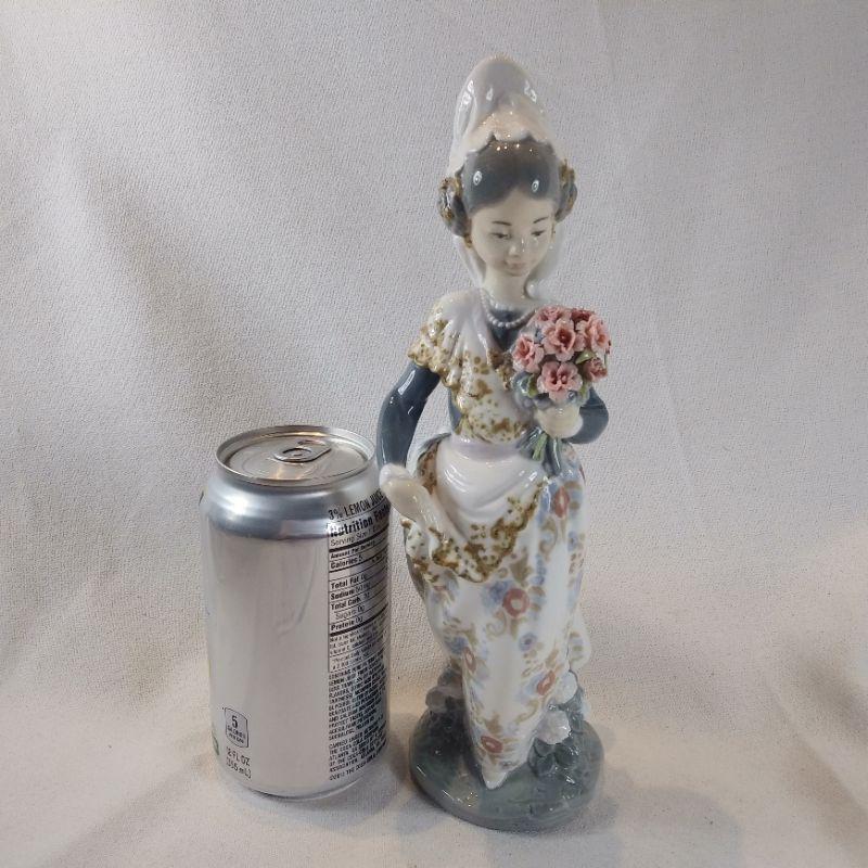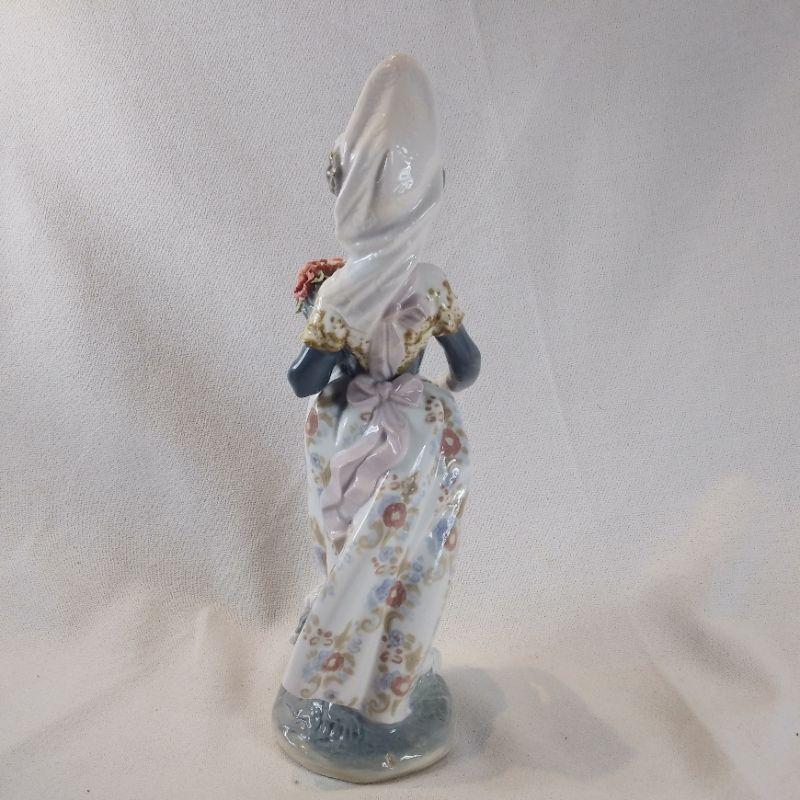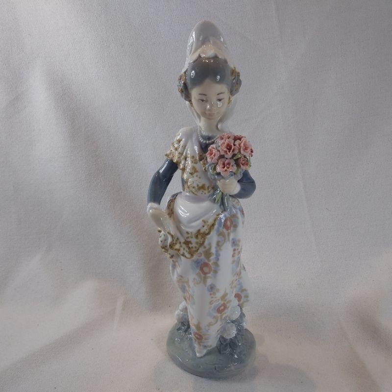 Lladro's Beautiful Spanish girl with flowers - "Daisa". Client brought back from Spain. The statue measures 10-inches tall X 3-inches in diameter. Very good condition. A nice touch for your cabinet shelf or in the boudoir. Reserve Price $20.