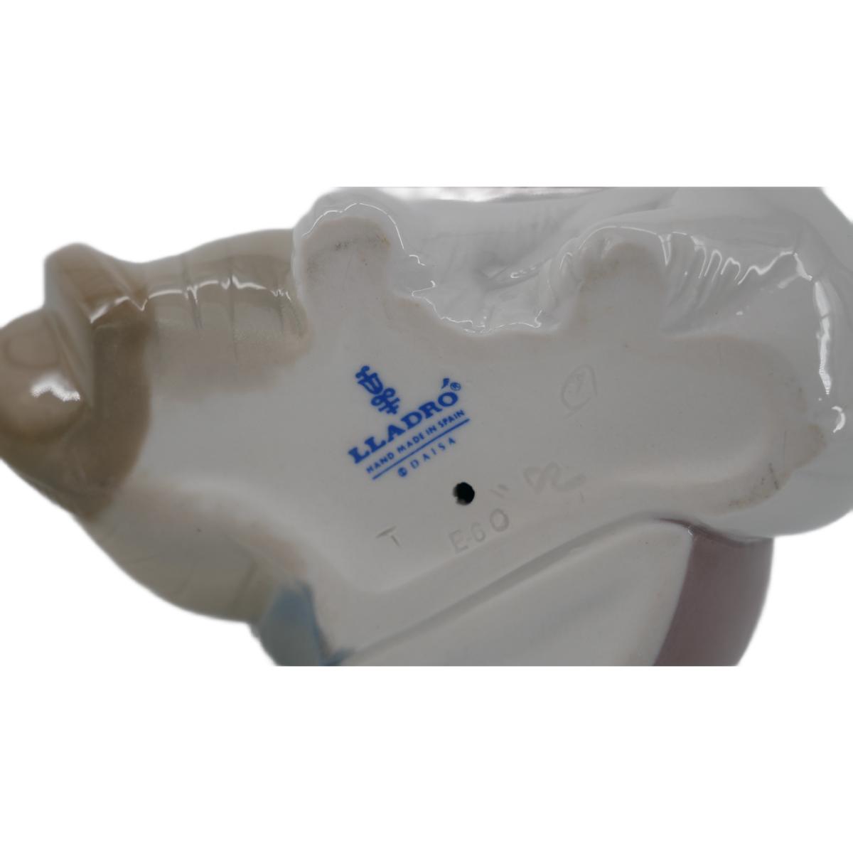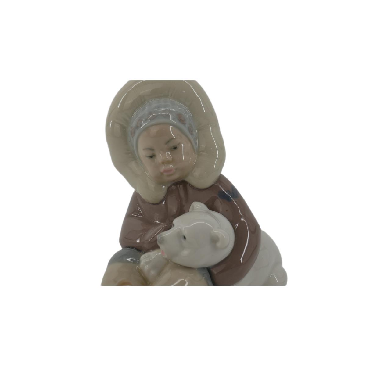 Vintage and retired Lladro Eskimo/Inuit child with polar bear cub. Made of porcelain, marked on bottom. Superb condition! Measures L 4" x H 5" x W 3". Weighs 9 oz. (C75)