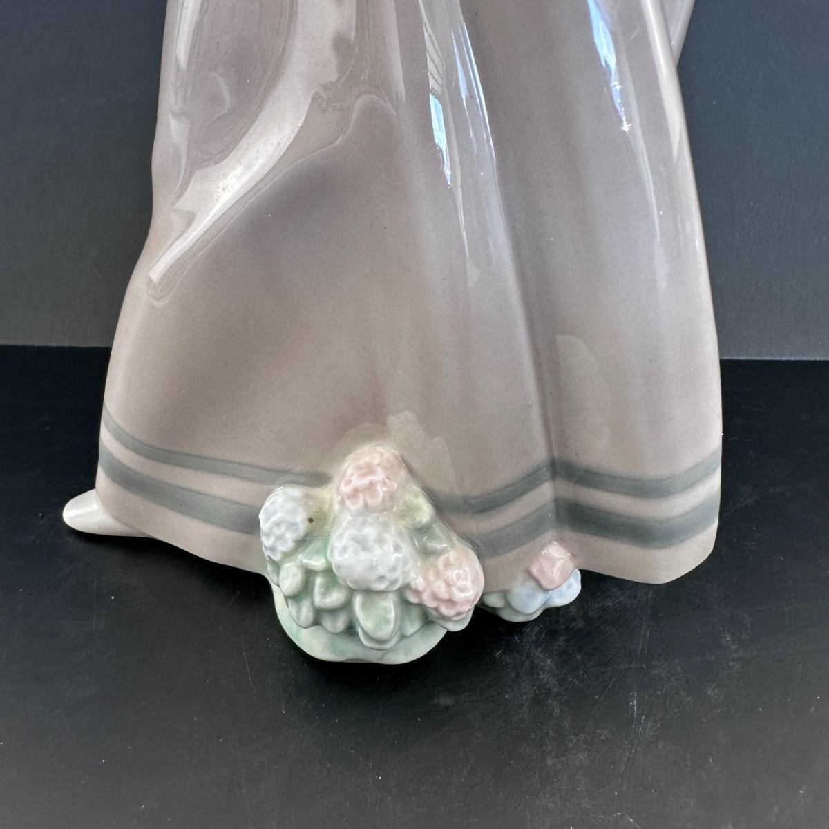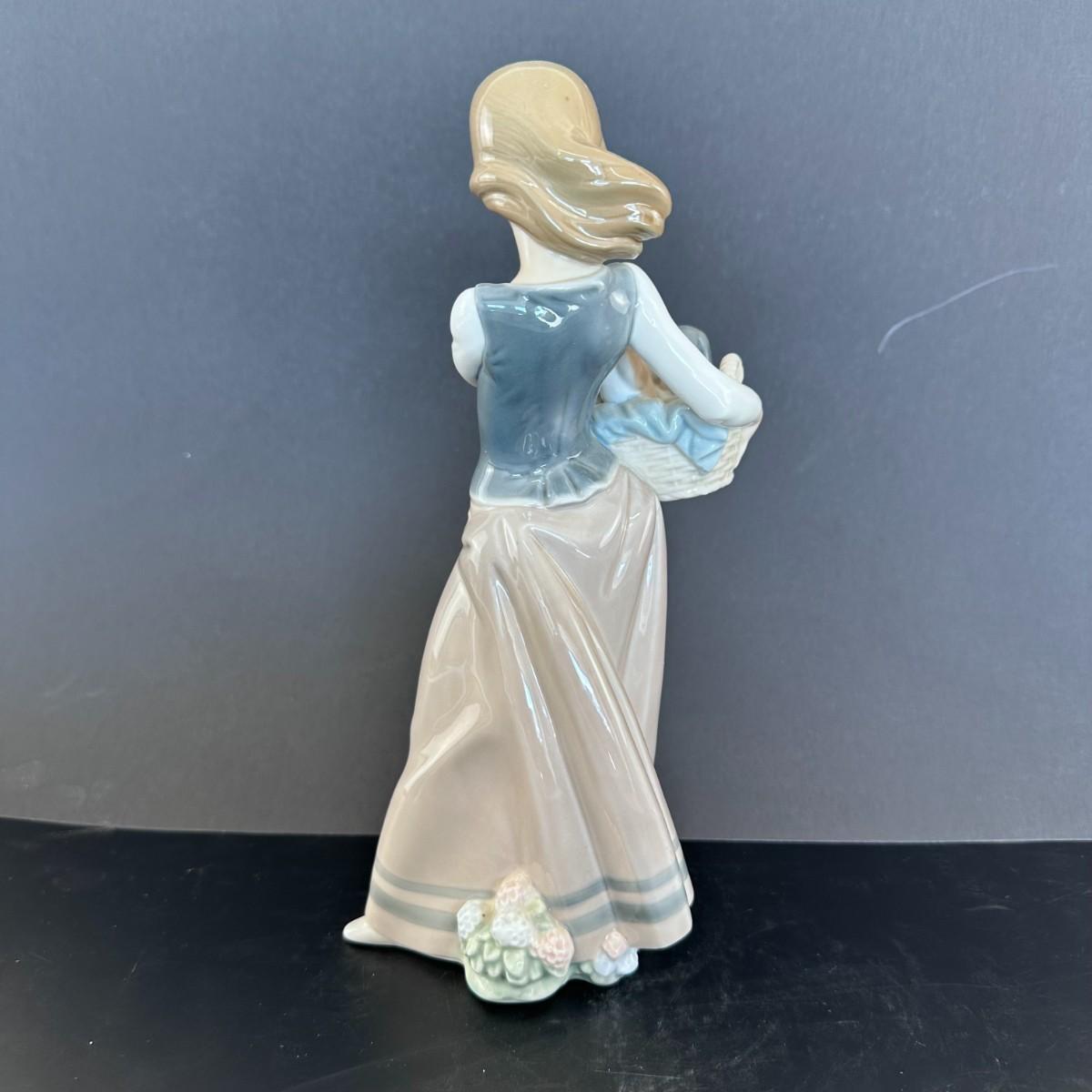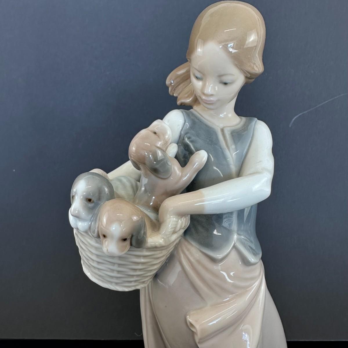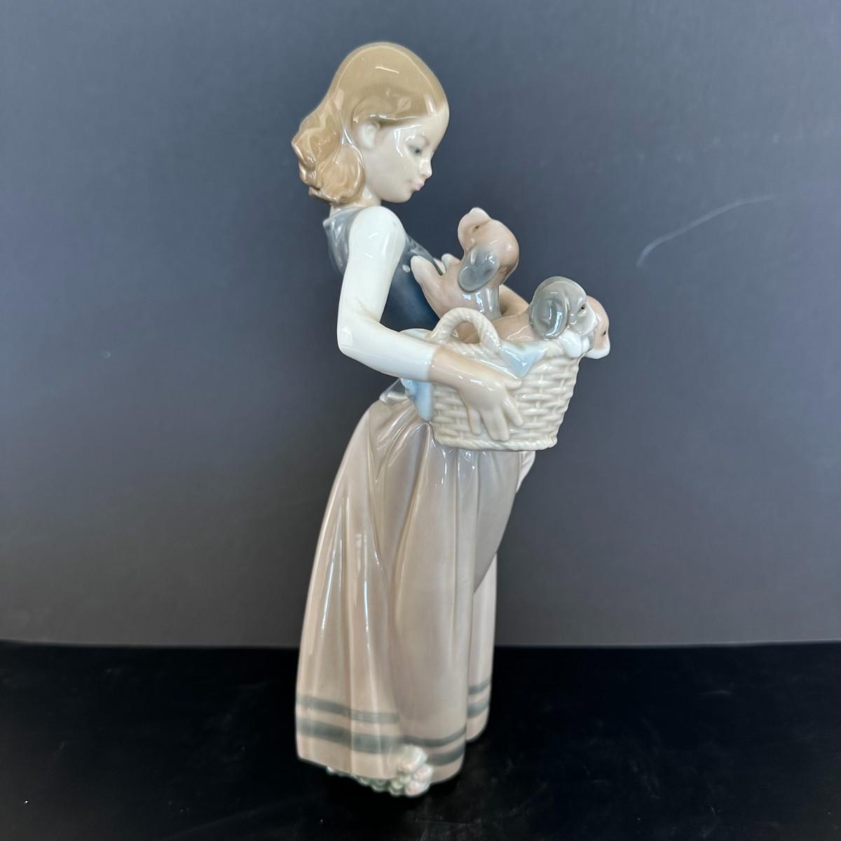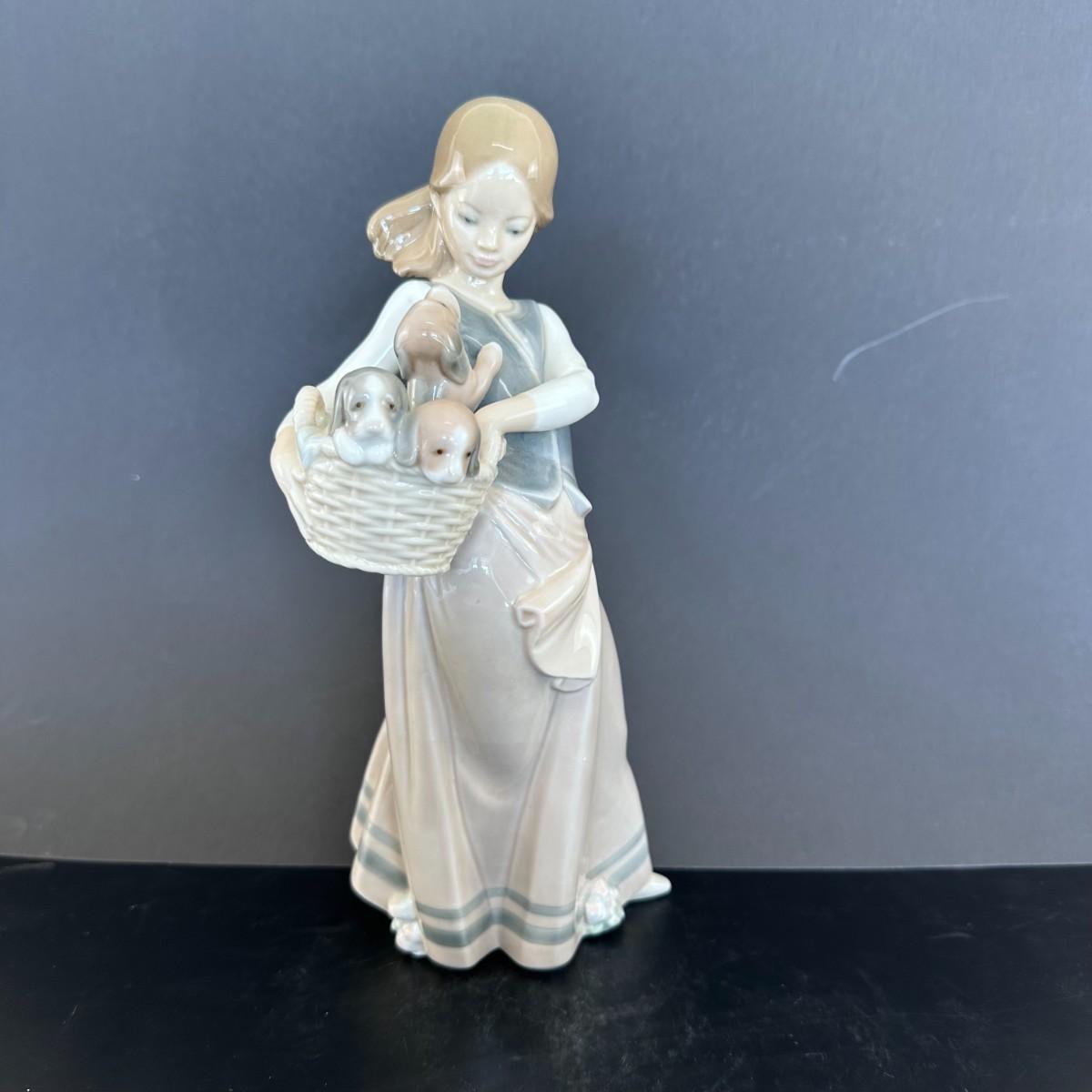 Description: Lladro figurine number 1311 is titled "Little Dogs on Hip" and it depicts a standing young girl with several adorable puppies in her basket. The figurine beautifully captures the heartwarming interaction between the child and the young animals. The glazed finish highlights the soft details of the girl's expression and the endearing poses of the puppies.